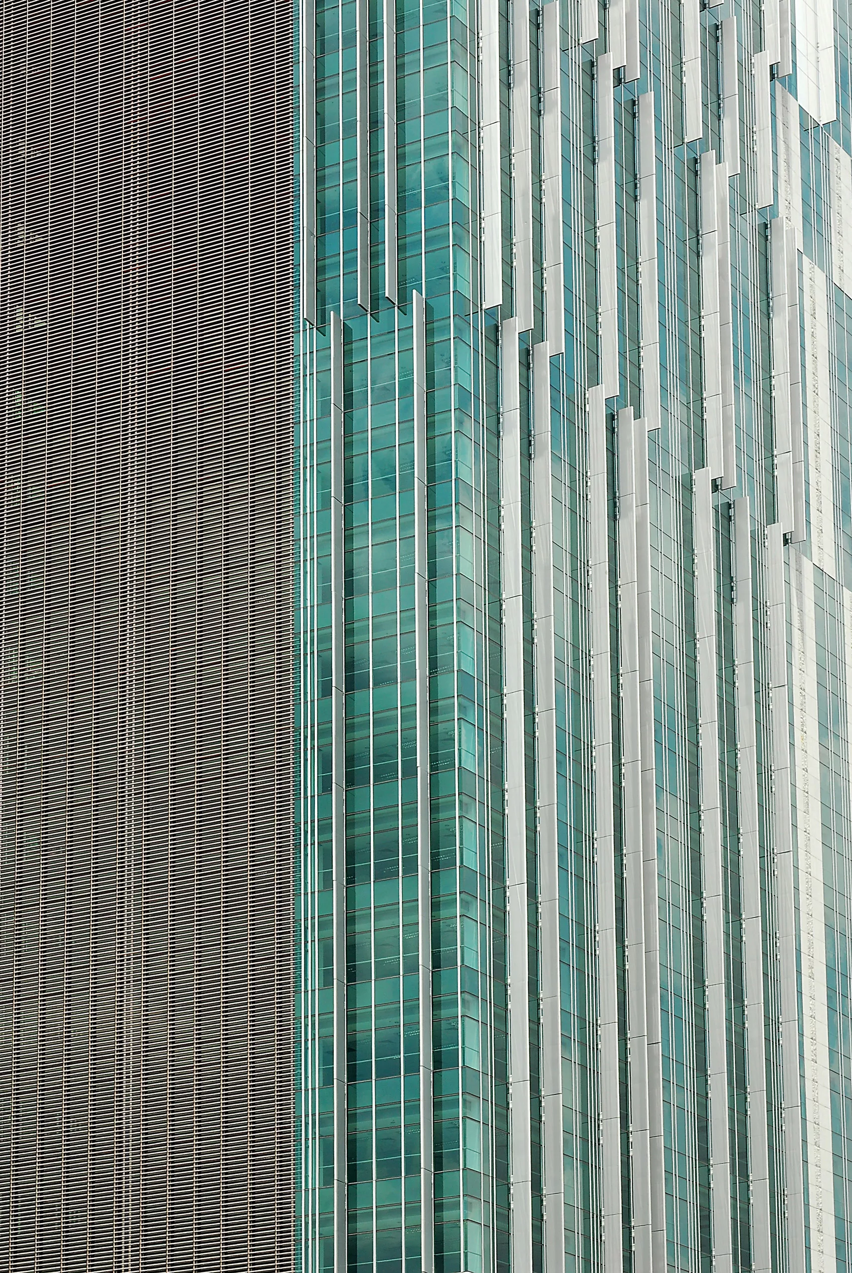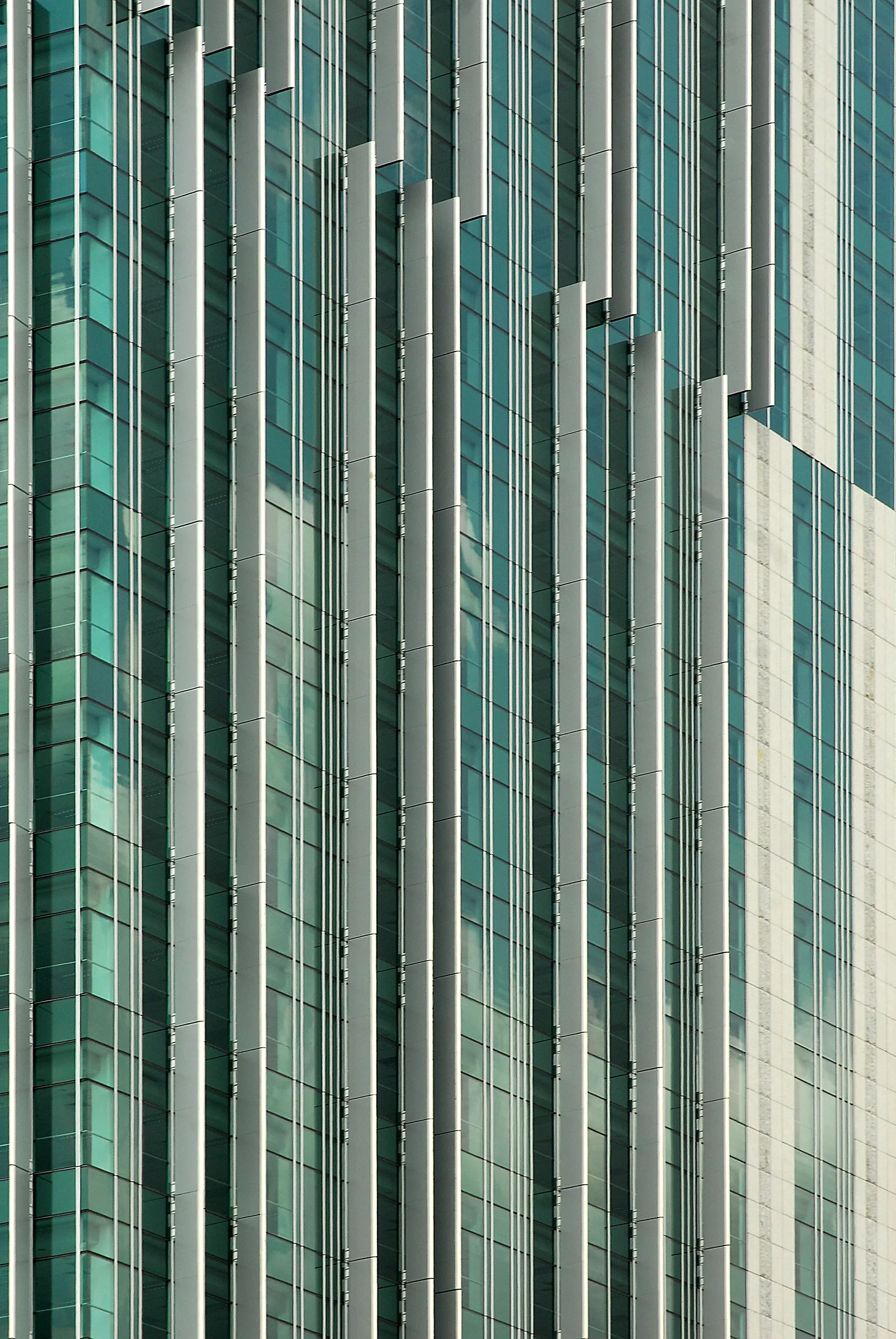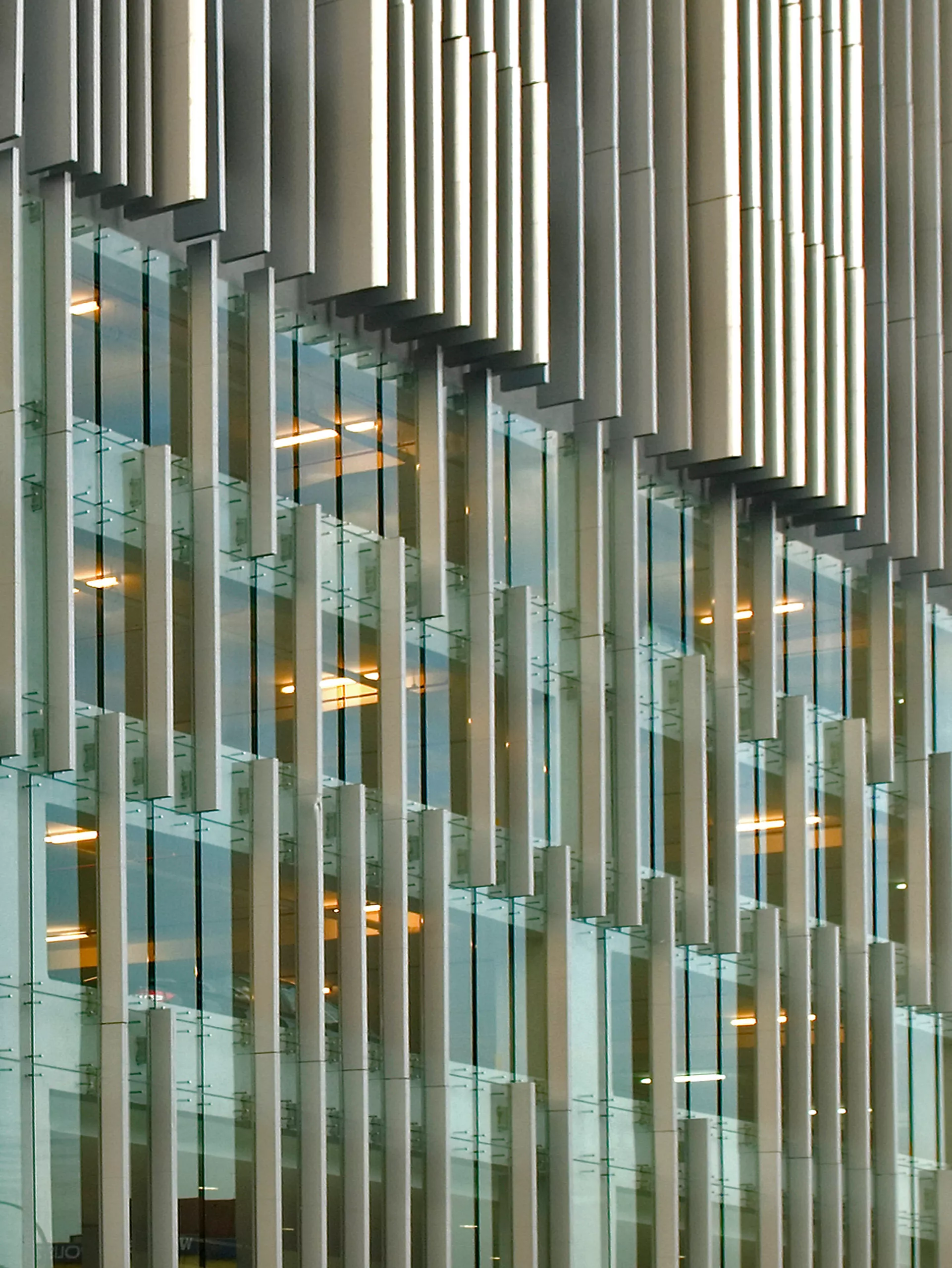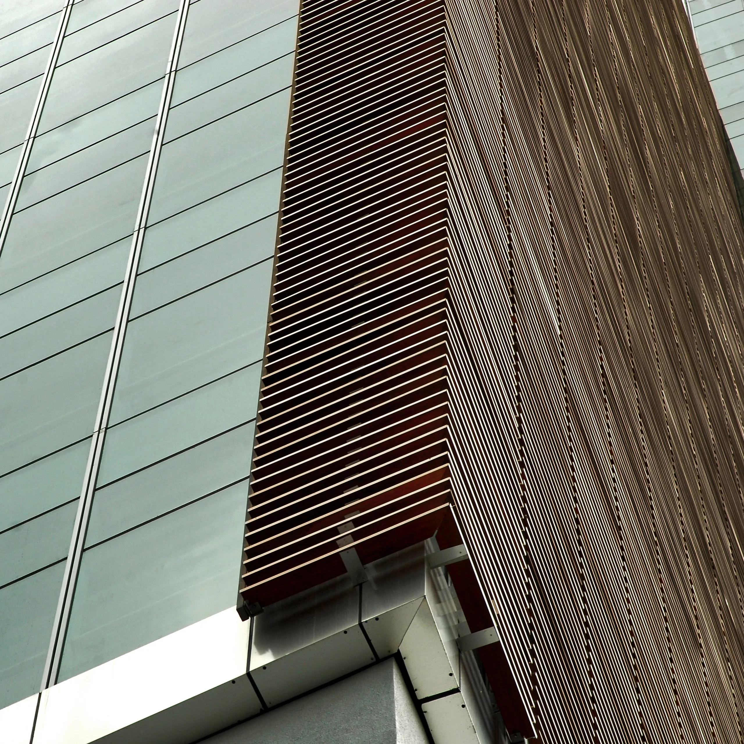 The architectural language continues at the podium, where a series of modulated fins negotiate the transition between the office tower above and the car park structure below. Along the western frontage, these aluminum elements disperse into a shimmering, light-catching surface, forming a distinctive arrival sequence that anchors the building’s main entry point and enriches its urban interface.