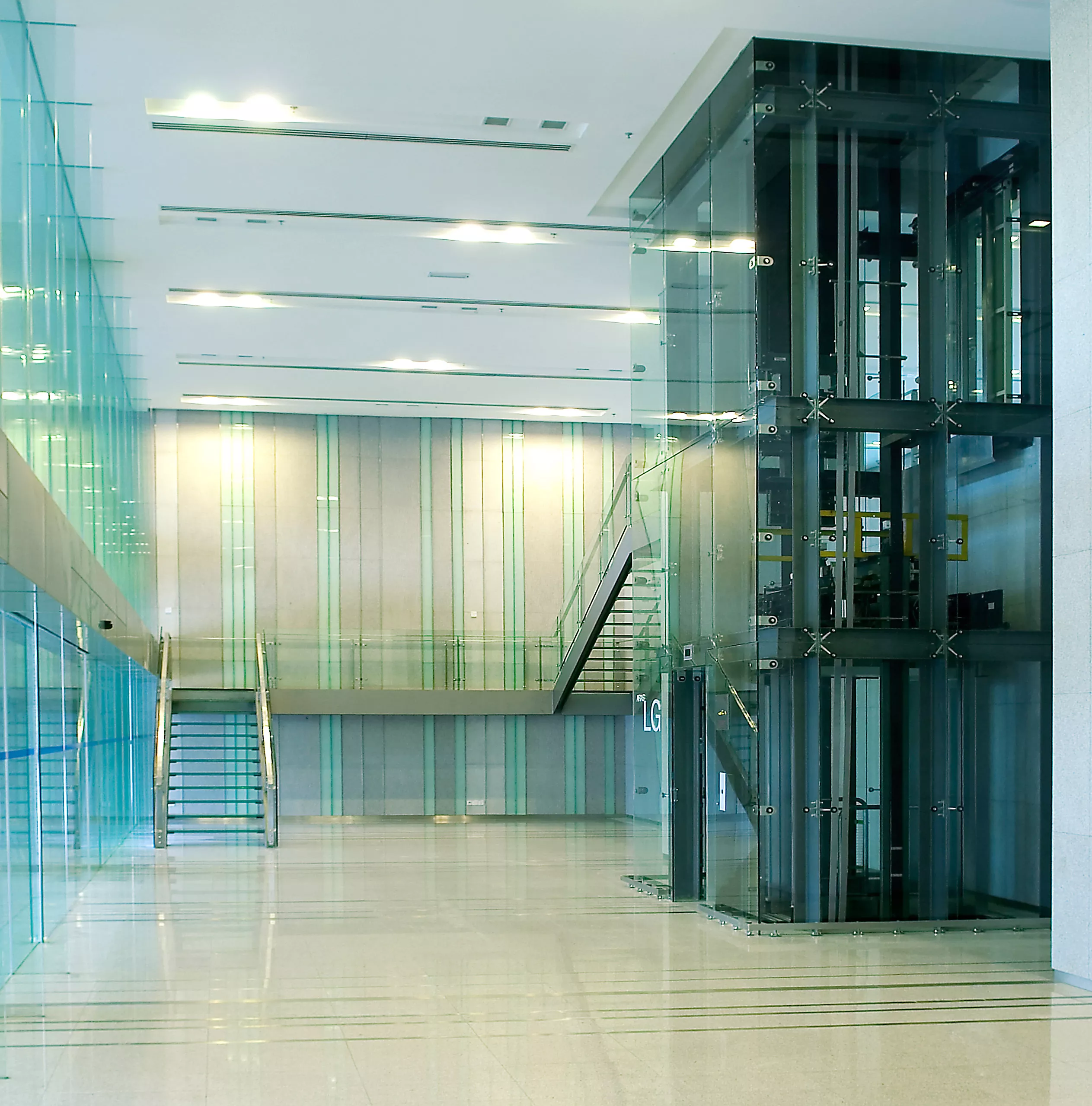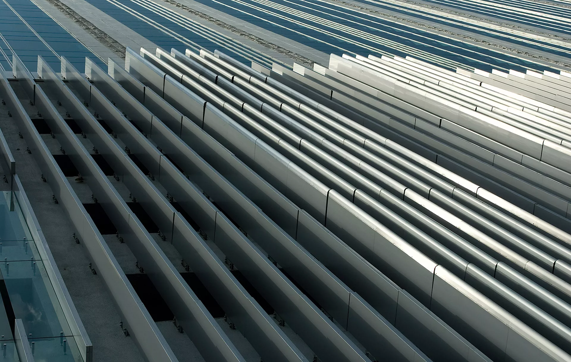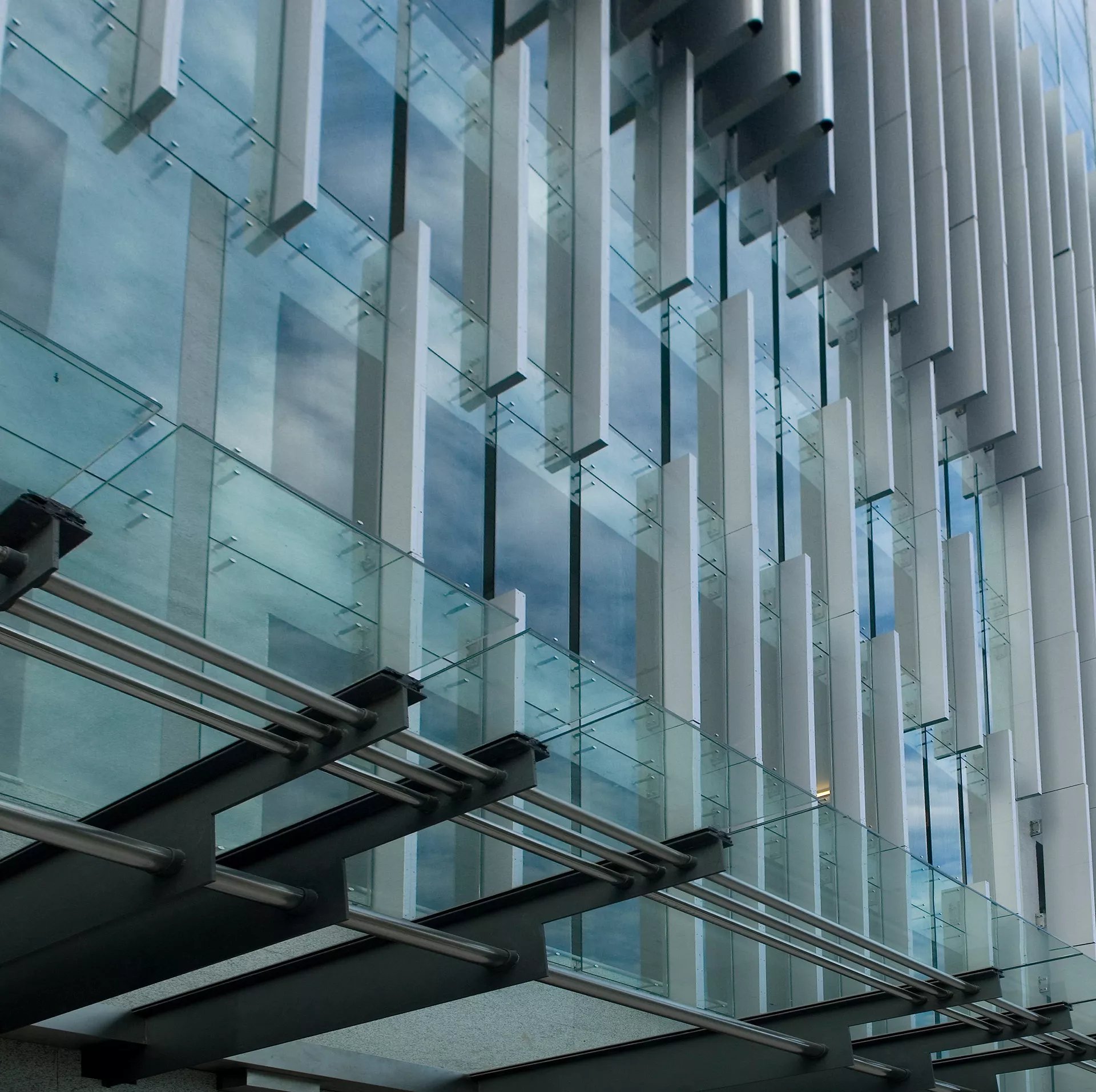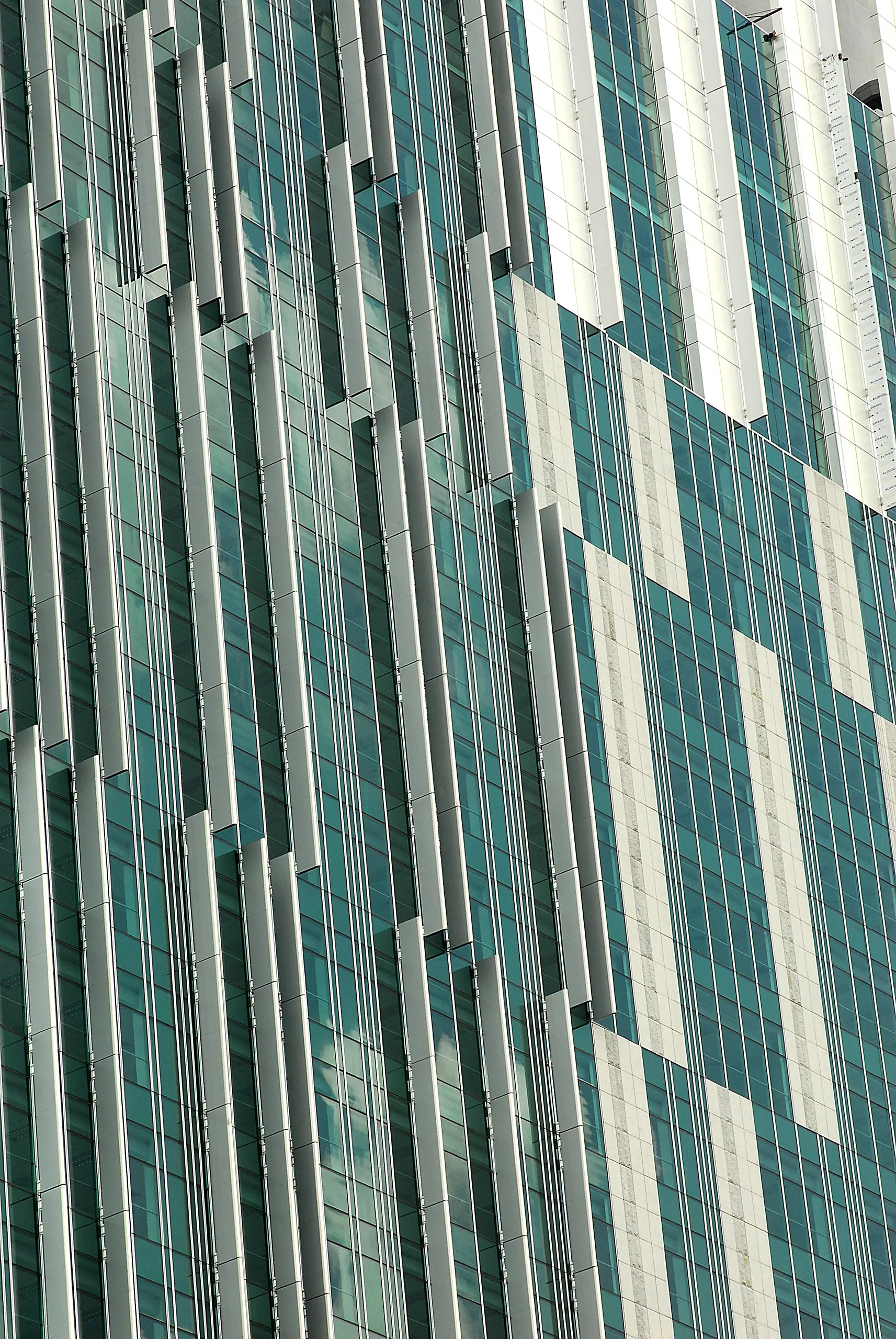 The architectural language continues at the podium, where a series of modulated fins negotiate the transition between the office tower above and the car park structure below. Along the western frontage, these aluminum elements disperse into a shimmering, light-catching surface, forming a distinctive arrival sequence that anchors the building’s main entry point and enriches its urban interface.