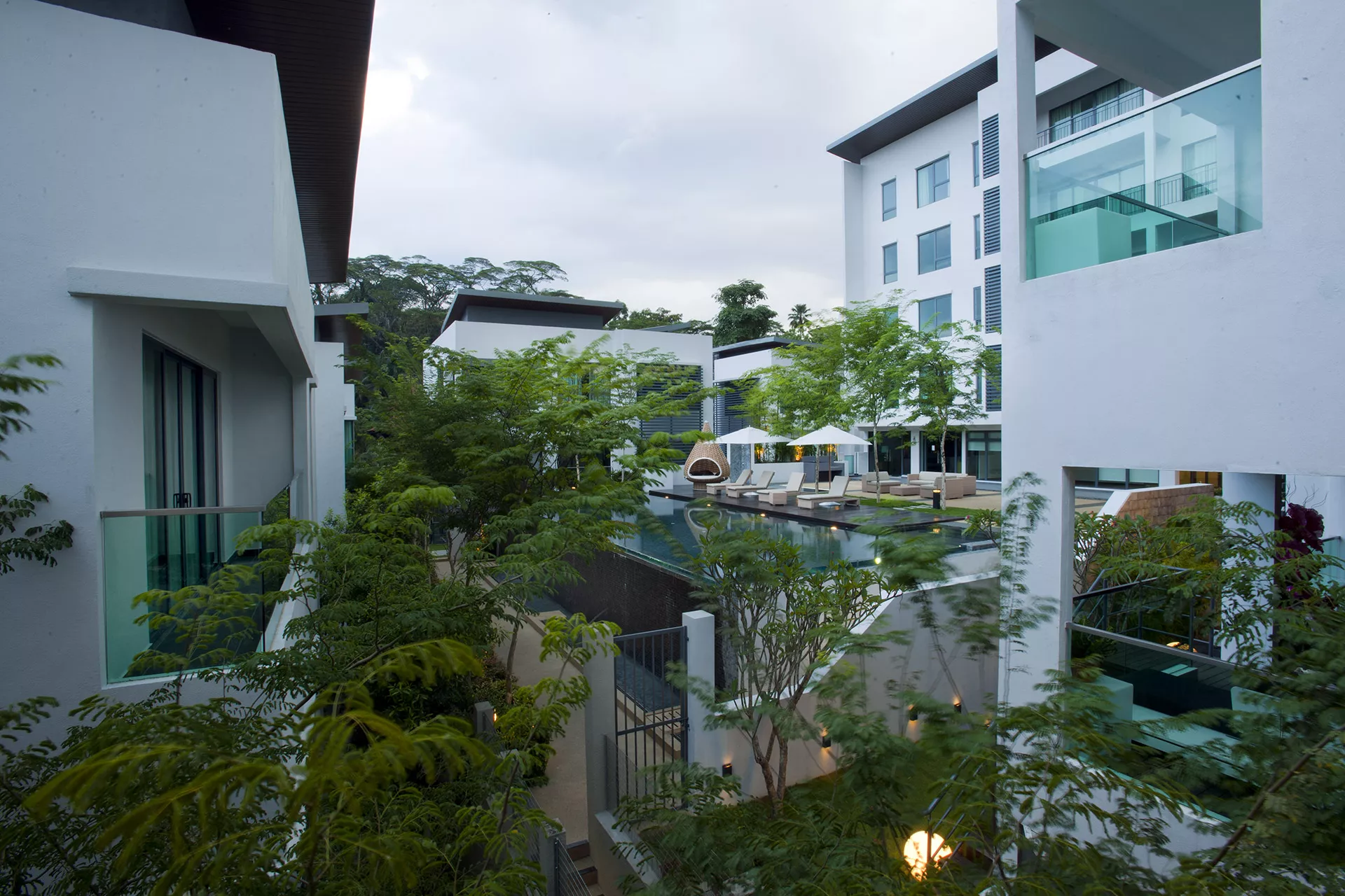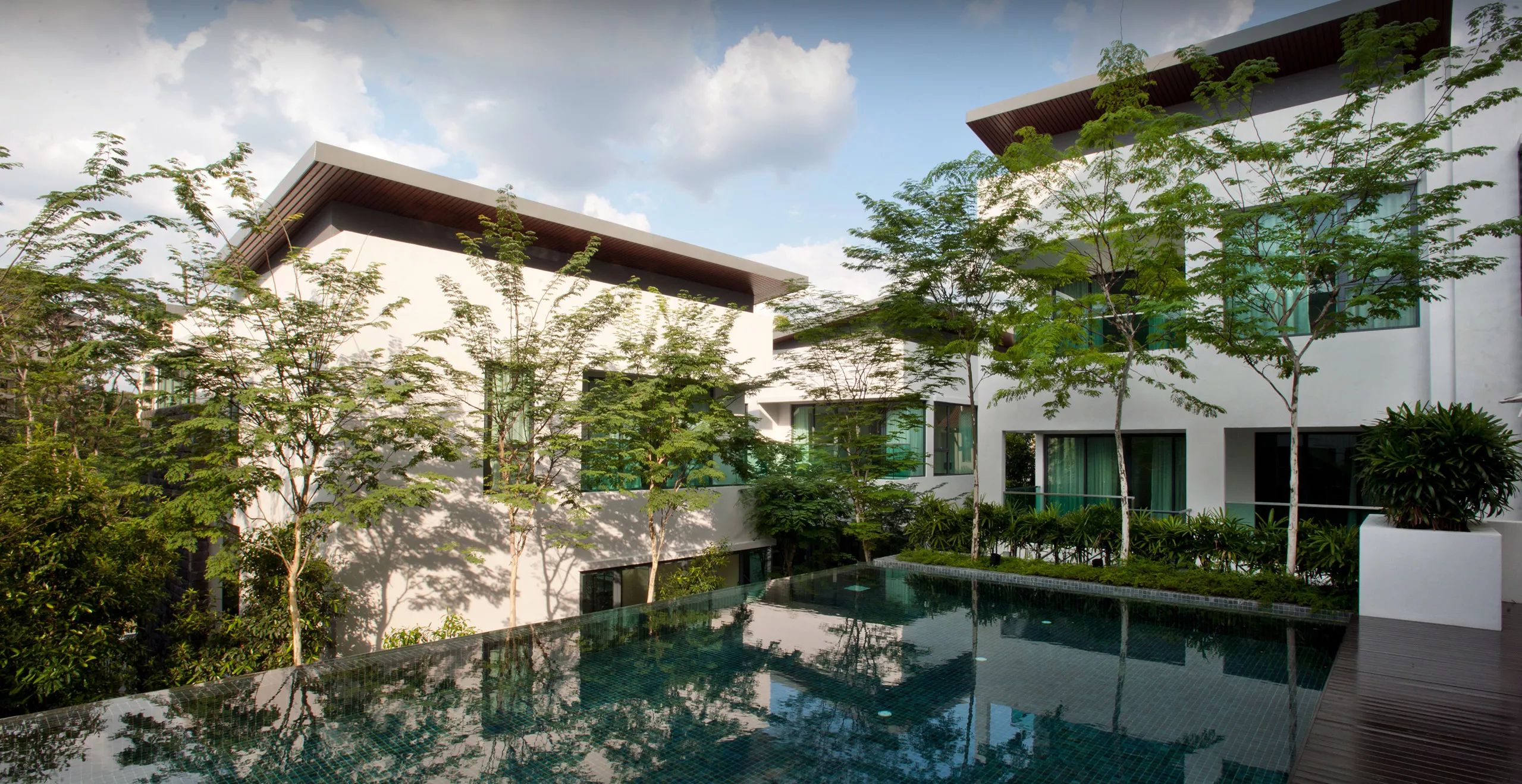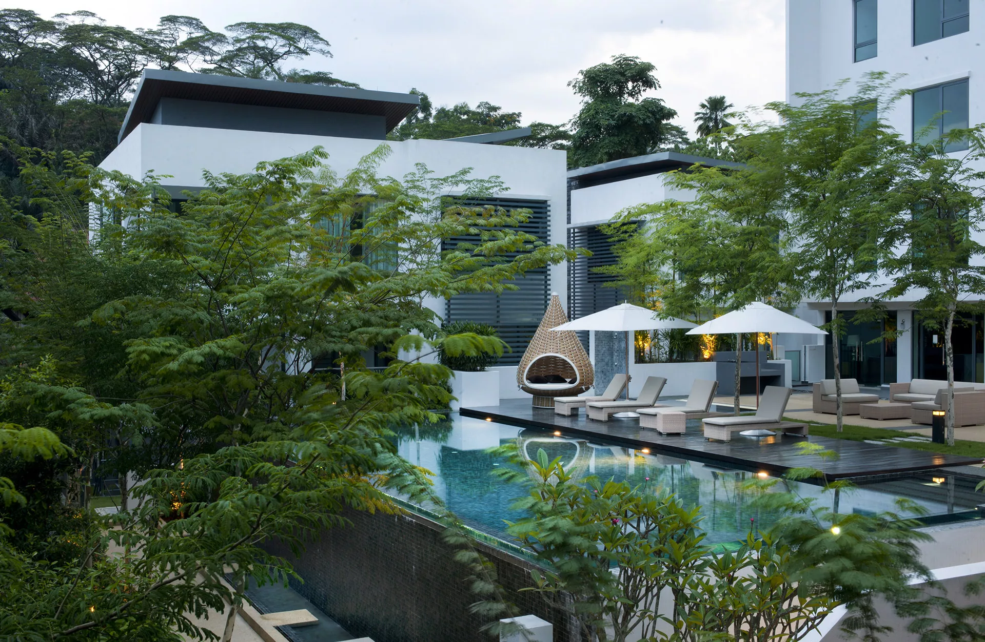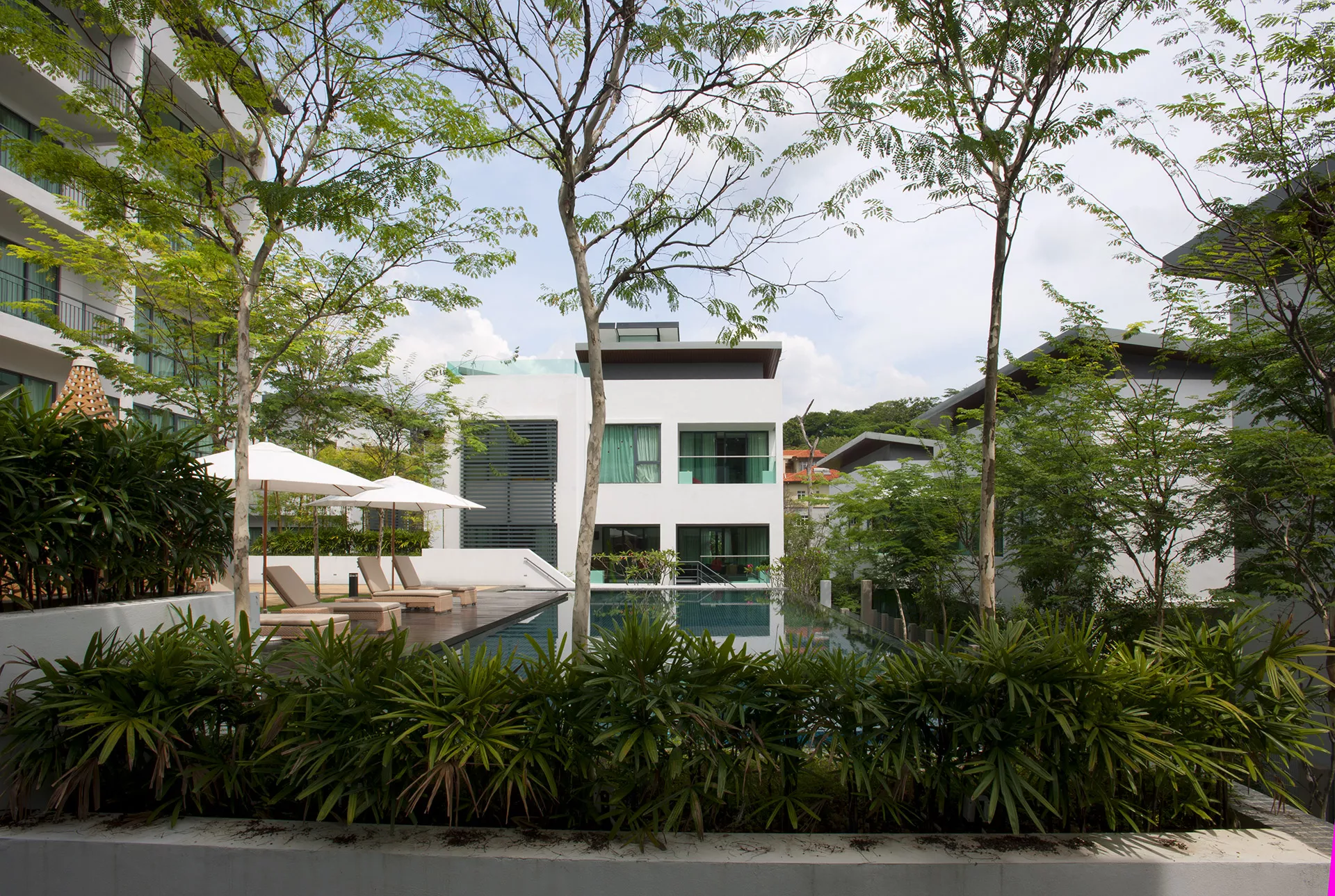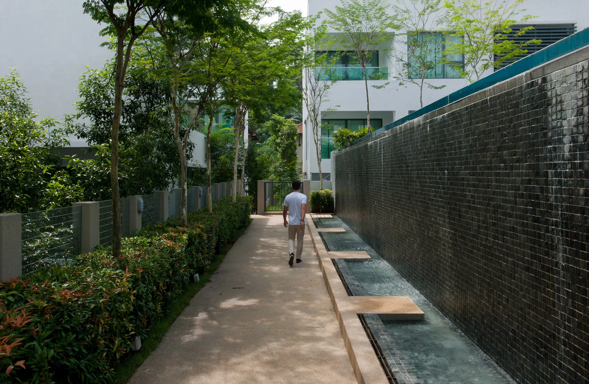 The heart of the development features a striking swimming pool with a water weir, framed by a cascading landscape that artfully responds to the site’s natural topography. Perimeter greenery is enhanced with cascading planter boxes that reclaim green space previously occupied by caisson retaining walls, offering a seamless blend of engineered structure and natural elements. This careful layering of softscape and structure results in a serene and intimate environment where nature is woven into every corner of the design.