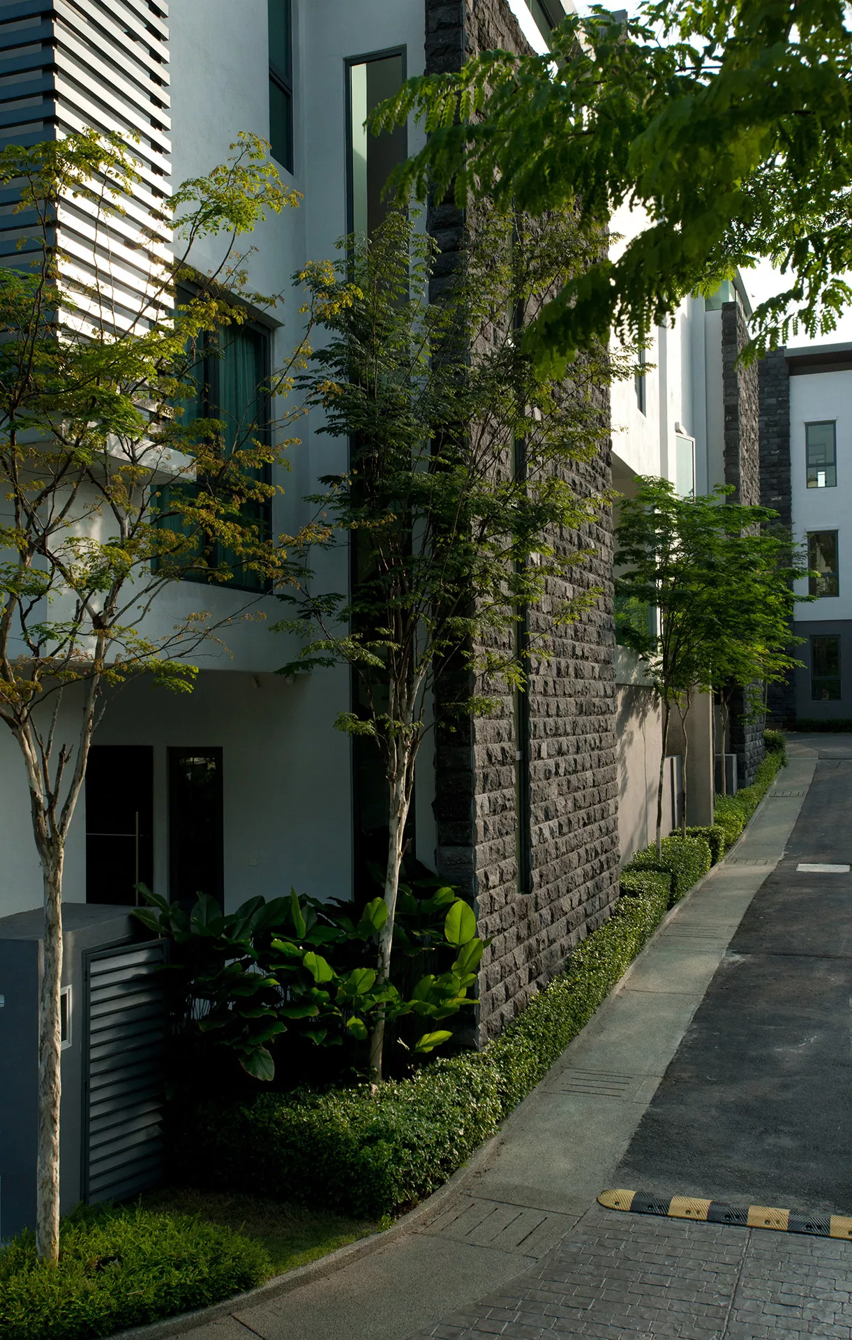 Complementing the architectural design is the landscape that plays a central role in shaping the character and ambience of this exclusive bungalow development. Despite the site’s compact footprint, green spaces are thoughtfully integrated throughout, offering a lush and cosy garden experience. All sideways and perimeter areas are maximized with green patches, ensuring every view from within the site is softened by greenery. Each bungalow is complemented by tree clusters and vertical climbers along walls and fences, creating a consistent green backdrop for every home. The landscape design embraces a modern contemporary style, harmonizing with the architectural language of the residences.