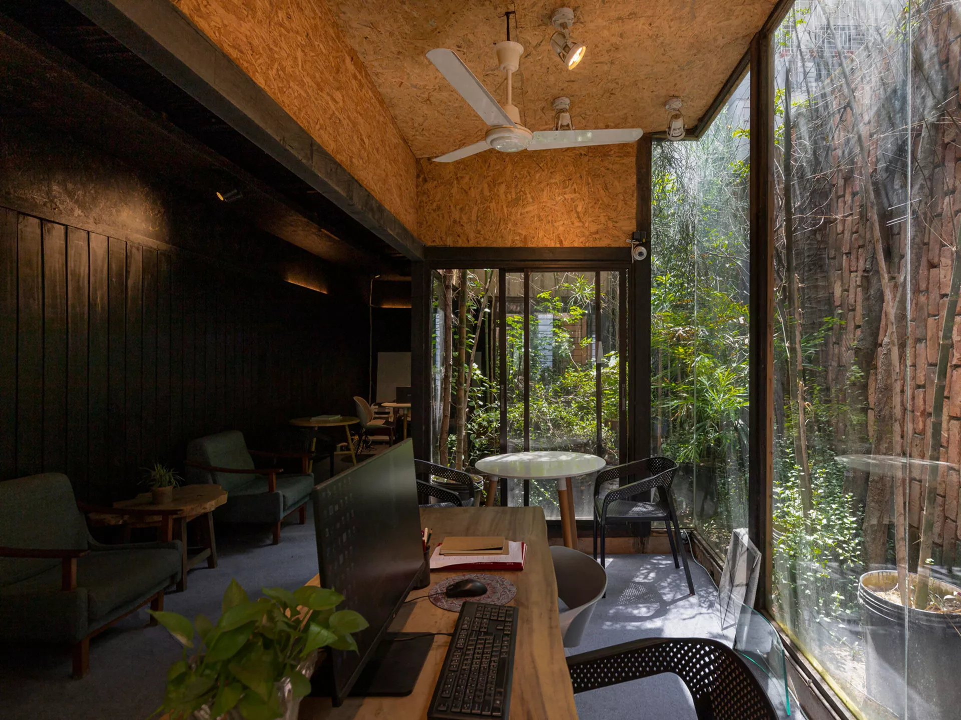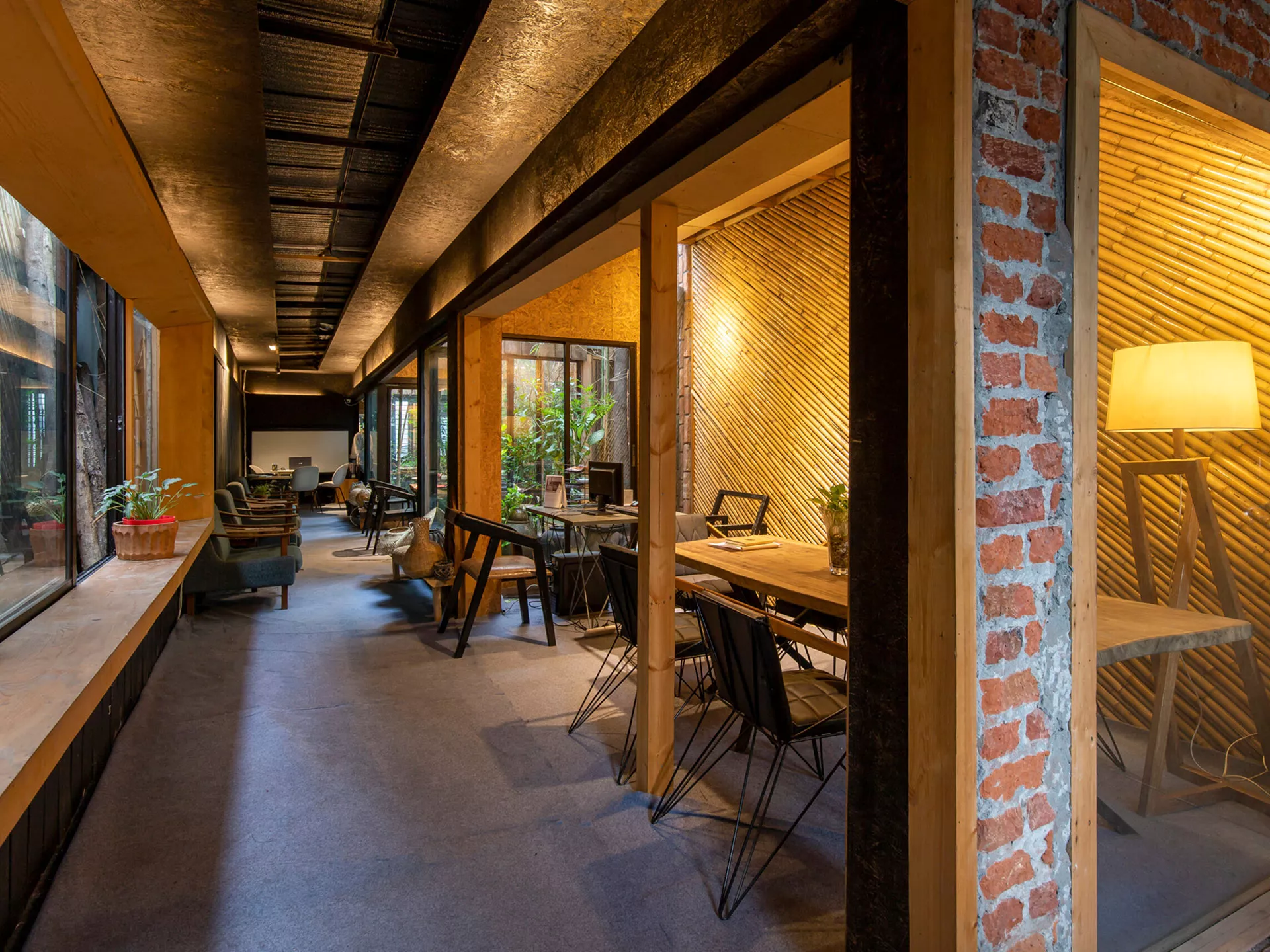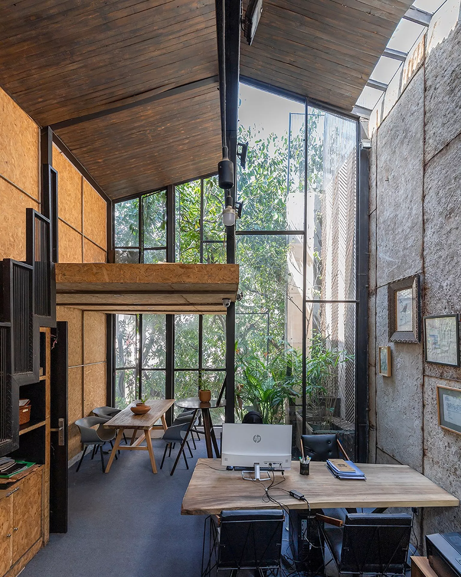 The studio is organized into two distinct zones: a public collaborative floor and a secluded mezzanine above. The mezzanine operates as a contemplative design studio, sheltered yet visually connected to the activity below. Overlooking the main workspace, it maintains both privacy for conceptual exploration and a sense of collective continuity. Throughout, natural materials, passive cooling, and a north–south orientation reinforce the project’s commitment to sustainable, responsive design.