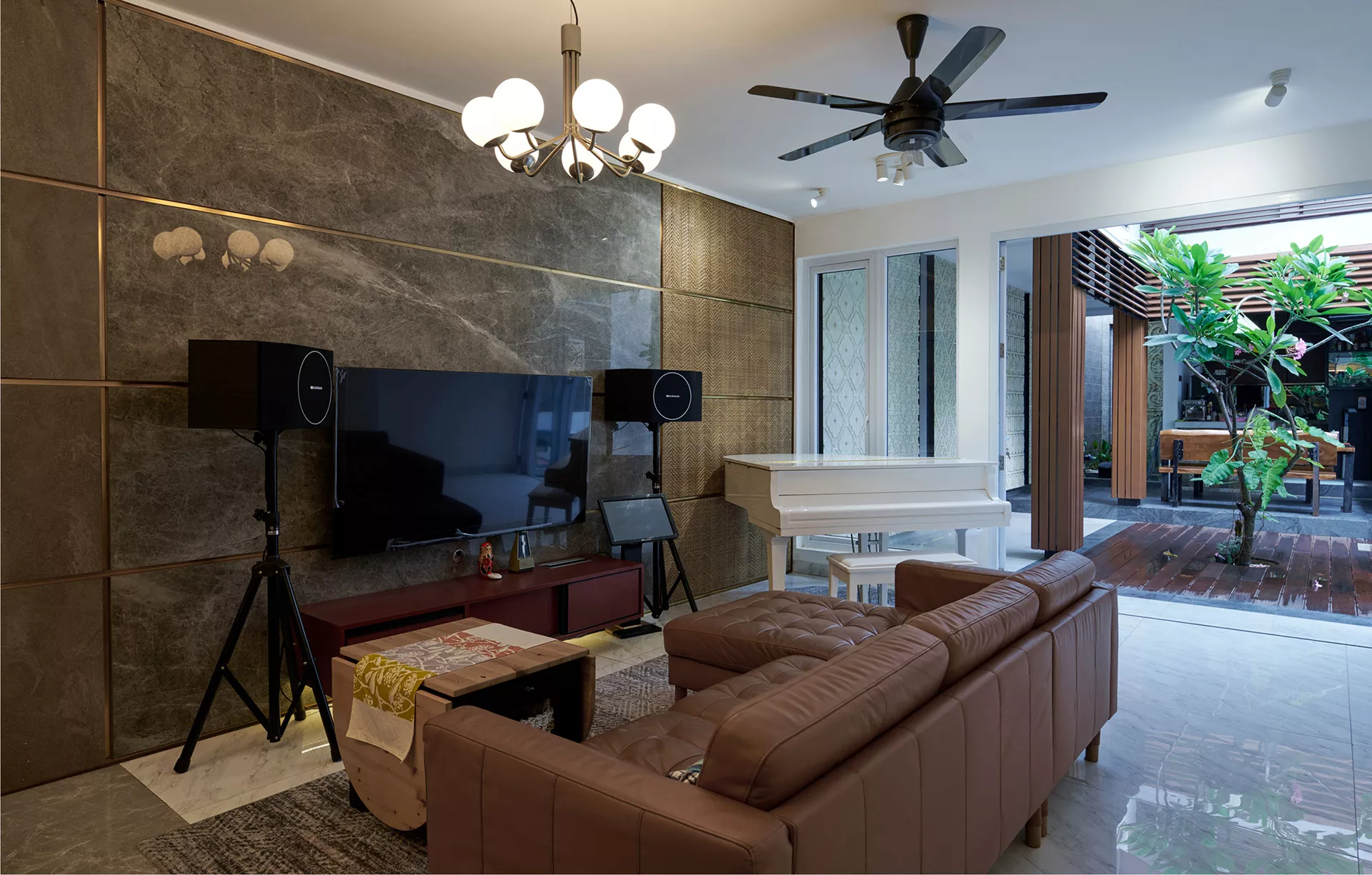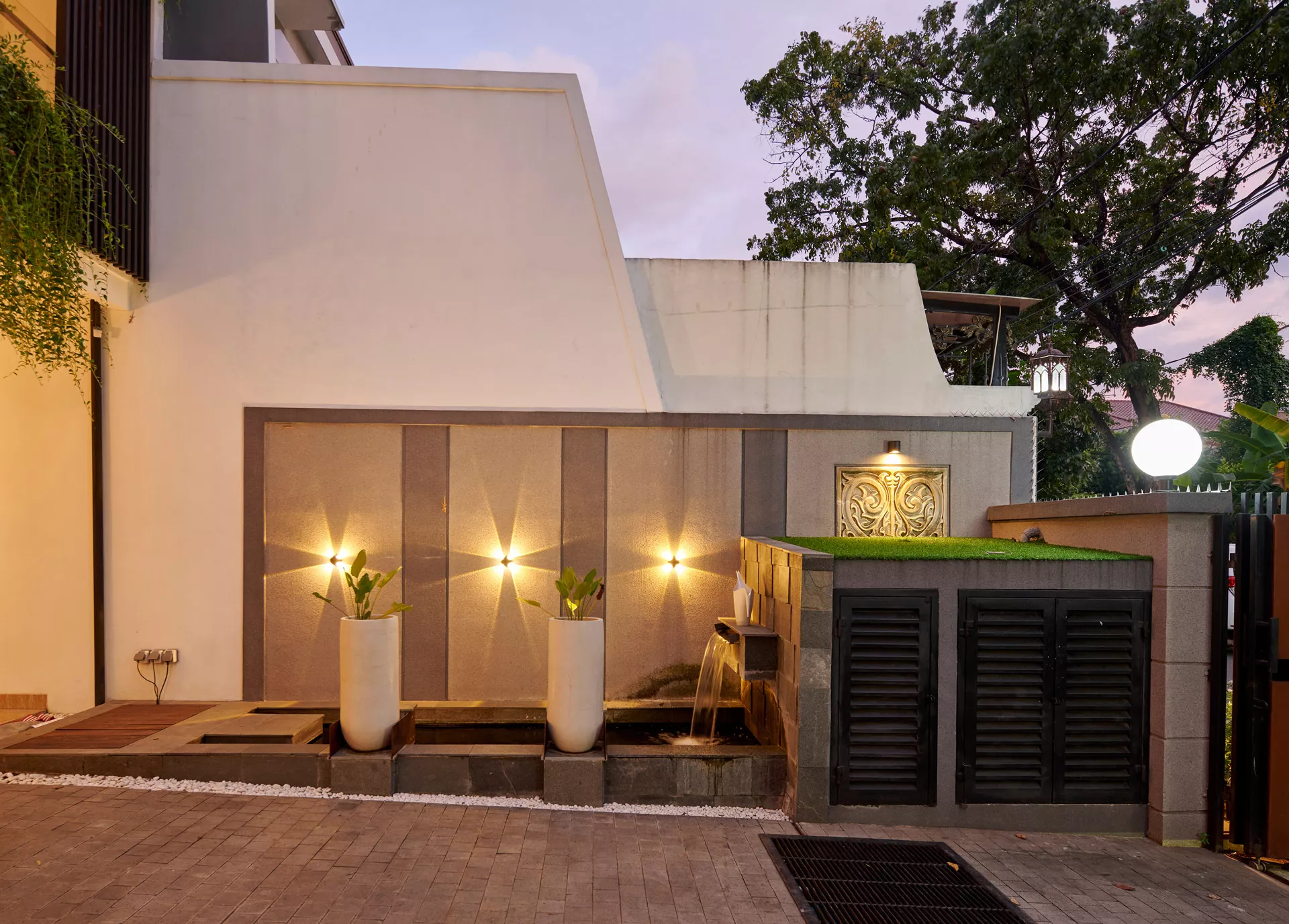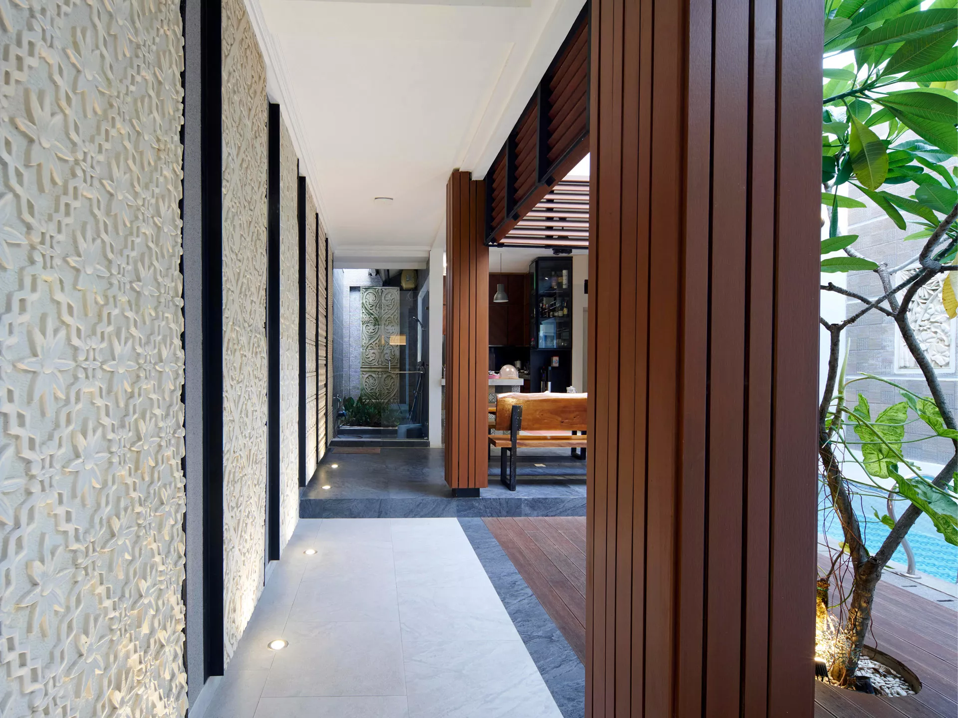 The front yard features a tranquil fish pond, framed by stone carved walls that add textural depth and serve as visual focal points. Lush plantings soften hard edges and guide circulation between the wings of the house. The visual connection between the living spaces and garden elements is carefully orchestrated, enhancing the home’s openness and sense of retreat.