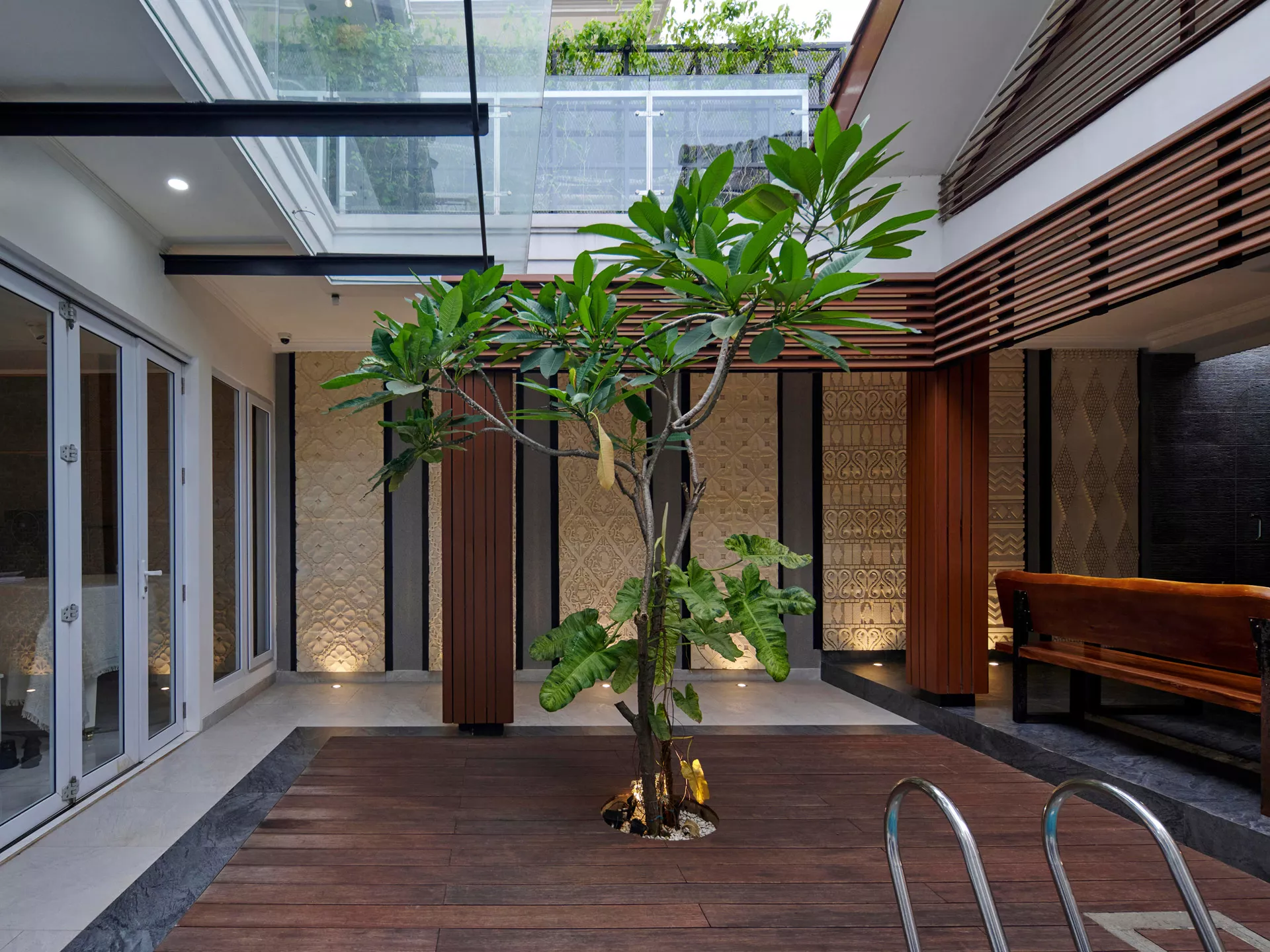 The landscape design transforms the home into a green urban sanctuary. At its core, a central courtyard with a shimmering swimming pool anchors the layout, inviting natural light and cross-ventilation. A roof garden with timber decking offers a serene escape above the bustling city, while a semi-outdoor gym beneath a membrane roof connects daily life with nature.