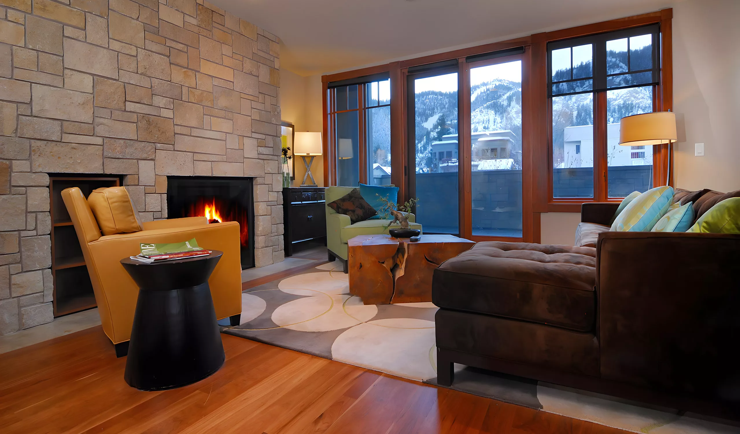 The interior of the units balances the focus on the fireplace in the room and sweeping views of the surrounding areas seen through the windows. The refined wood interior, real wood floors and honed natural stone provide the continuity of expression with the exterior rustic materials while offering an elegant background for a sophisticated resident. Custom carpets, art, lighting and drapery in the foyer and amenity spaces are a balance of elegance, colour and texture.
