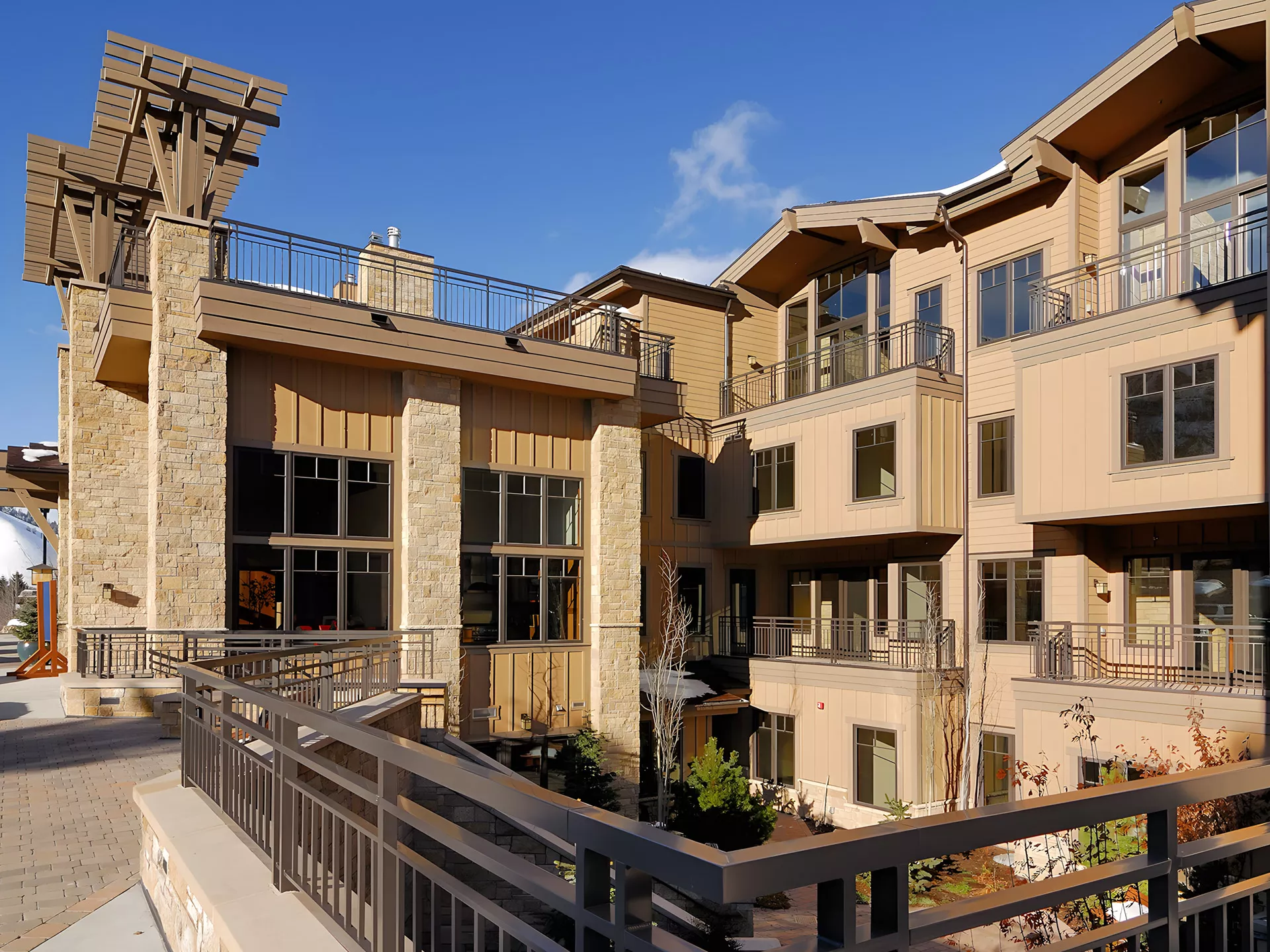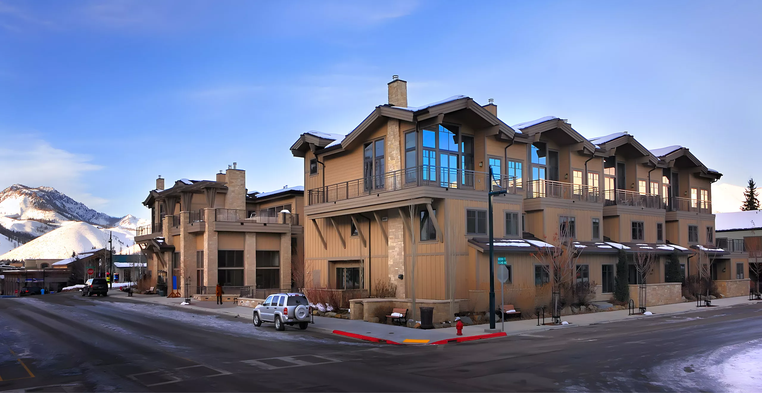 The exterior is a perfect complement to the western mountain town of Ketchum, Idaho. Natural sandstone, cedar board-and-batten, and wood shingles highlight its place in a western context. The façades are a distinctive sawtooth pattern to break up the street wall and scale to the context of this resort town. A sunken courtyard faces south, flooding units with daylight while increasing usable building area. Post-tension slabs contribute to a lower floor-to-floor height while allowing high unit ceilings. Courtyards, sidewalks and decks are heated, in addition to cold roof construction and rainscreen construction adapted for the climate.