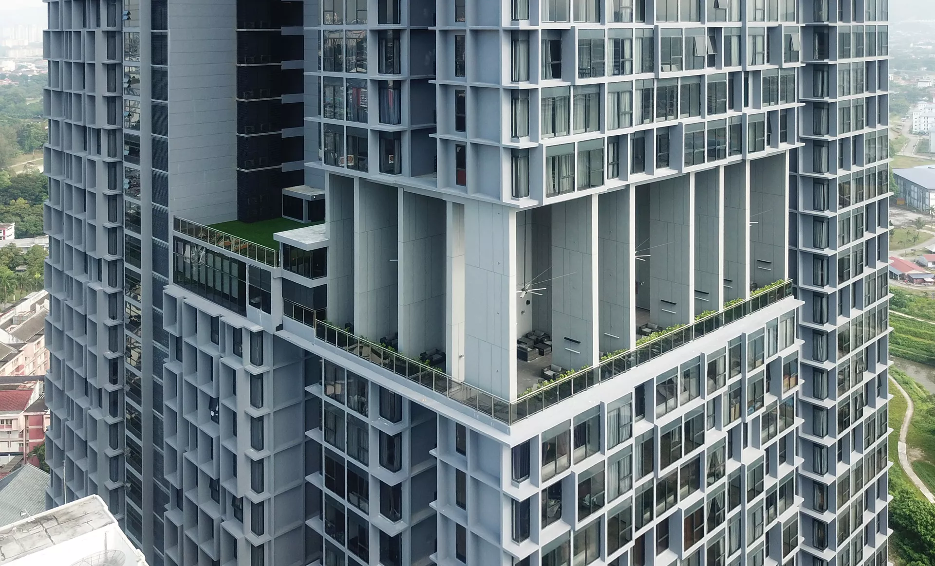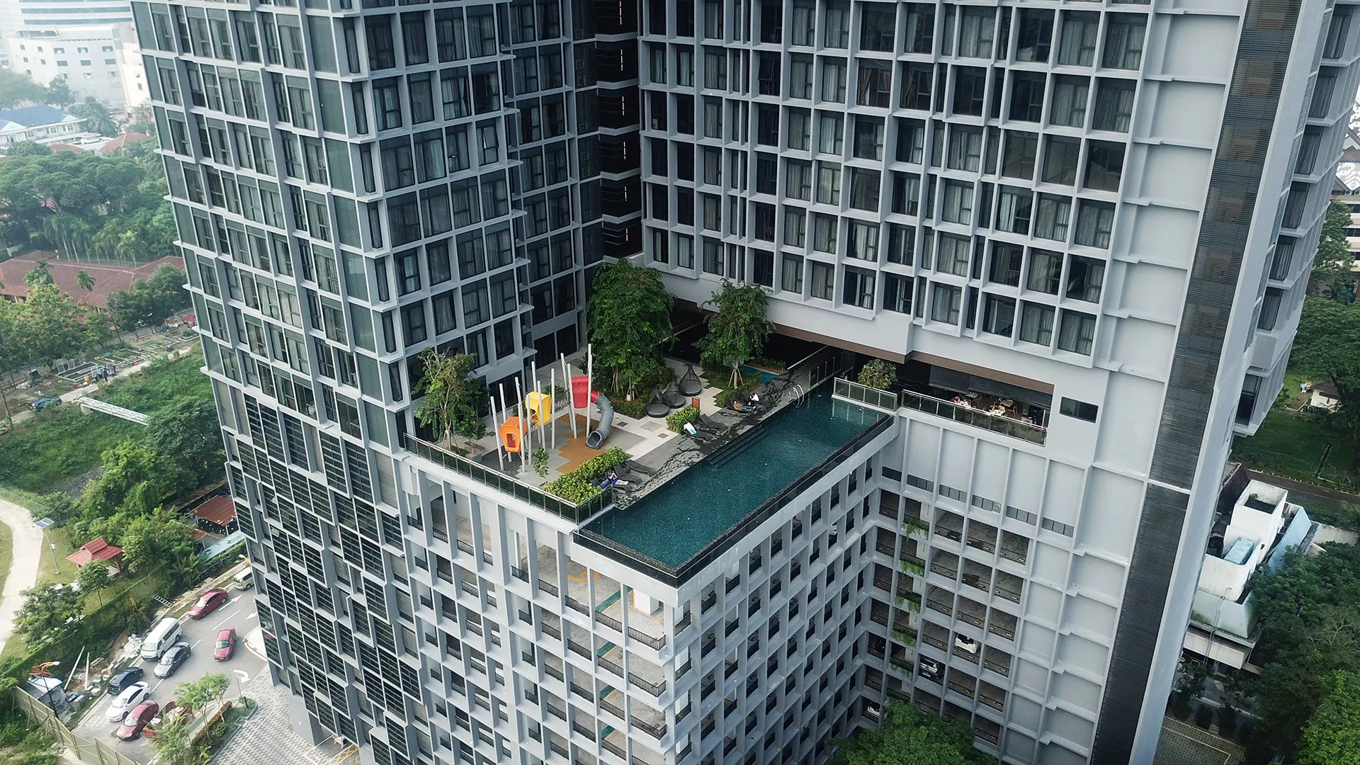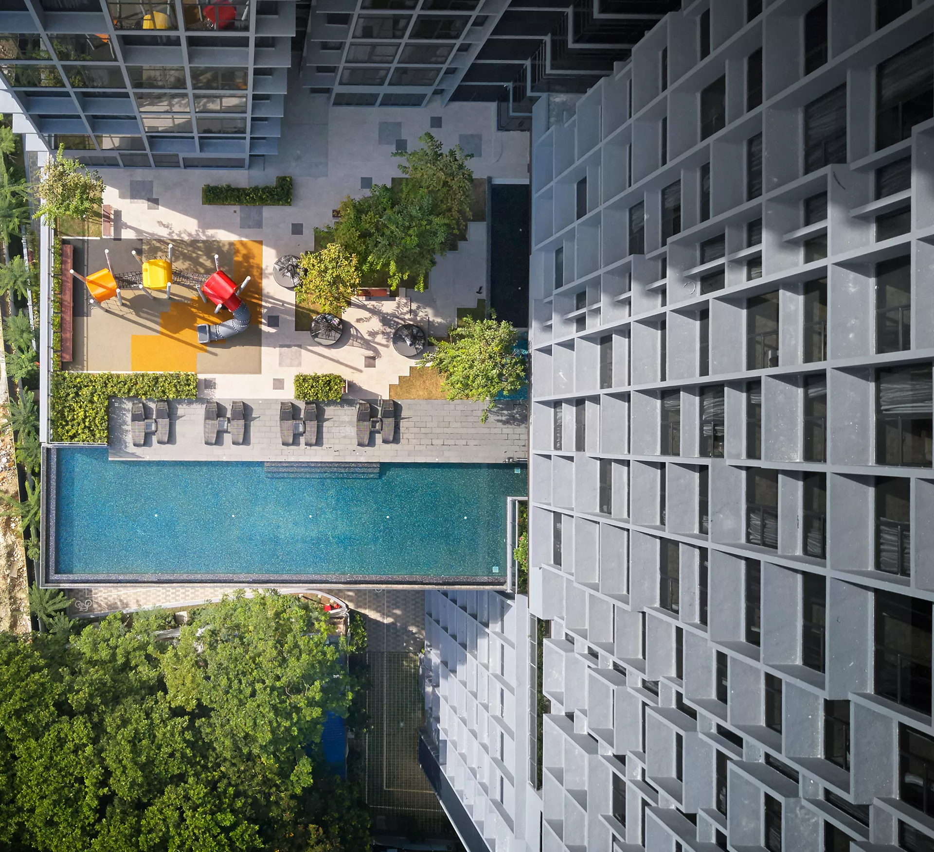 The podium deck serves as a landscaped platform, hosting swimming and wading pools, a sculpture garden, children’s play areas, a nursery, jacuzzies, and an eco-kitchen. Terraced planting and thoughtfully composed outdoor spaces create a vibrant, multi-functional environment that balances urban density with open-air leisure.