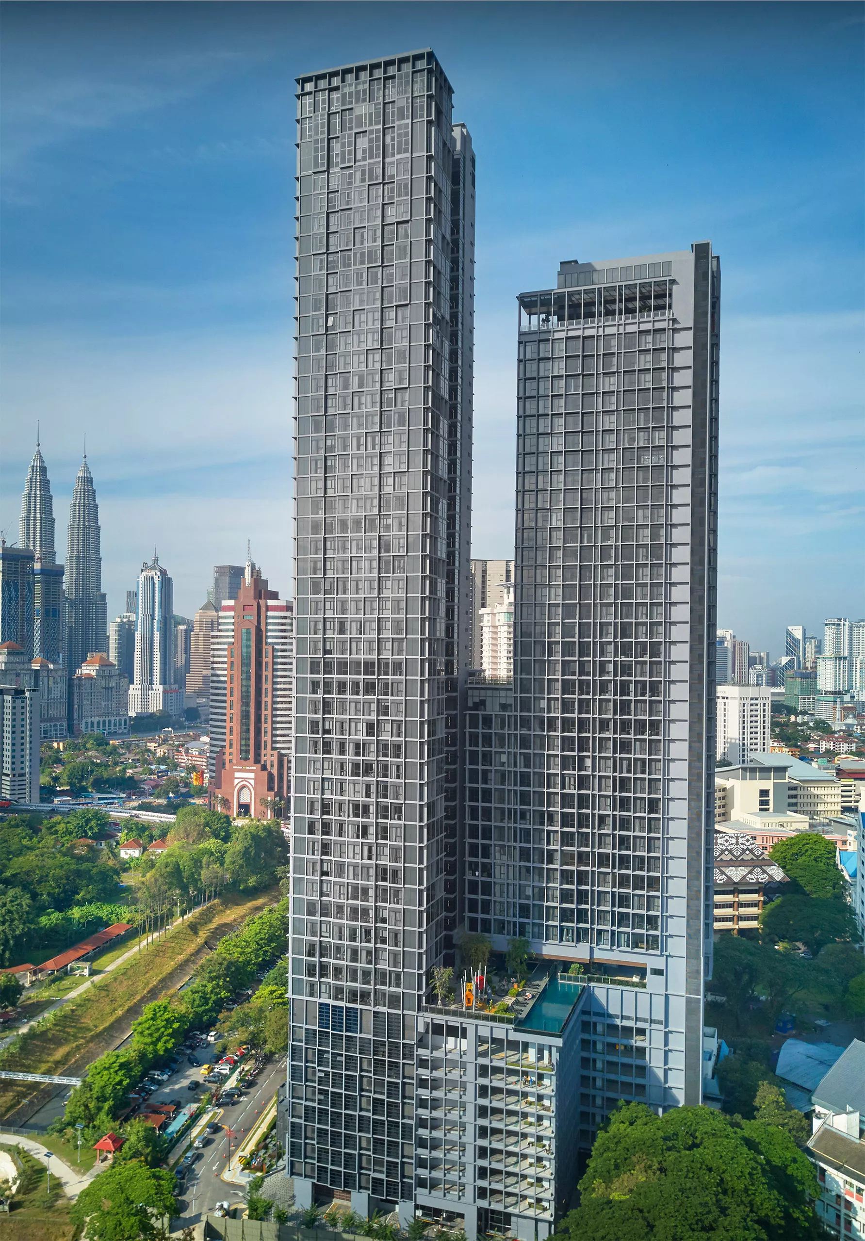 Rising prominently within the city skyline, the towers exhibit a sleek vertical language that emphasizes slenderness and elegance. Their elevated vantage points provide uninterrupted views of Kuala Lumpur, embracing a lifestyle experience that connects metropolitan energy with a sense of retreat and personal space.