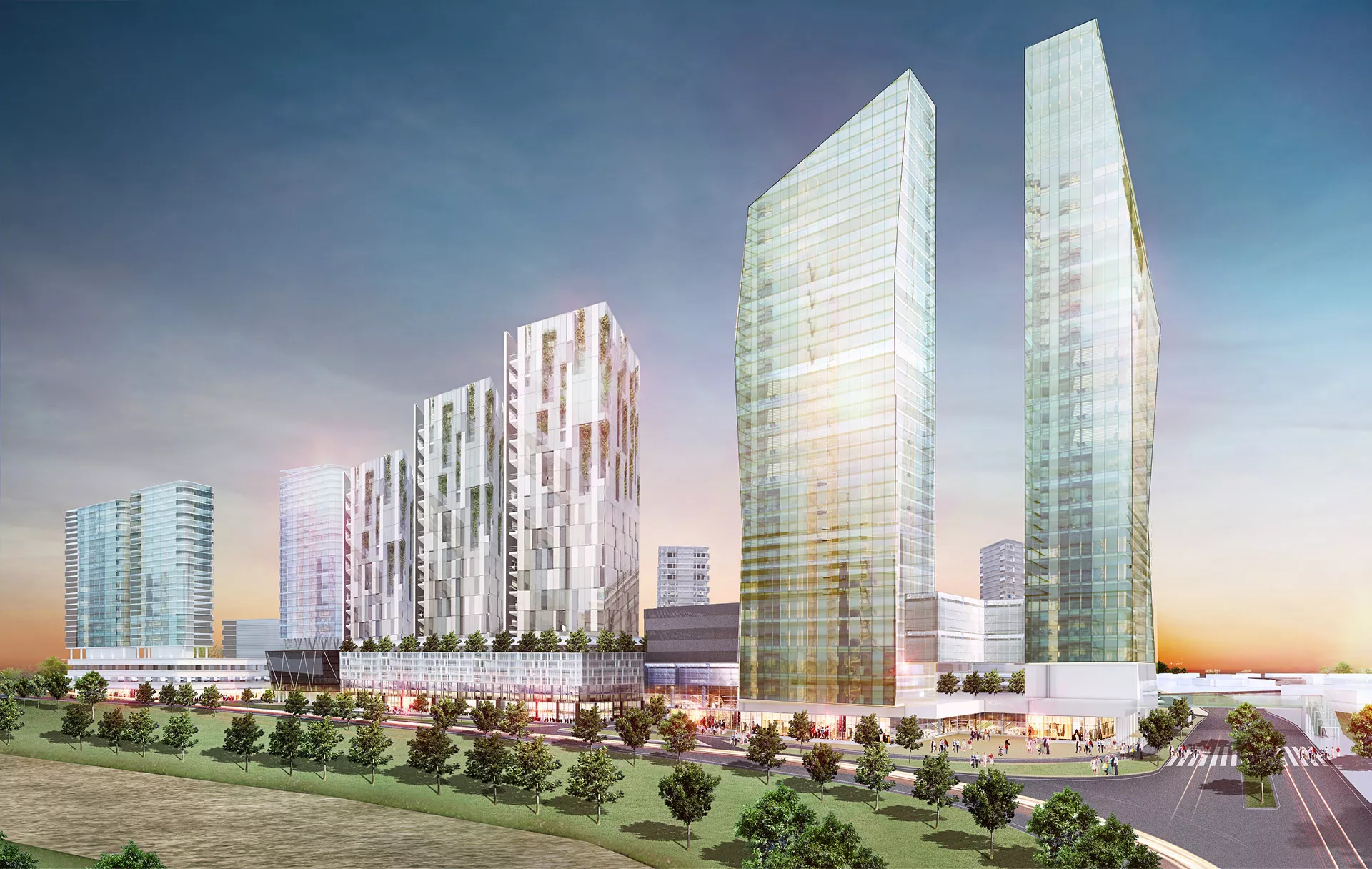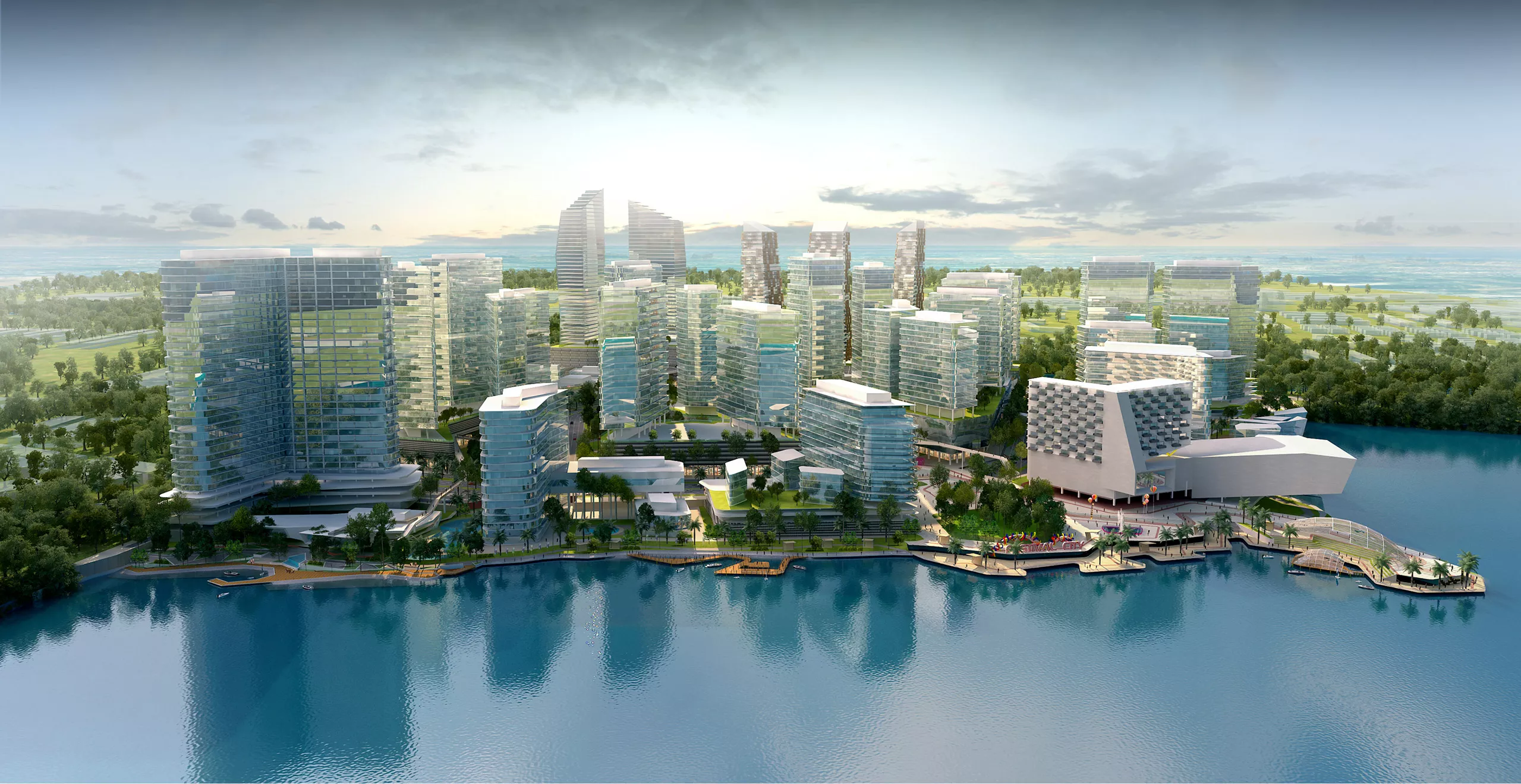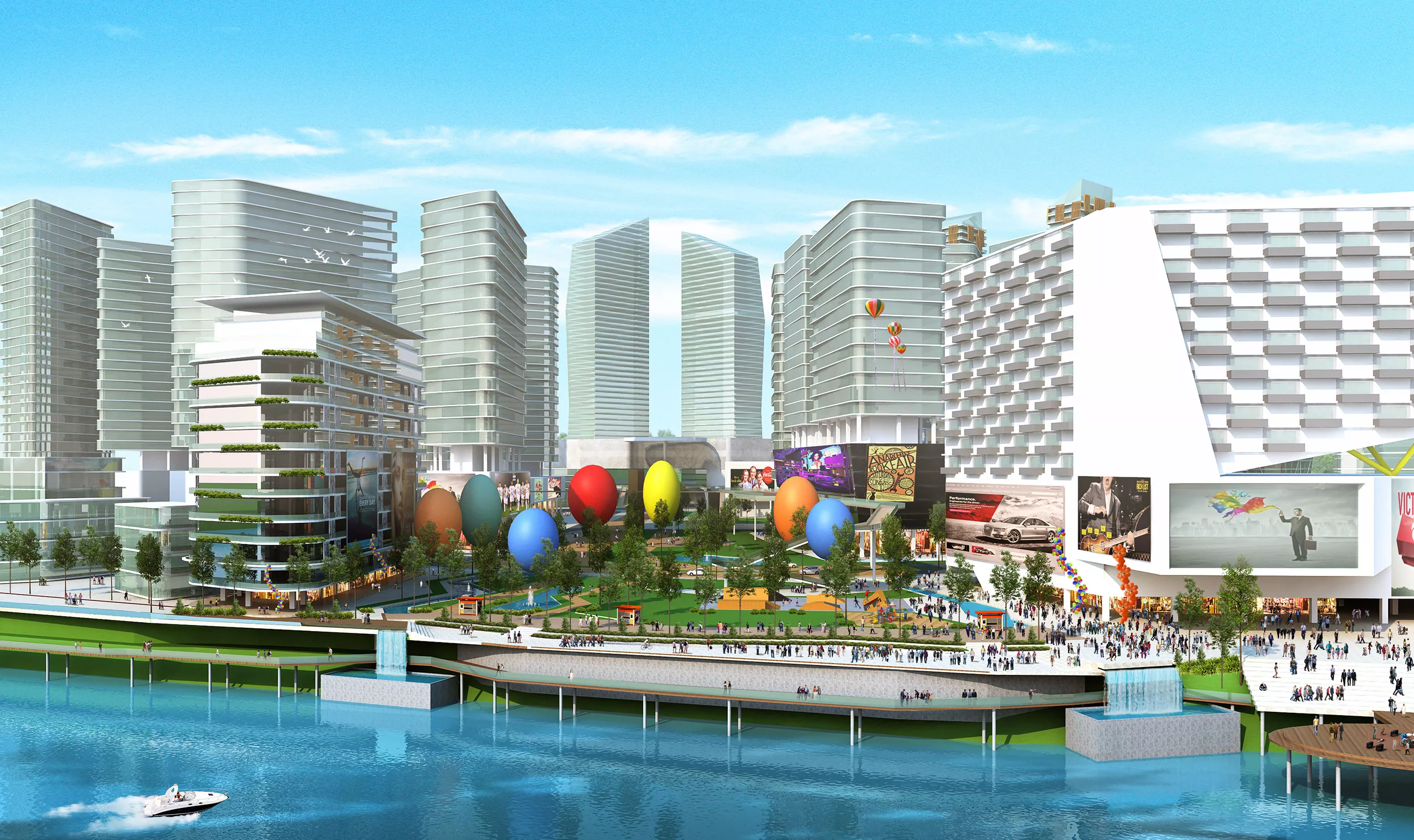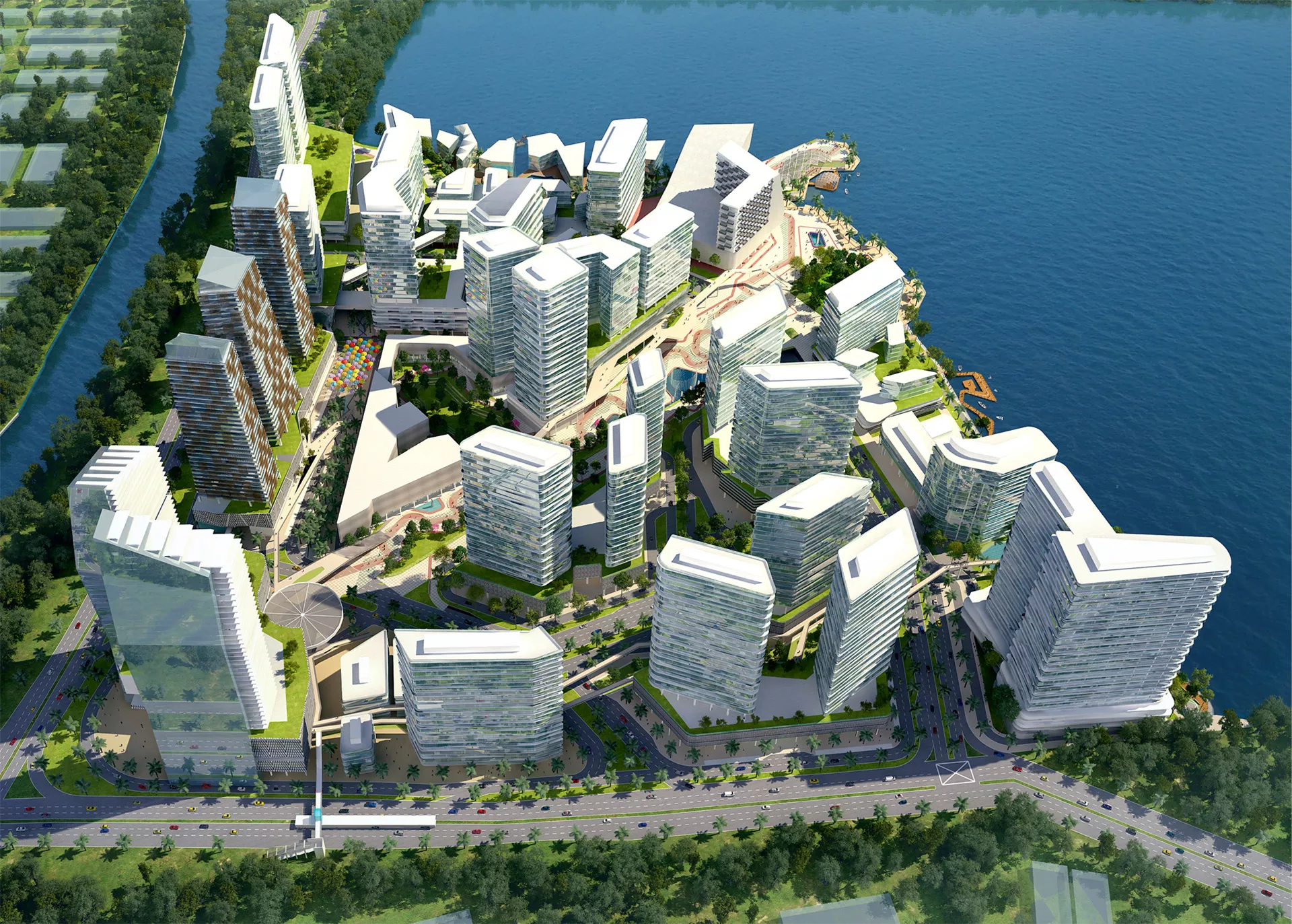 Three man-made waterways flow from iconic towers toward a central lake — a concept inspired by a river delta where streams converge toward the sea. A large urban park intersects the site’s third quadrant, serving as a main pedestrian axis and green spine that enhances connectivity and community interaction.