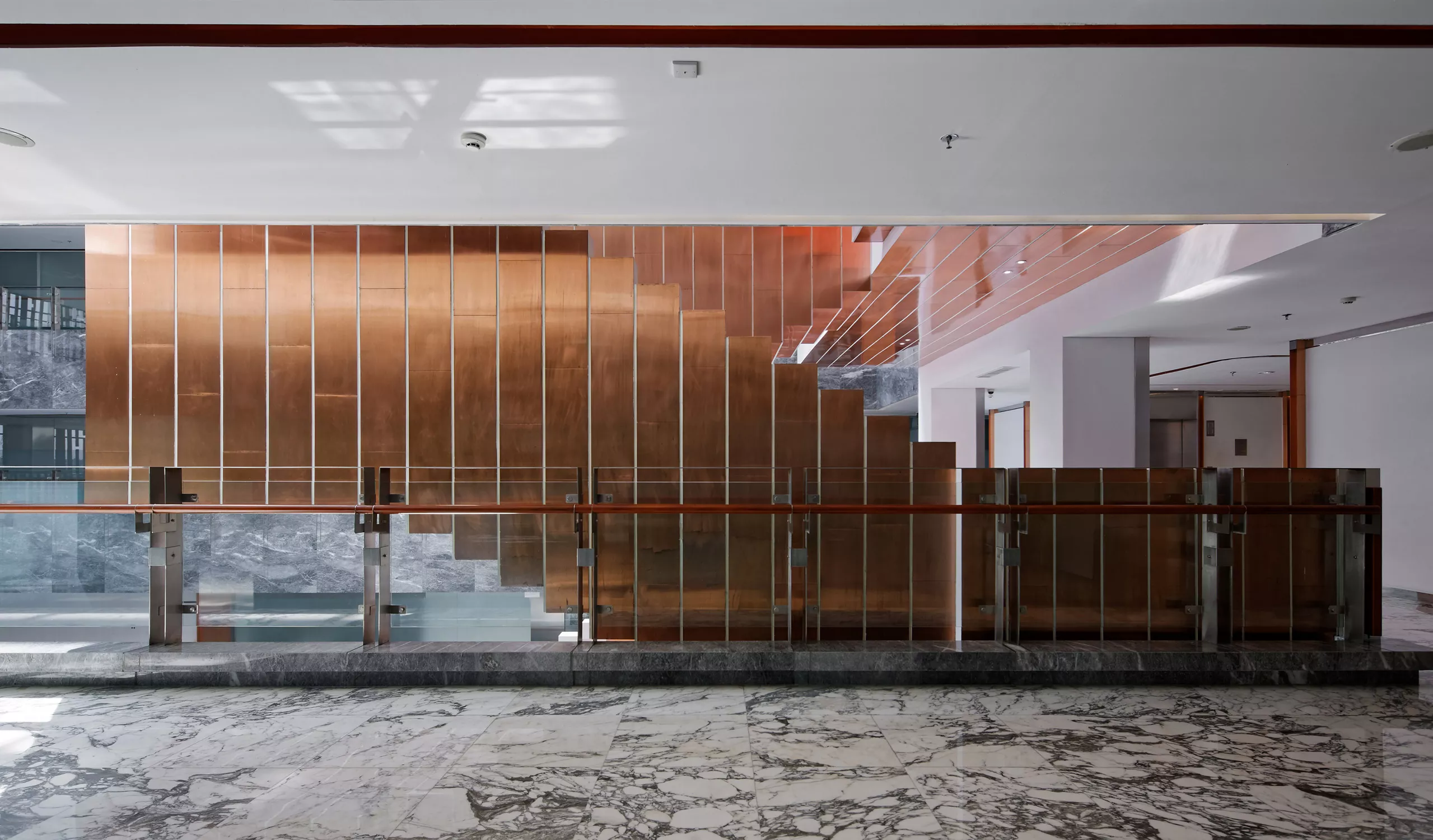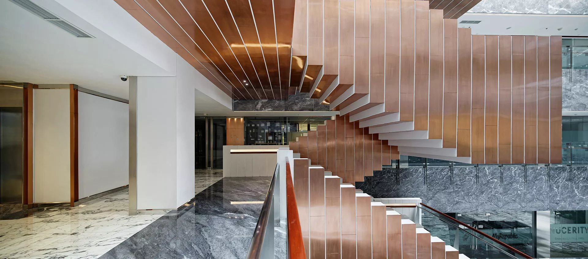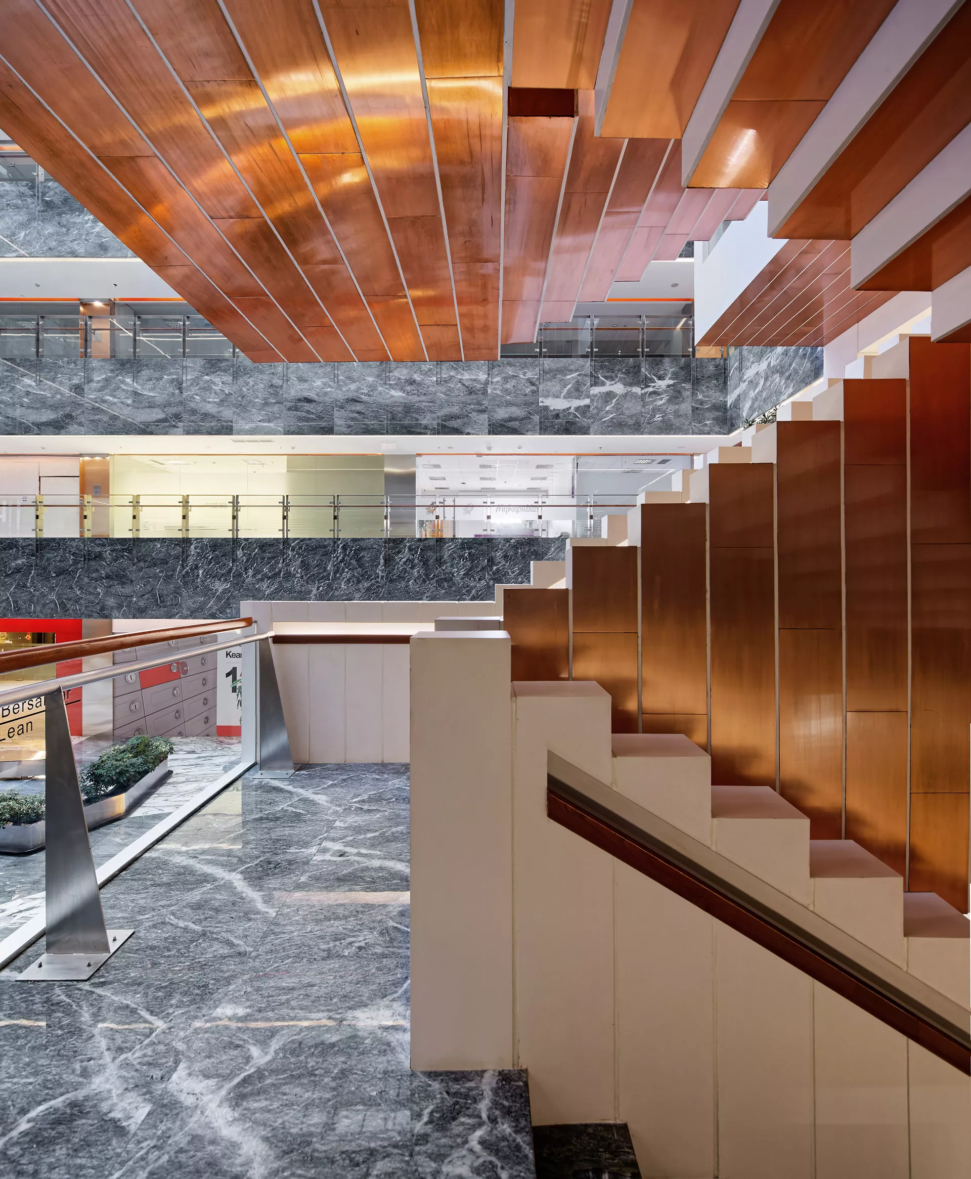 The atrium is defined by a bold, copper-clad grand staircase, conceived as a sculptural centerpiece rather than a mere functional element. Responding to the surrounding context, where brown tones dominate, the scheme introduces copper as a signature material imbuing the project with a sense of luxury and a warm, golden hue. The material choice bridges contextual integration with a unique, high-end expression.