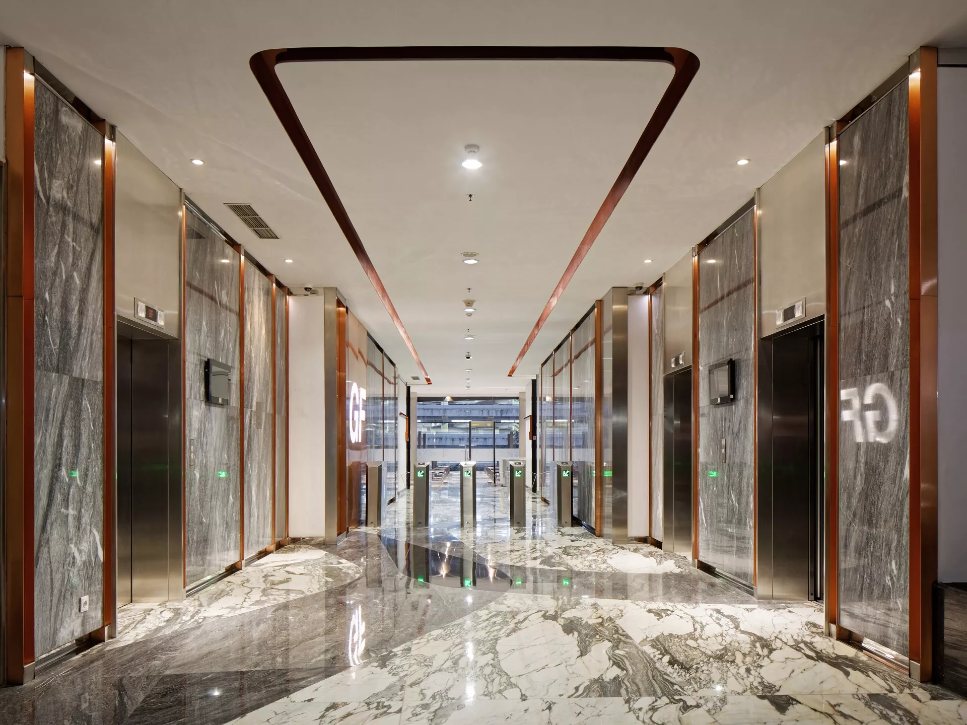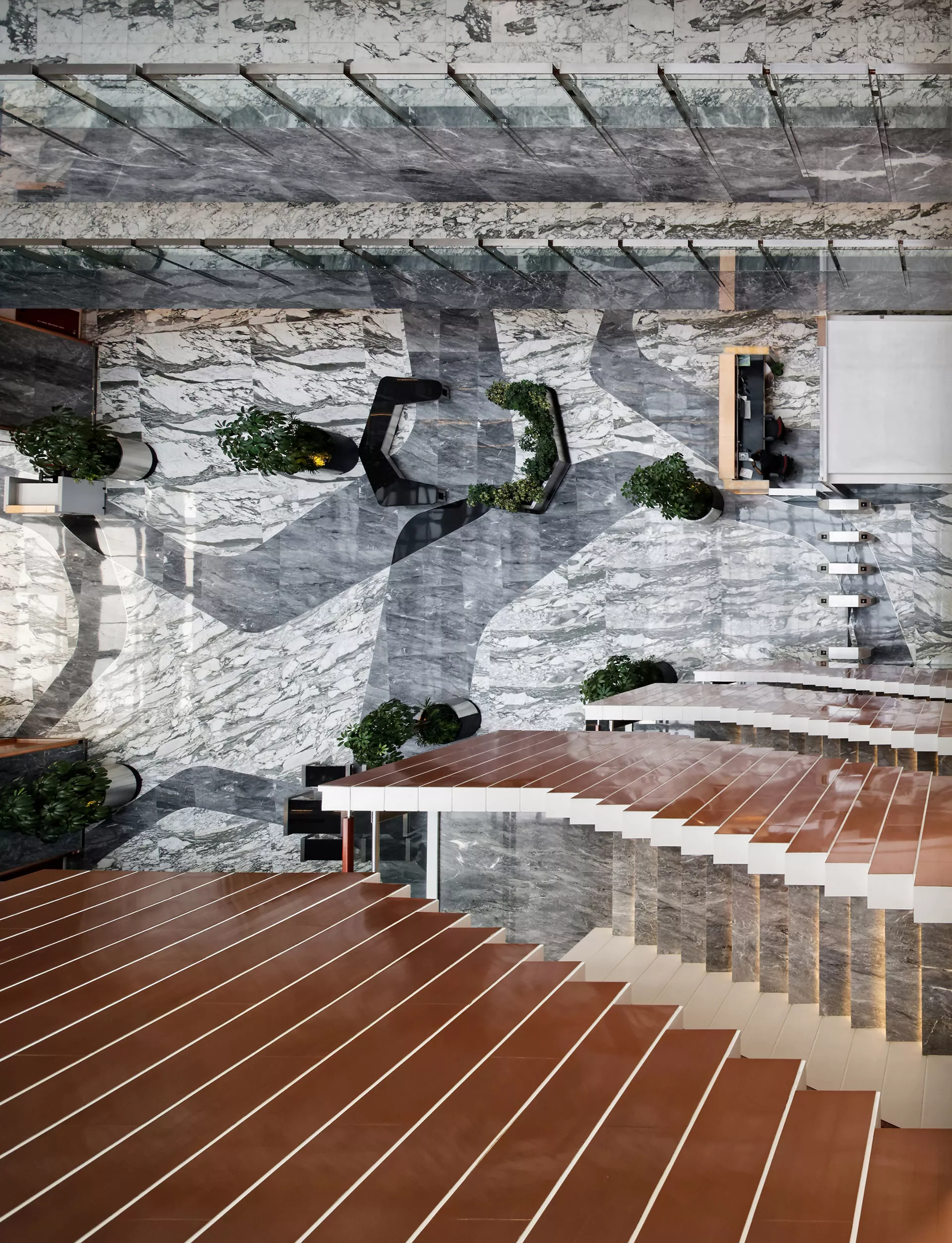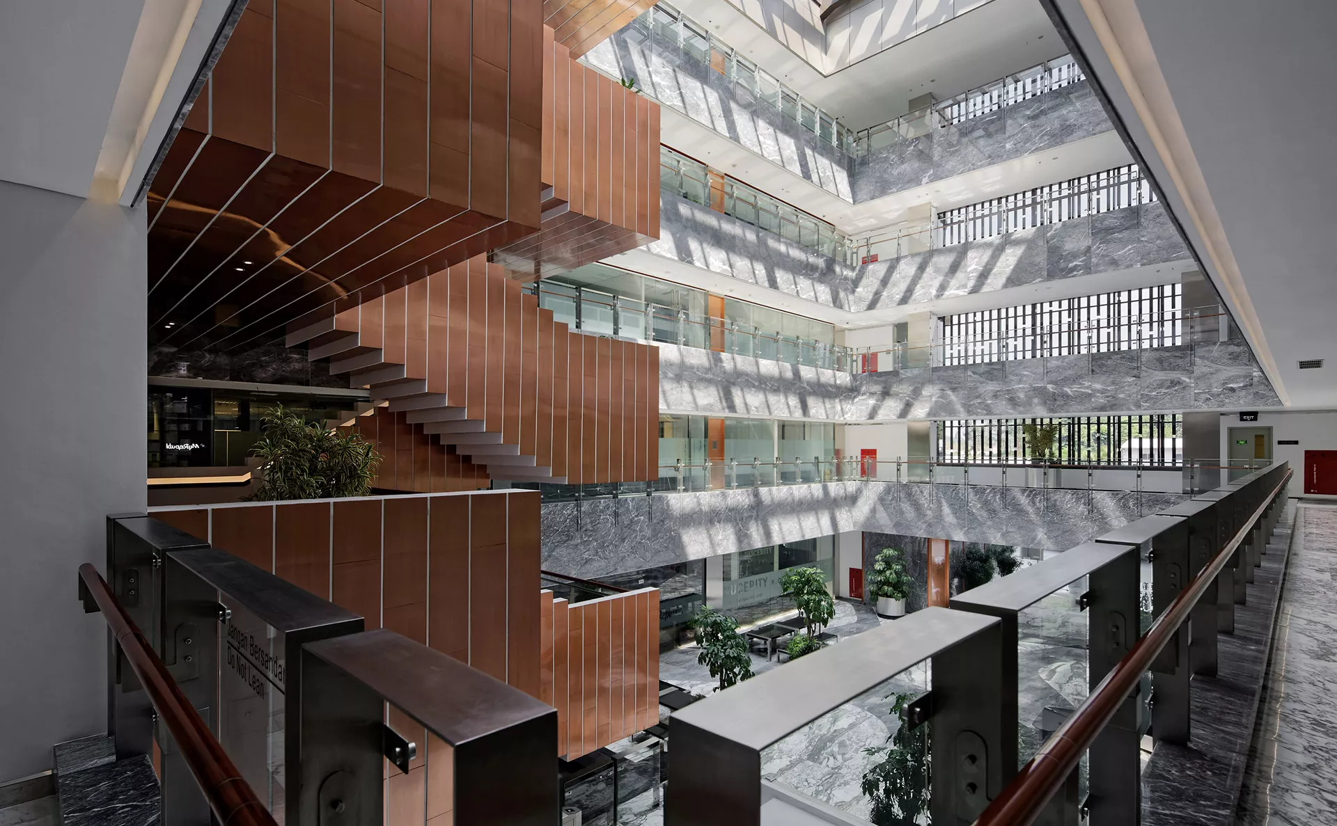 The atrium is defined by a bold, copper-clad grand staircase, conceived as a sculptural centerpiece rather than a mere functional element. Responding to the surrounding context, where brown tones dominate, the scheme introduces copper as a signature material imbuing the project with a sense of luxury and a warm, golden hue. The material choice bridges contextual integration with a unique, high-end expression.