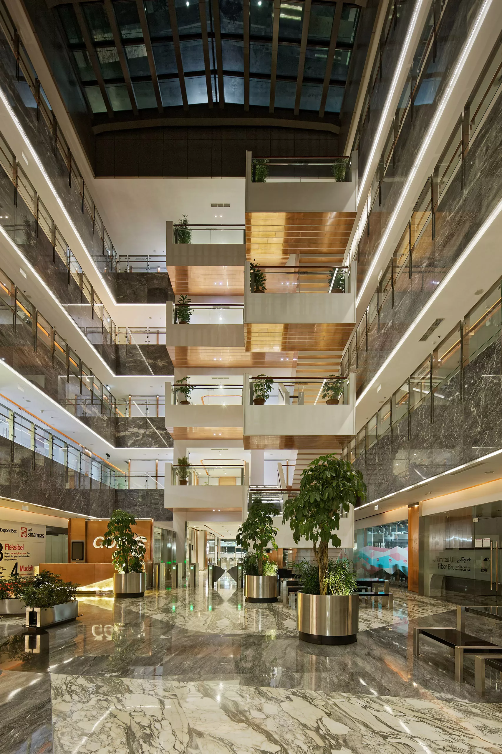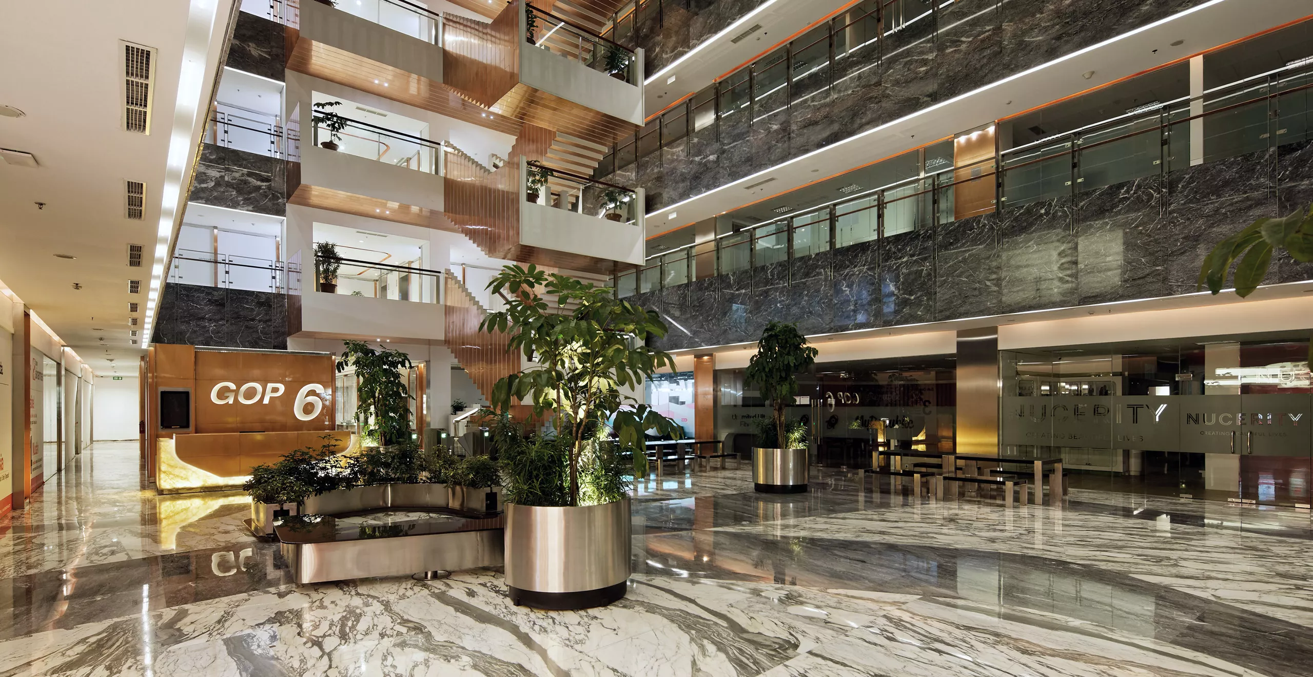 At the core of Green Office Park 6 lies a five-storey atrium flooded with natural daylight through a glazed roof. Reception and meeting areas occupy the ground level, while a series of lift lobbies provide direct access to upper-floor offices, public amenities, and additional meeting rooms. A black granite water feature anchors the space, creating a serene backdrop for circulation and gathering.