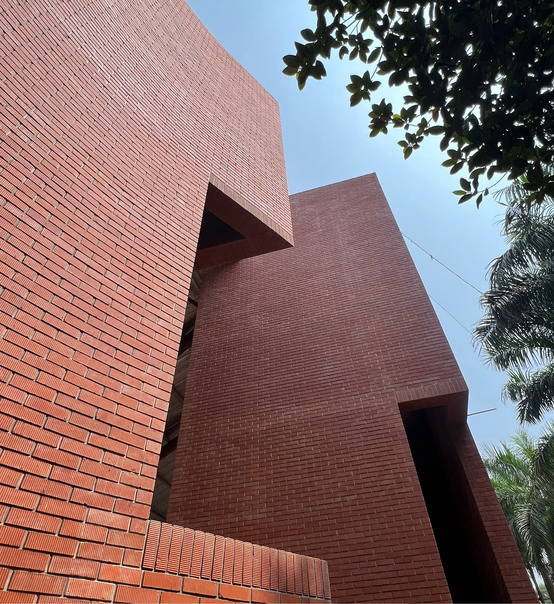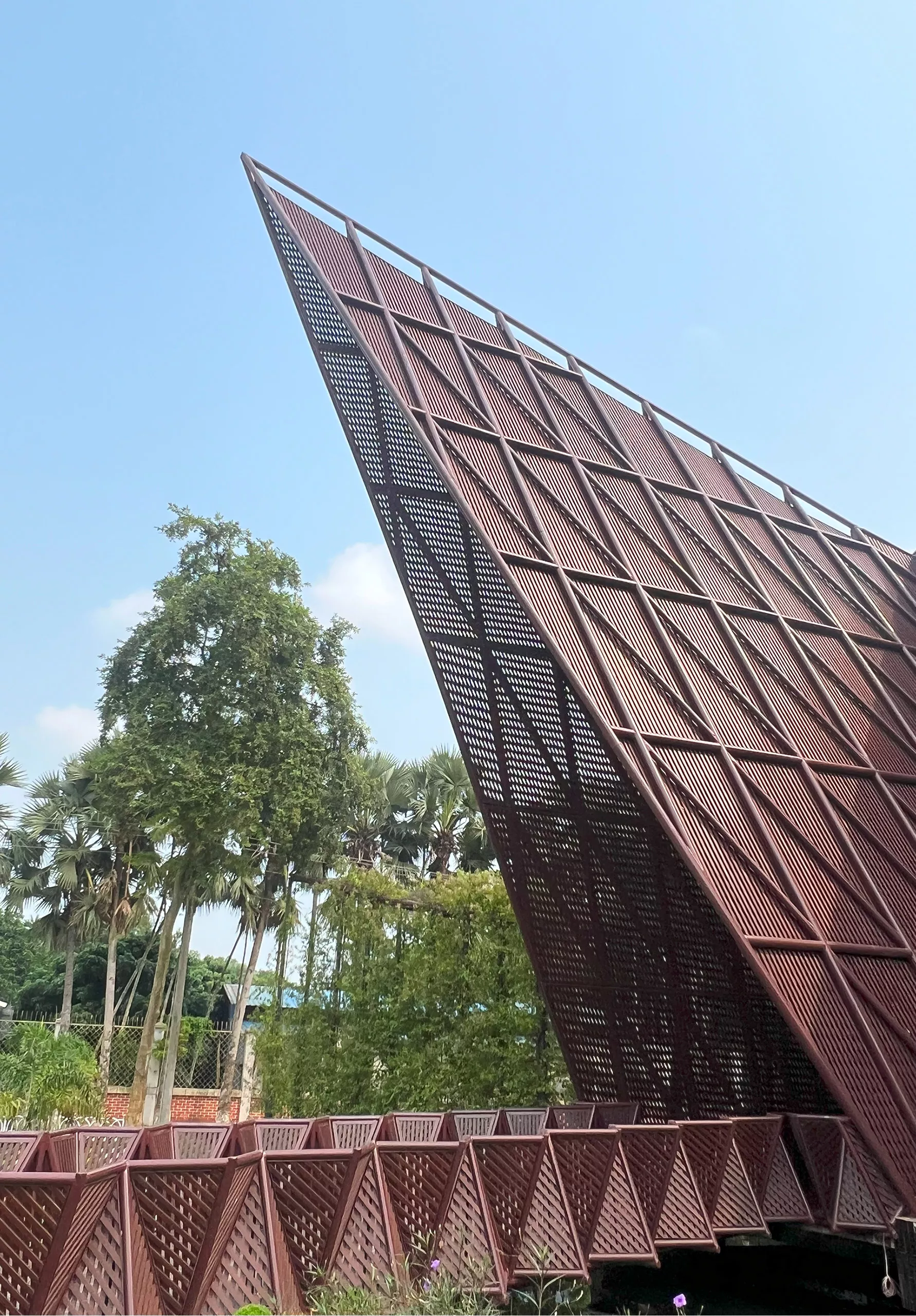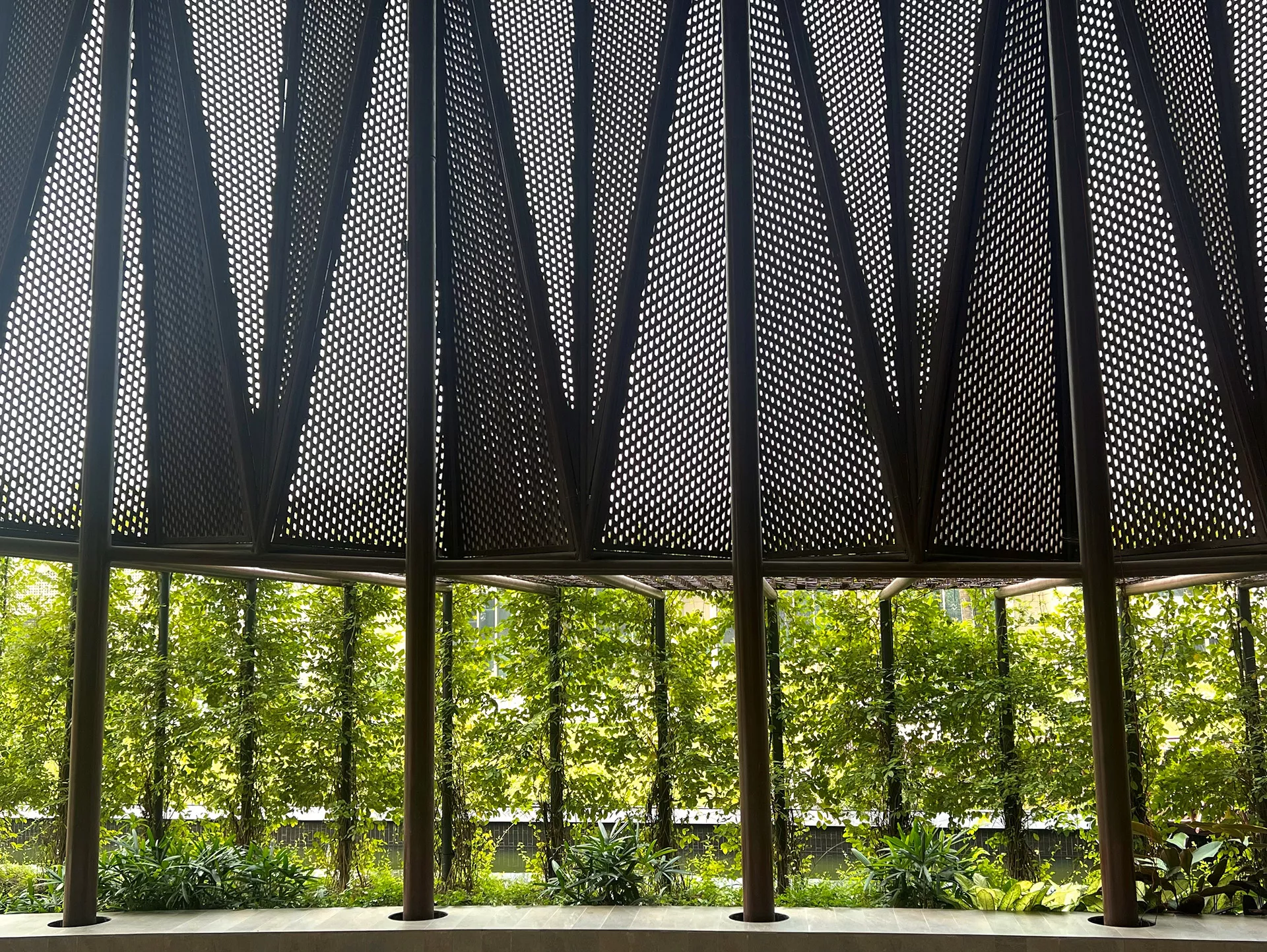 The exterior form of the lounge features an organic, curvilinear design, reminiscent of a deer’s eye—symbolizing observation, serenity, and connection with nature. The perforated façade, supported by vertical structural elements, allows natural ventilation and filtered light to enter, creating an immersive experience where diners feel enveloped by greenery. The earthy tones and textured surfaces further enhance the sense of blending with the landscape.