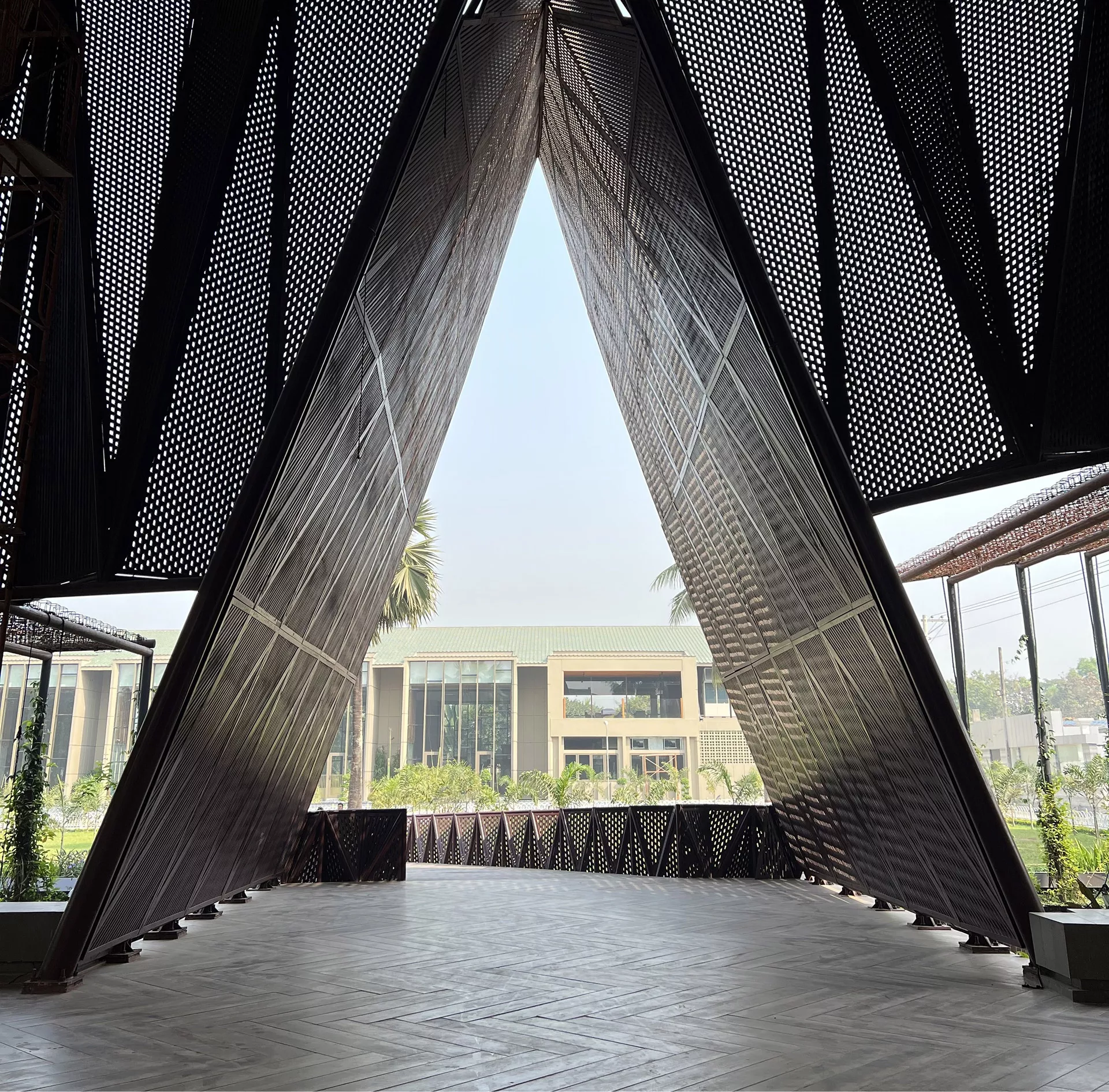 The interior space is an open, airy environment surrounded by lush greenery. Transparency and openness of the design encourage a communal atmosphere where people can connect over meals while being surrounded by the tranquillity of plants and natural light. The use of green walls and large openings blurs the boundary between the built structure and the outdoors, reinforcing a biophilic experience. The lounge is more than just a dining space—it is a sanctuary where architecture, nature, and community converge.