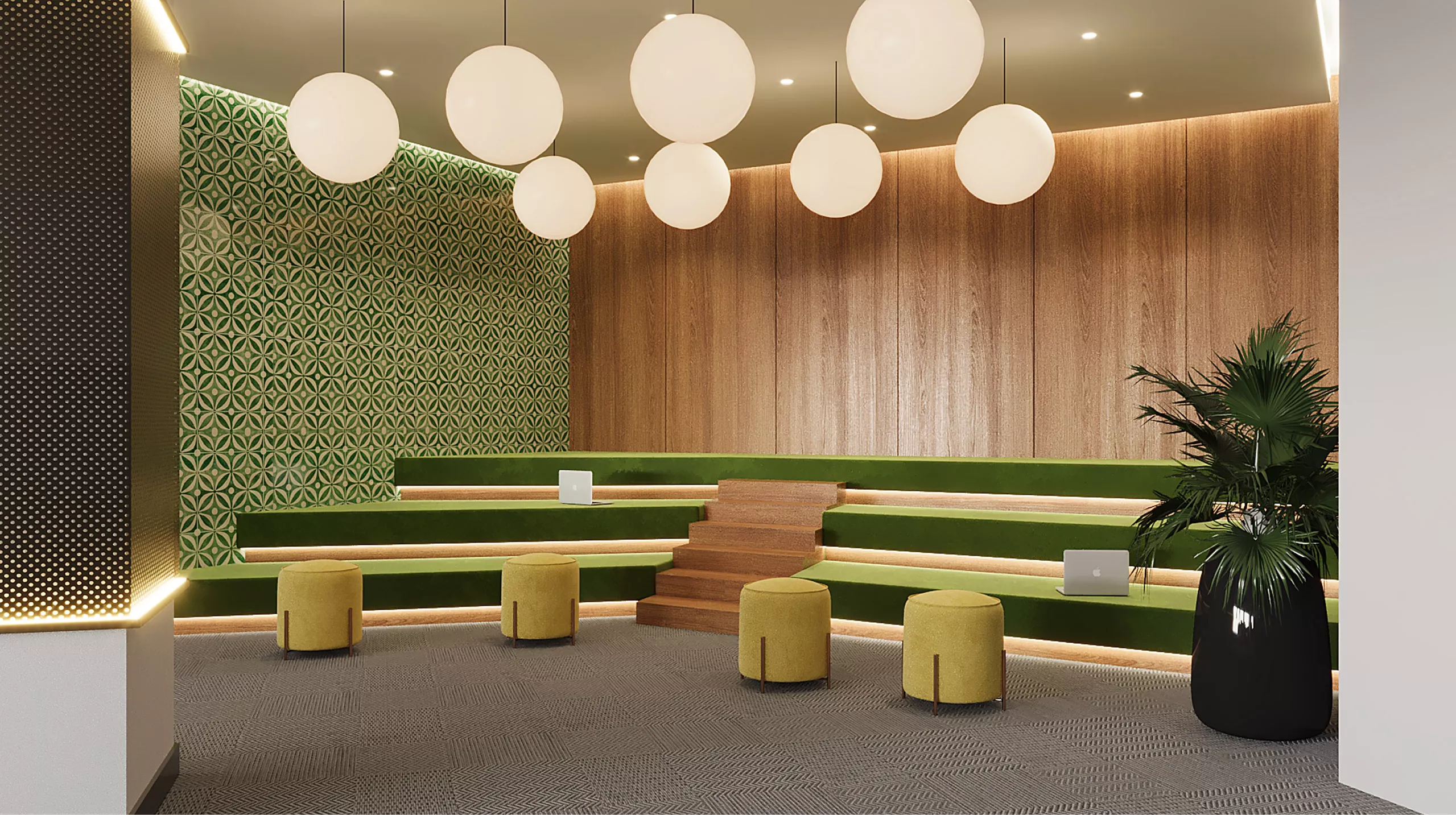 Penang’s cultural heritage, with the celebrated Peranakan-inspired ceramics, ornate floral motifs, and intricate geometric patterns, creates a strong sense of place at both micro and macro scales. These traditional elements are paired with naturalistic textures and contemporary finishes, creating a harmonious dialogue between the past and present. The resulting KWSP Georgetown office is an office that not only meets operational needs but also acts as a cultural touchpoint, connecting people with Penang’s heritage within the office space while reflecting KWSP’s brand values.
