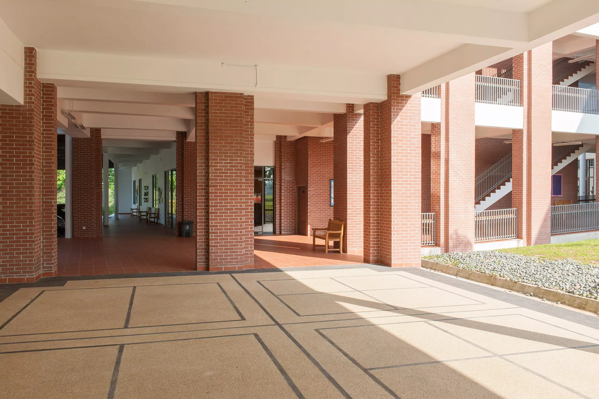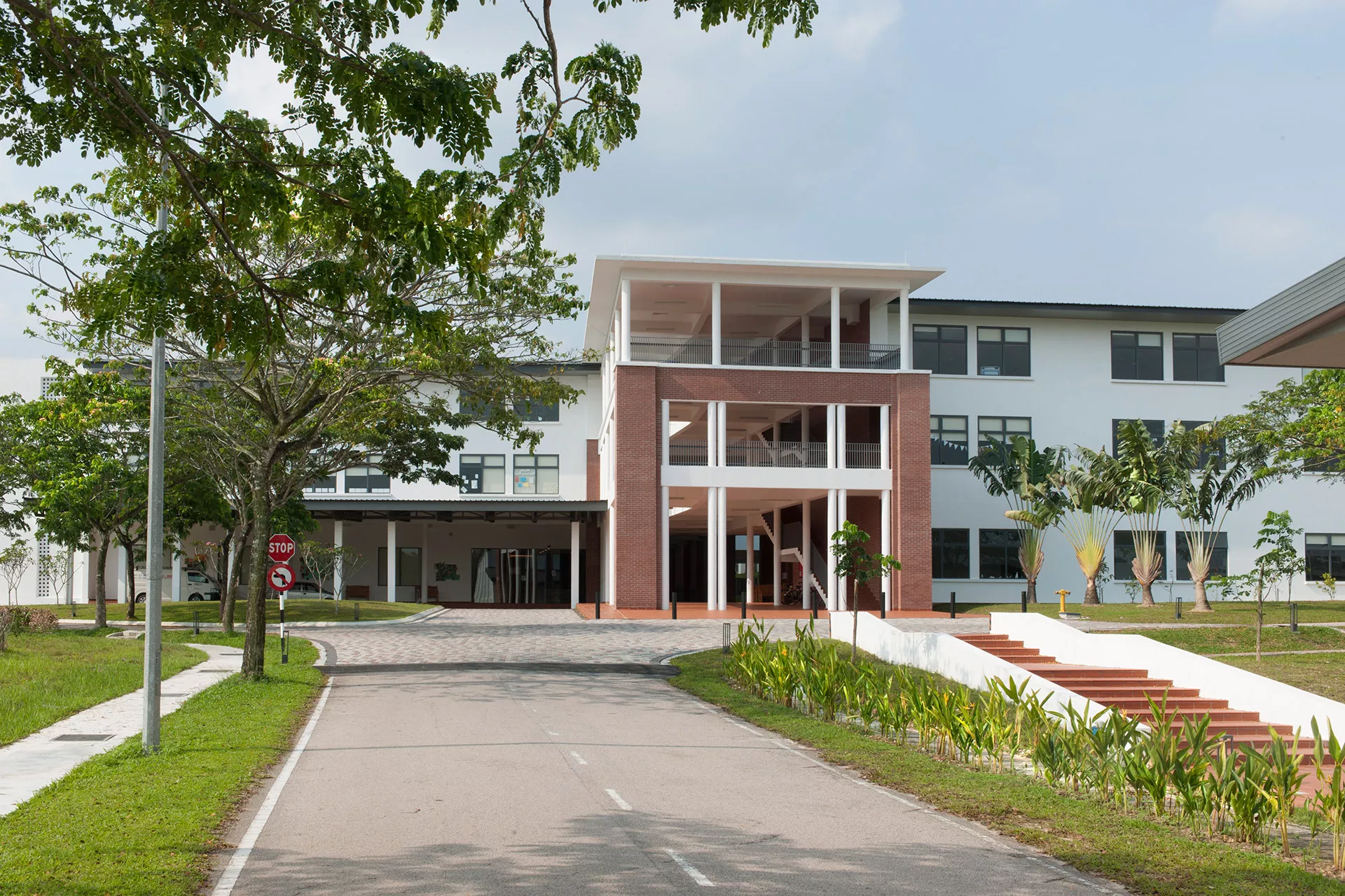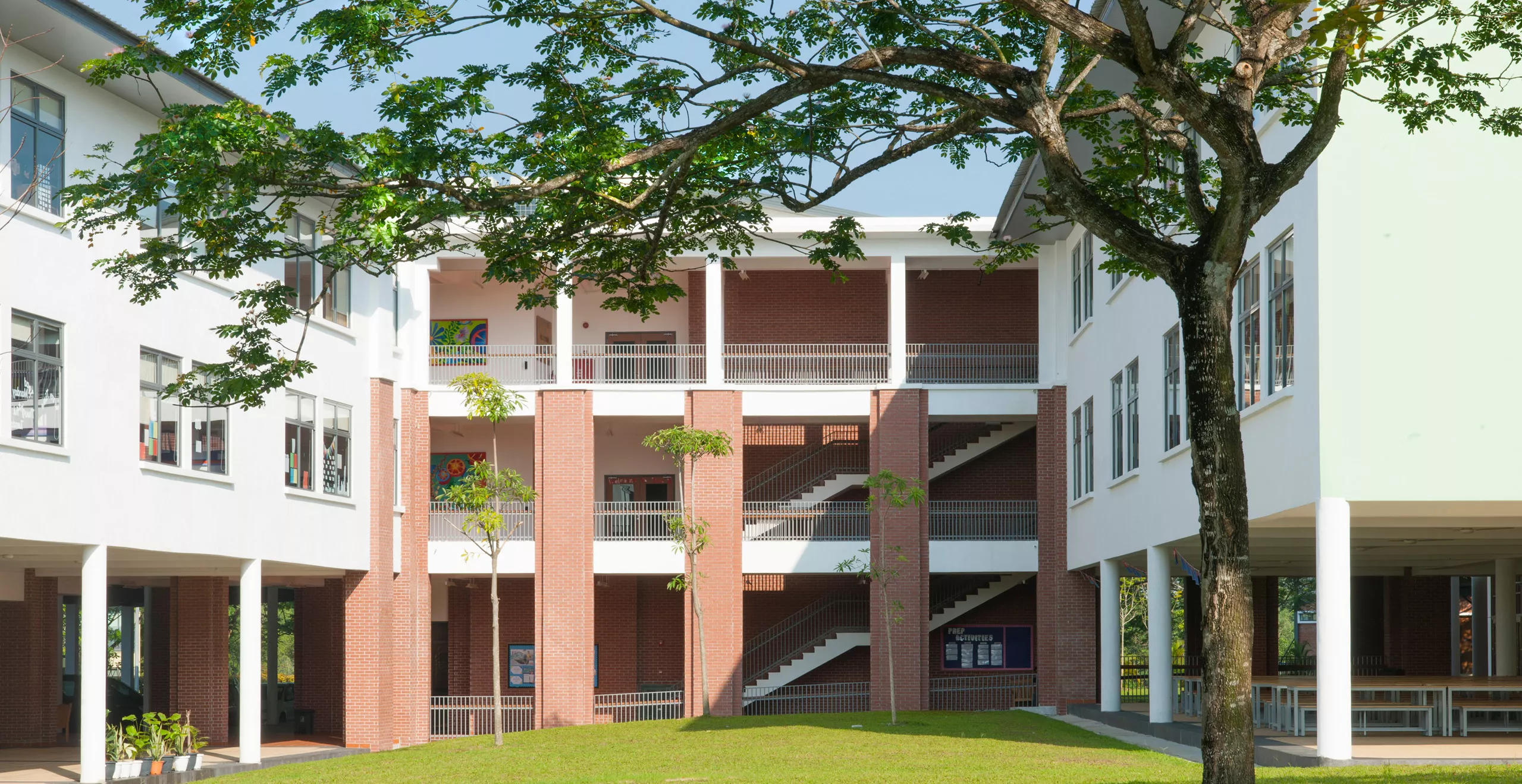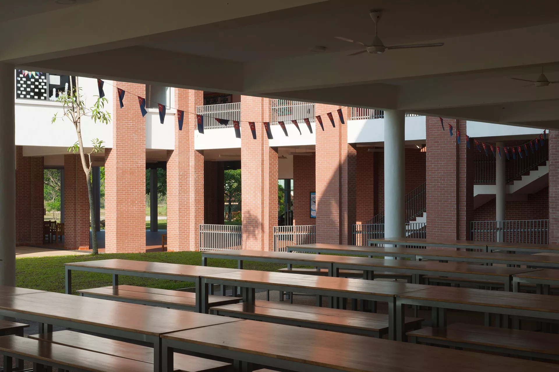 The Sixth Form Centre is a two-storey open-plan academic and recreational hub, with the design adopting a contemporary interpretation of colonial and tropical principles. These principles respond to the geographical and climatic context of Malaysia with shaded verandas, generous overhangs, and naturally ventilated spaces that maximize daylight while mediating heat gain.