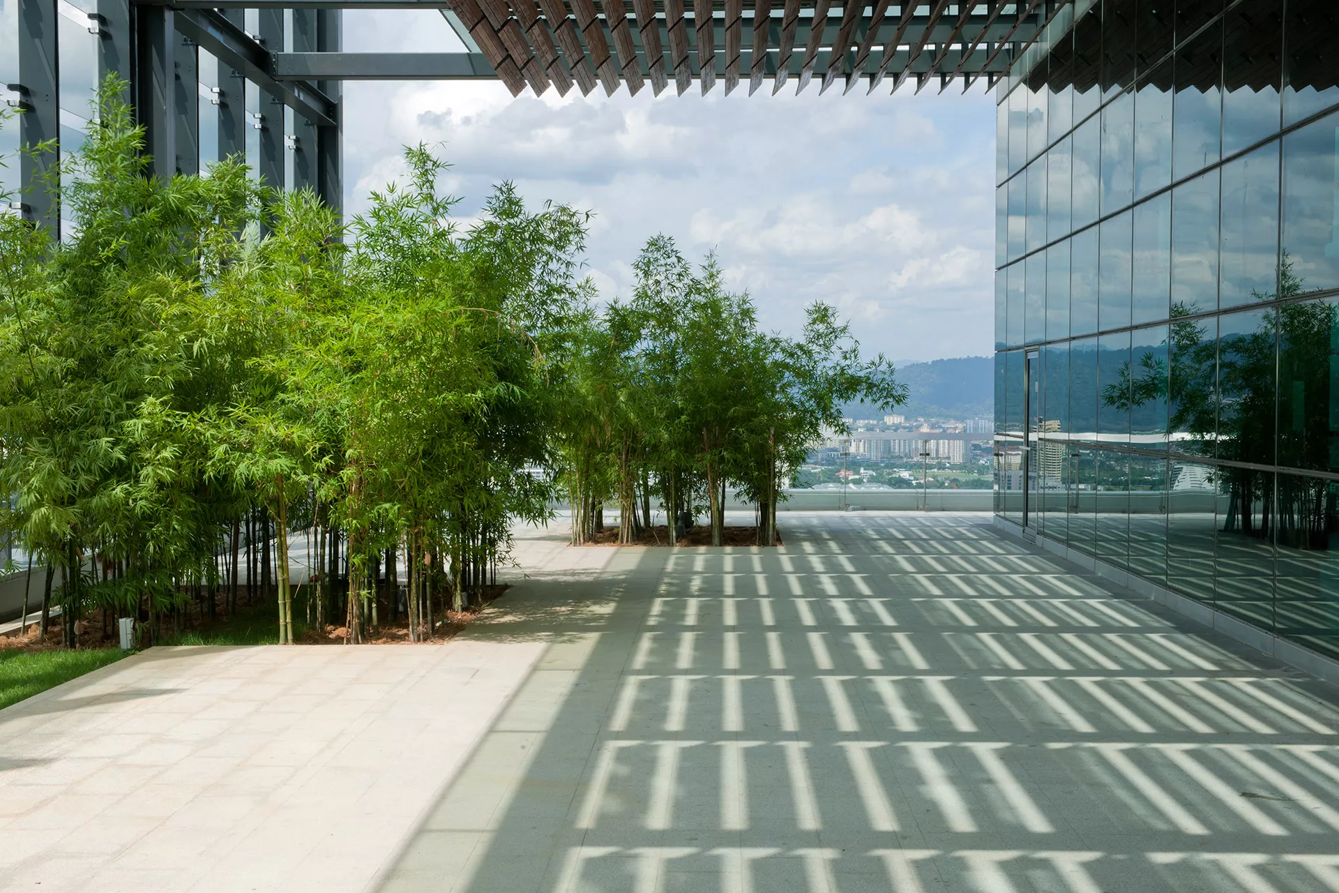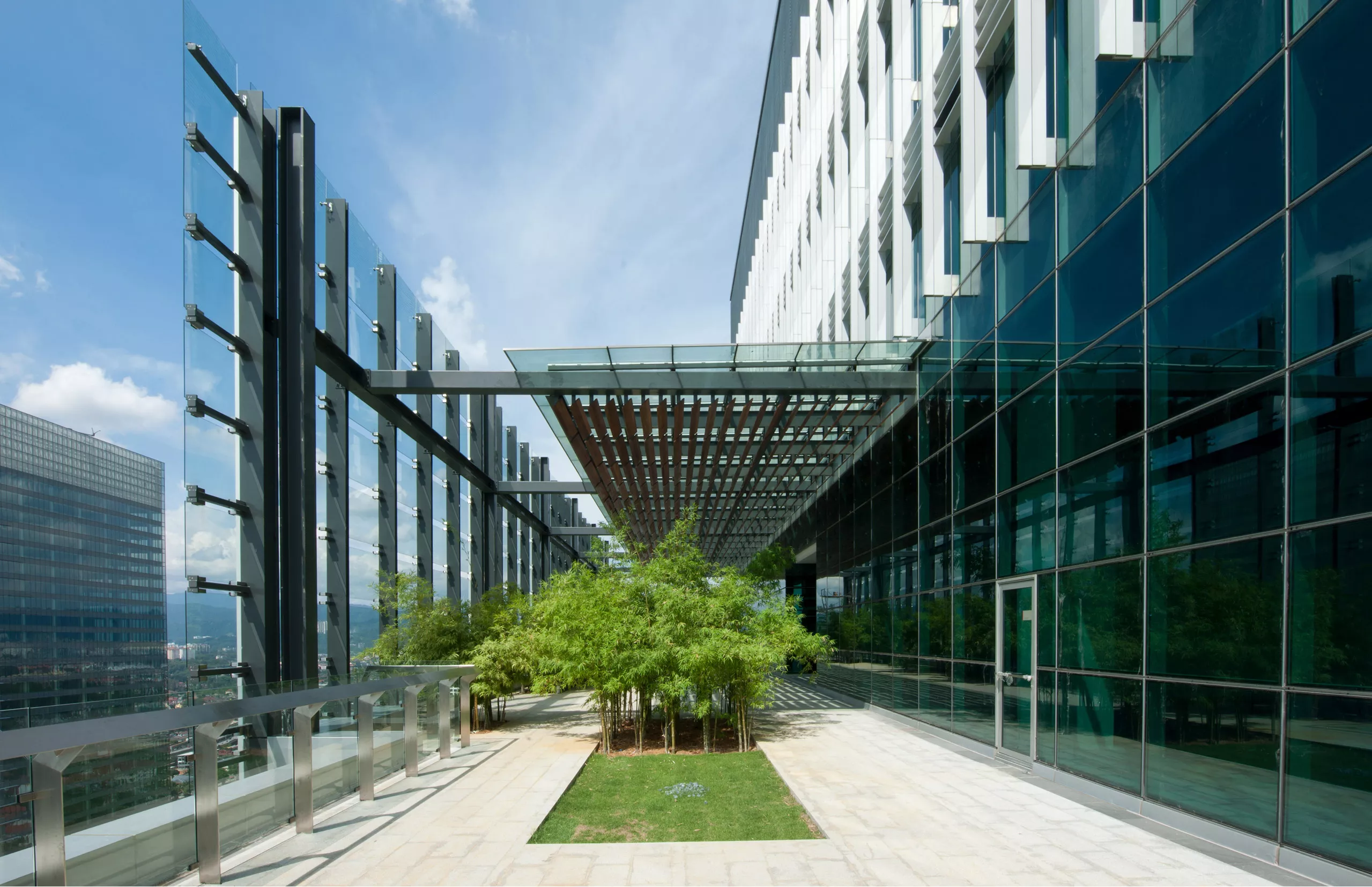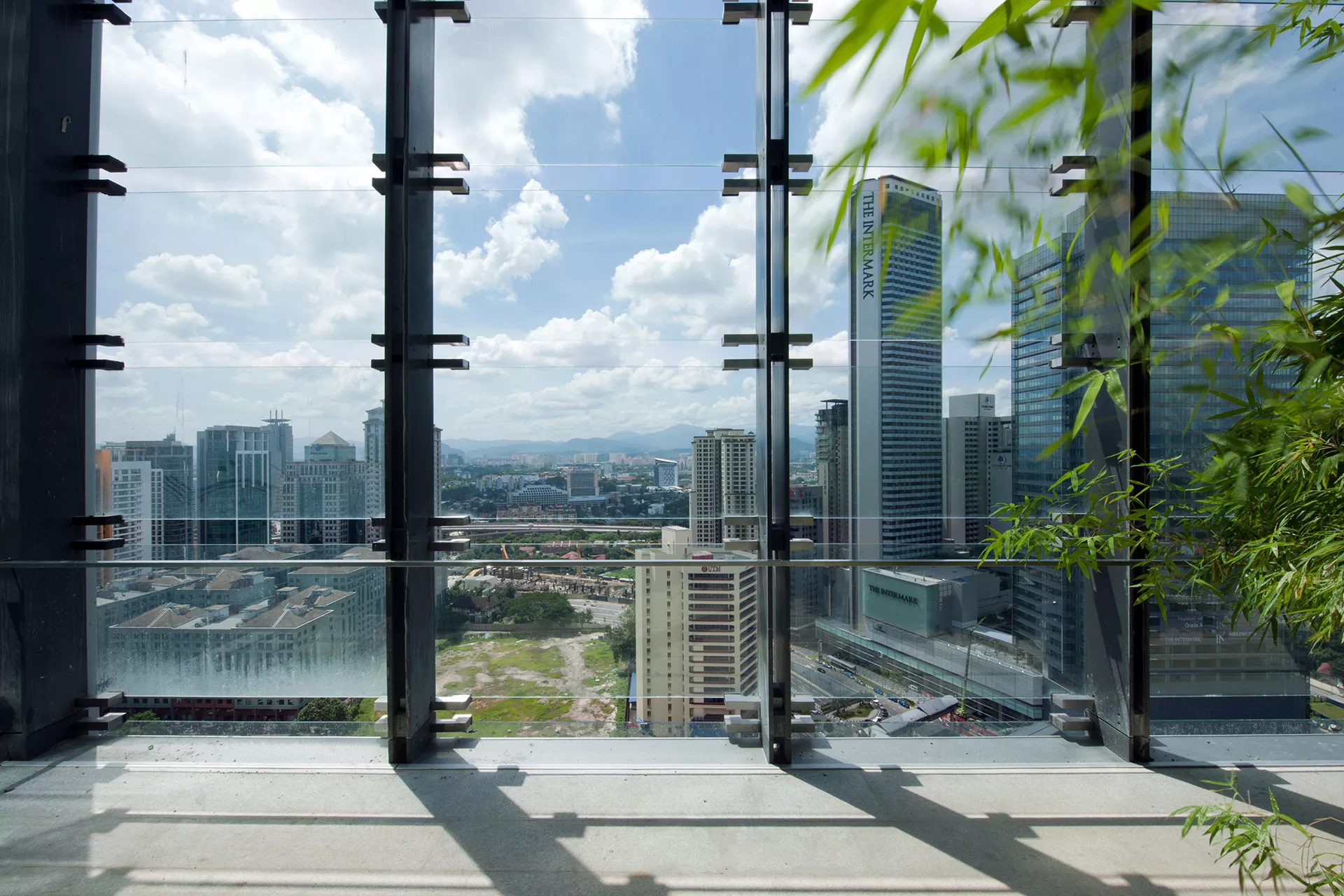 The tower’s signature design features a series of triple-volume sky gardens cascading up the north-facing façade, culminating in a lush rooftop garden that opens to panoramic views of the KLCC skyline. These sky gardens are enclosed by a permeable glass screen — an innovative “breathable skin” that allows prevailing breezes to flow through while buffering against monsoon rains. This creates a semi-outdoor “urban verandah,” allowing occupants to engage with the tropical climate, in contrast to conventional sealed office environments.