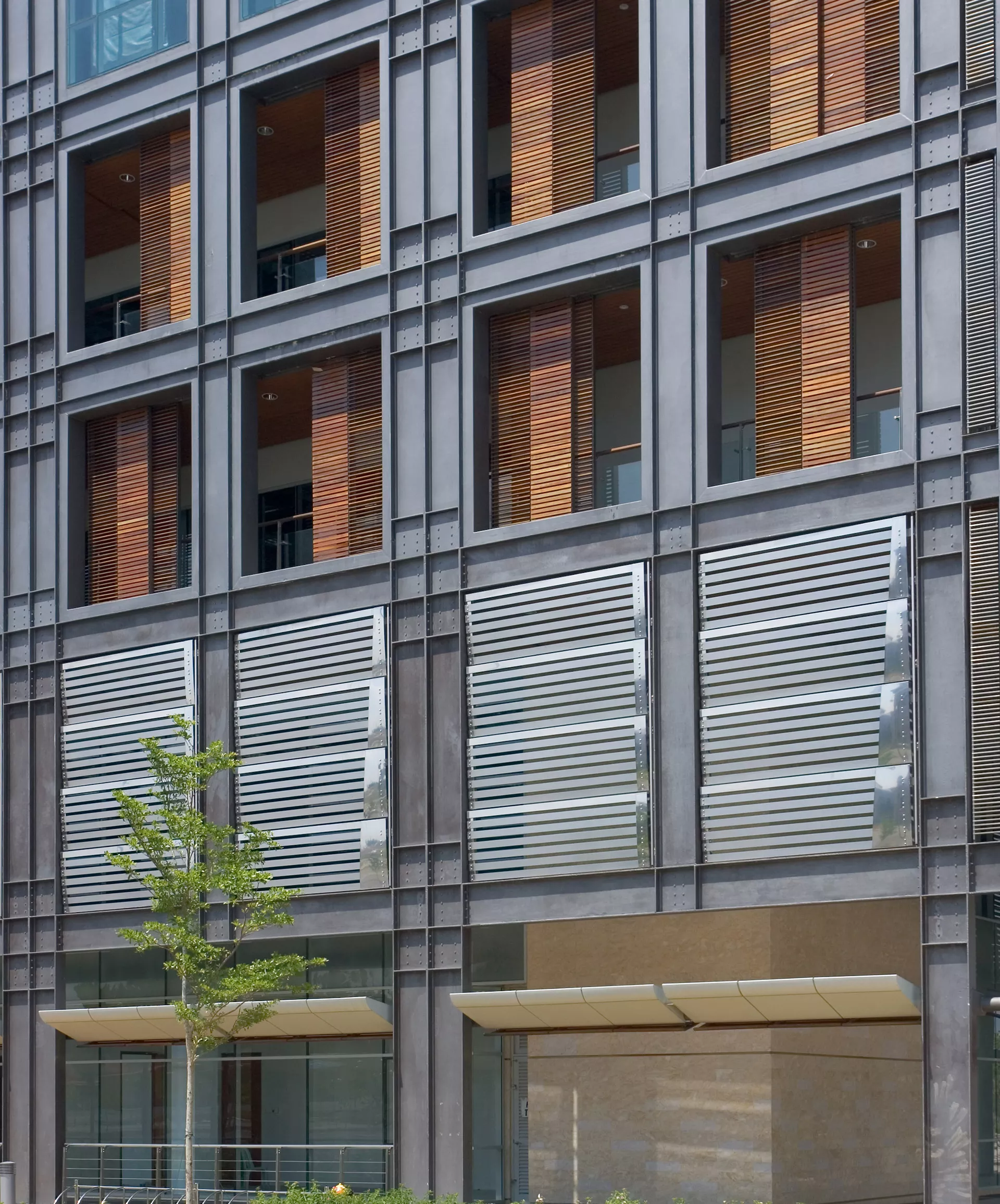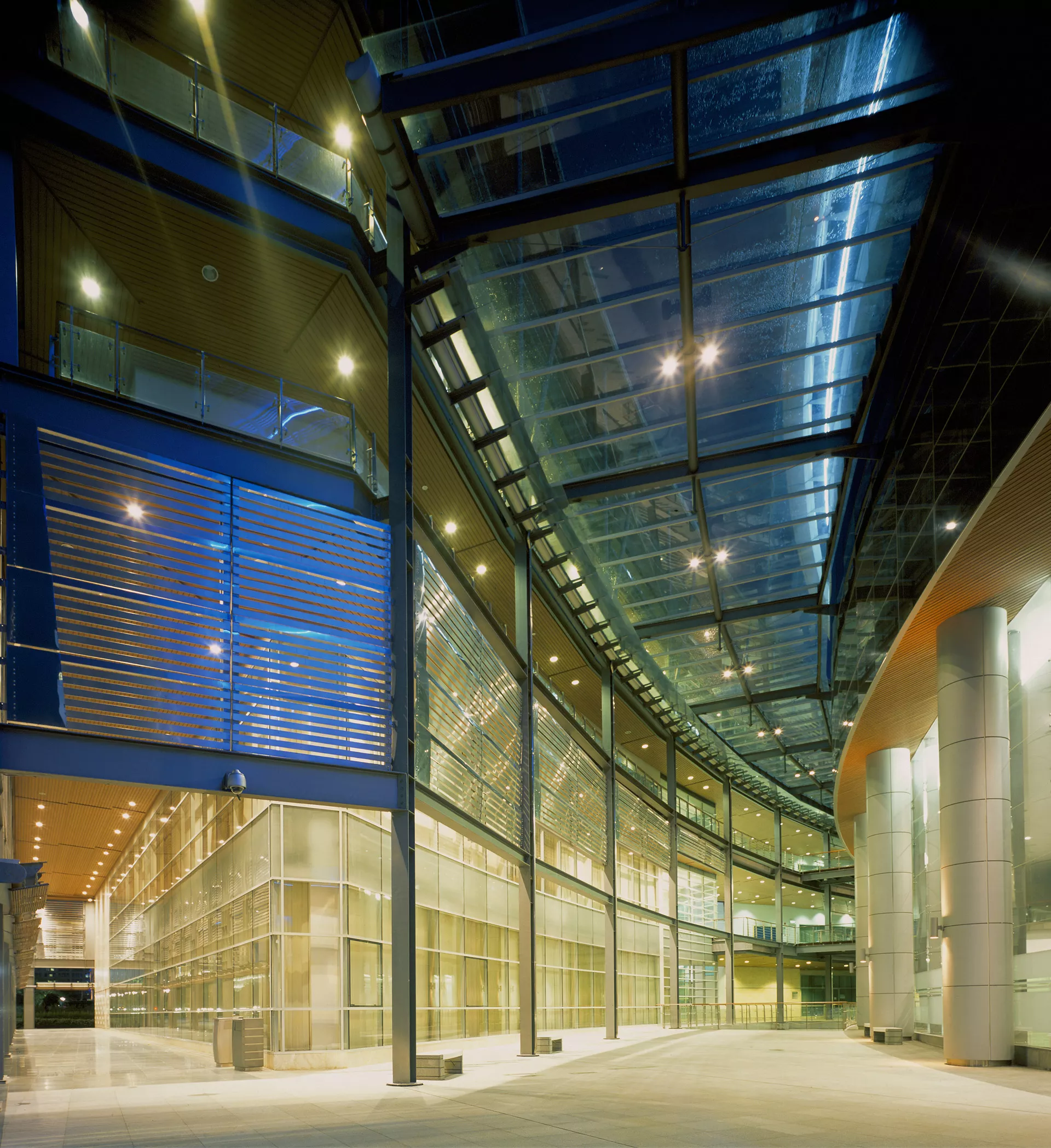 At the heart of the building, an open, sky-lit atrium is carved between tower and podium. More than a circulation void, it is conceived as an internal street—a temperate, day-brightened space that mediates between the public realm and secure government offices. Here, landscape, filtered light, and moving air converge to create a moment of calm transition, softening the boundary between civic boulevard and institutional interior.