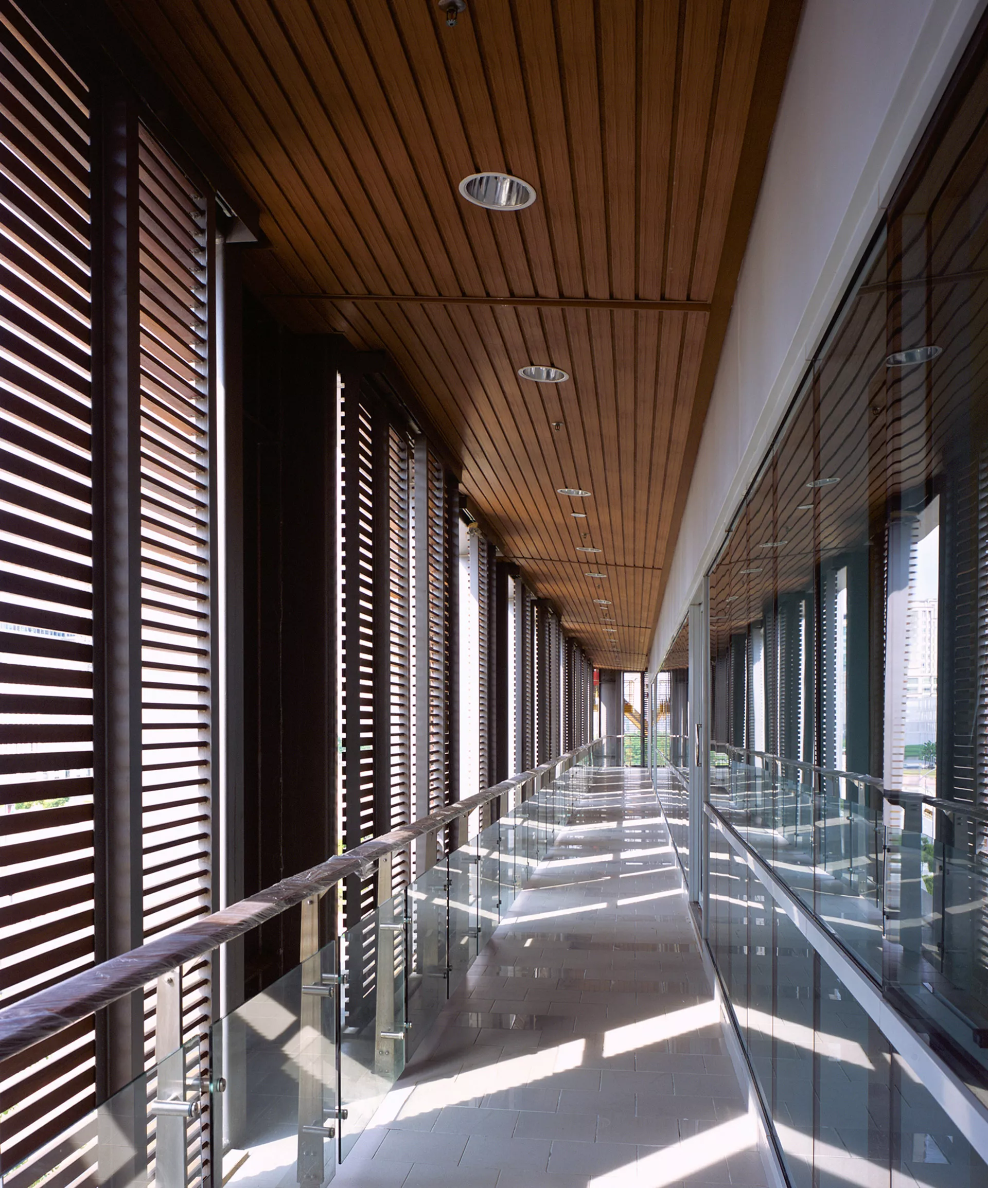 Passive design principles shape every layer of the project. A sunken garden draws daylight and natural ventilation into the basement car park, transforming a typically inert space into a cooler, more humane environment. The podium’s steel frame is veiled with timber-slatted screens that modulate brightness and shadow, giving the façade a warm, rhythmic texture that shifts throughout the day. Within the landscaped court, a surau is placed discreetly yet prominently, offering a contemplative setting that reinforces the development’s environmental and cultural sensibilities.