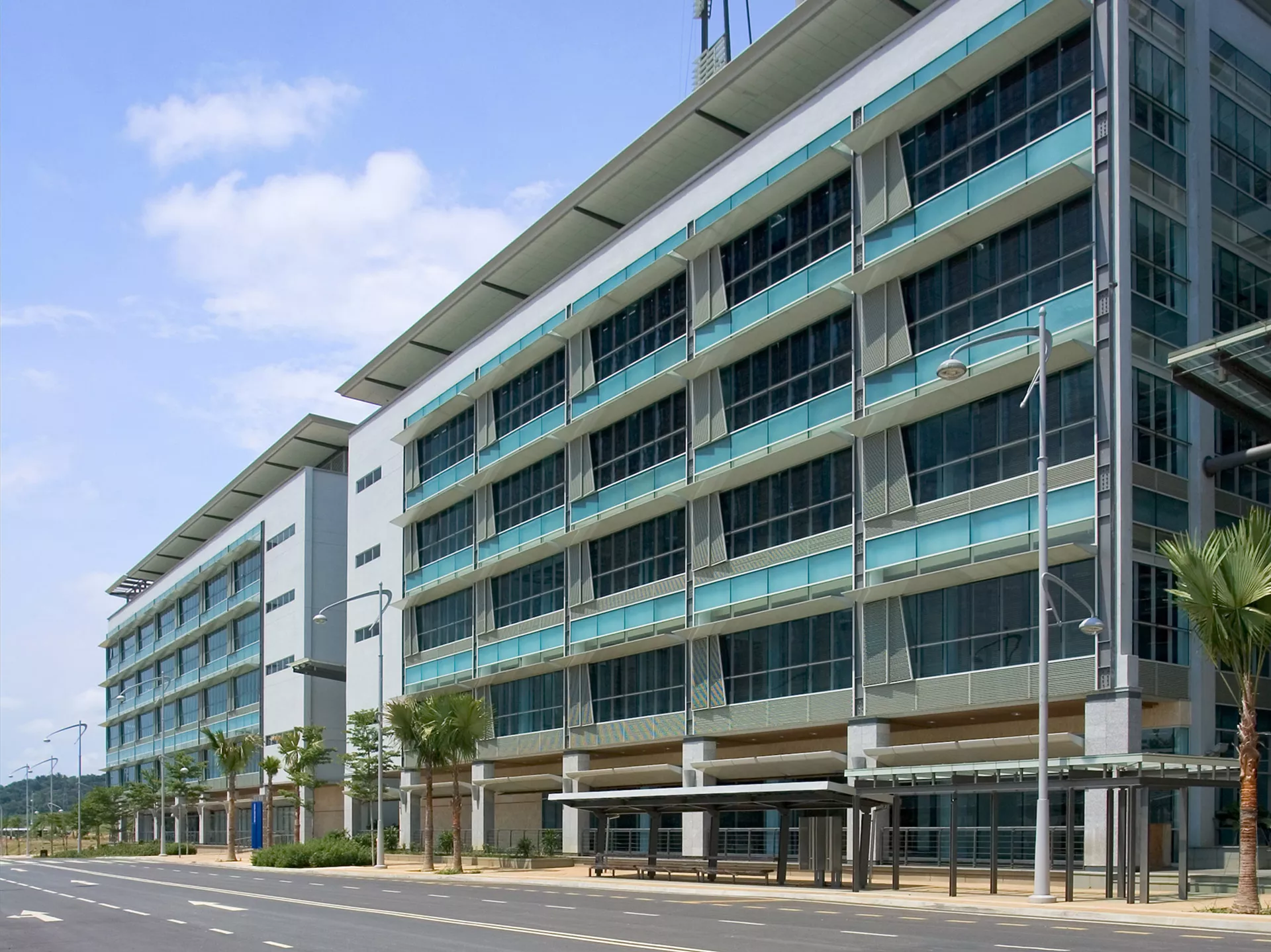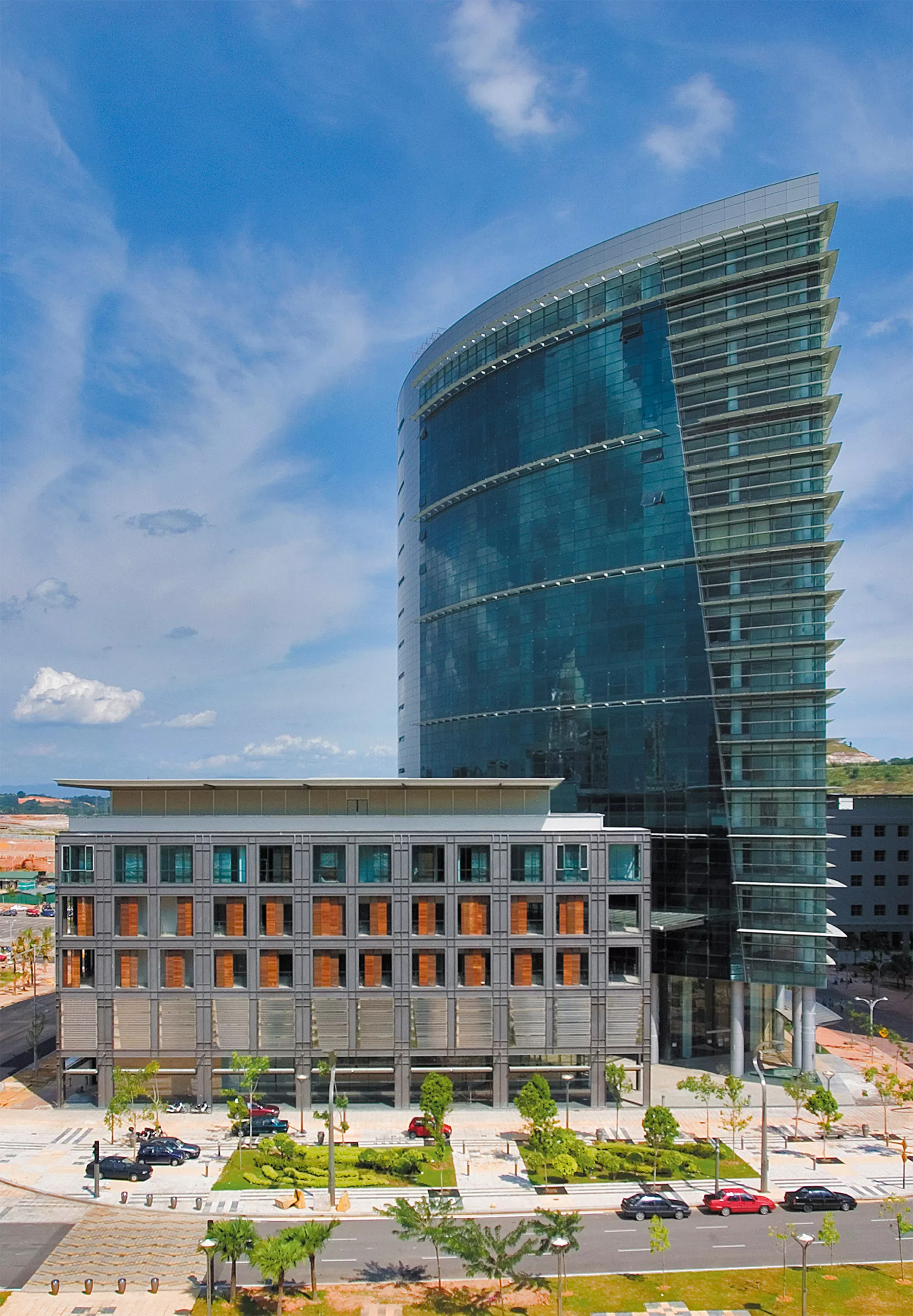 Sited at the northern end of Putrajaya’s ceremonial axis, the Ministry of Natural Resources and Environmental Sustainability offers a refined architectural response to climate, place, and civic identity. Completed in 2006 for Putrajaya Holdings, the project forms part of a quartet of ministry towers whose collective composition traces an interlocking Islamic geometric motif across adjacent lots. Within this broader urban choreography, the building establishes a gateway between the city’s formal governmental district and its emerging commercial realm.