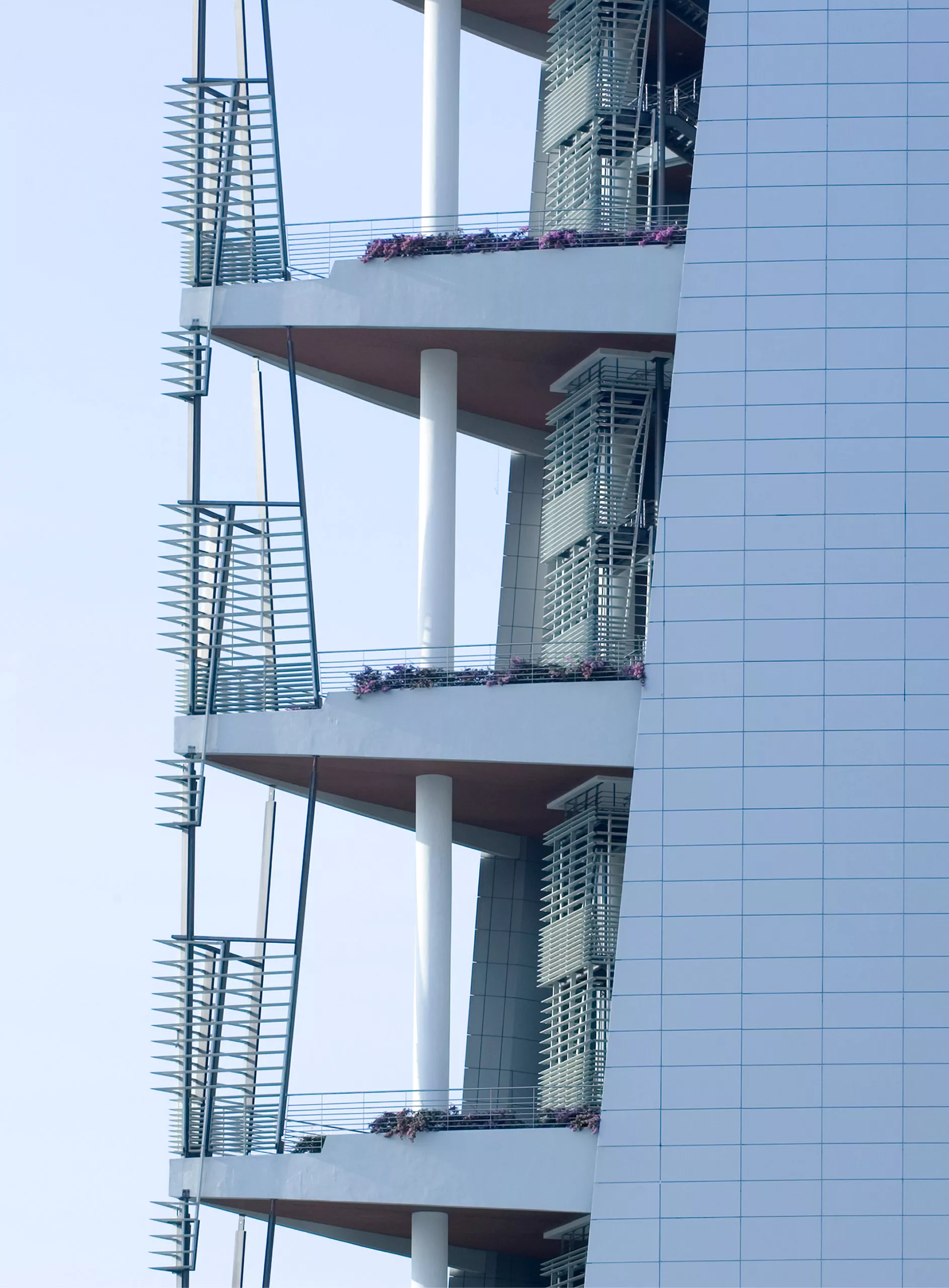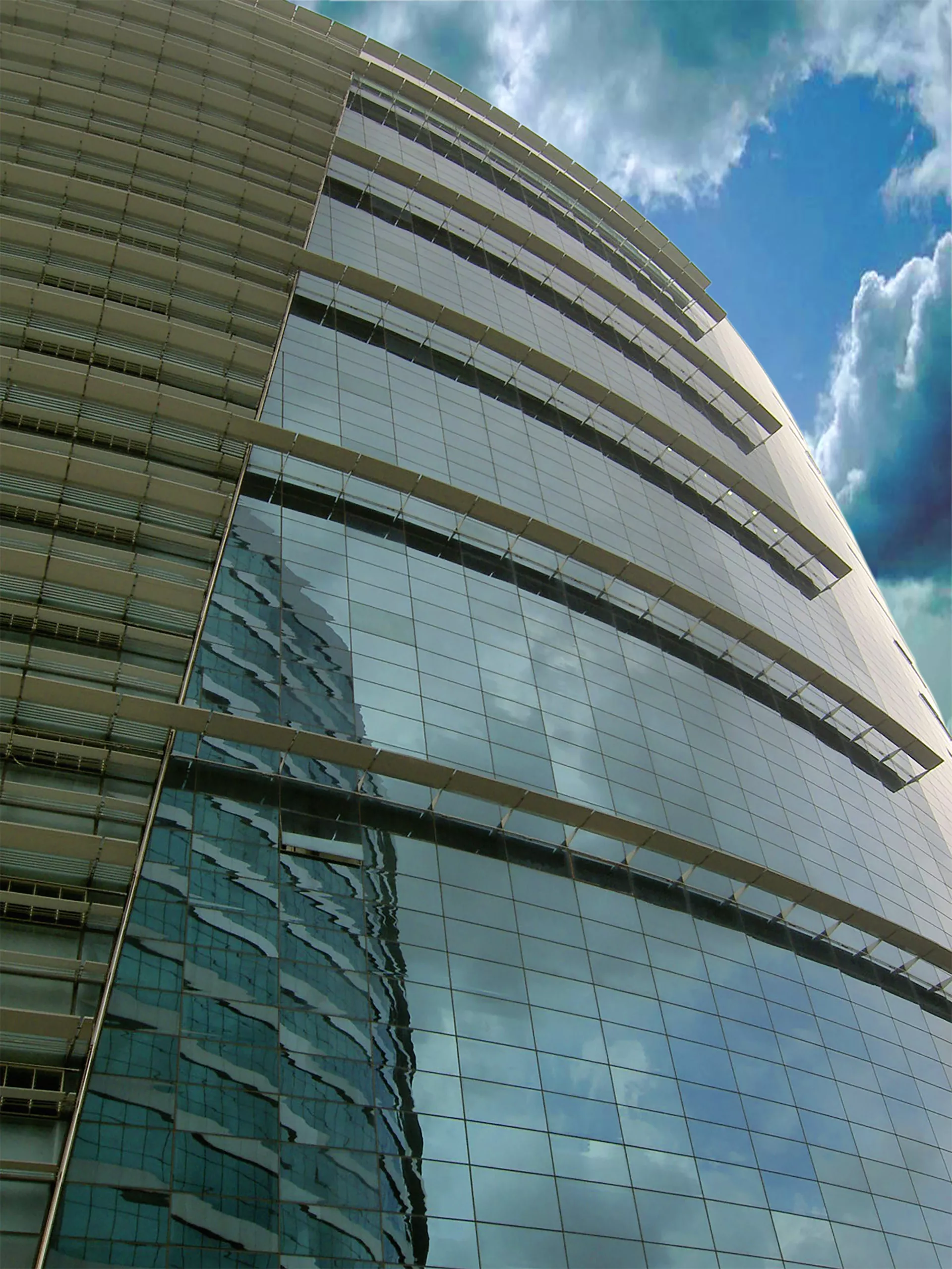 The design is anchored by an 18-storey elliptical tower rising from a 6-storey podium, a form deliberately oriented along the north–south axis to minimize heat gain. This geometry, bold yet disciplined, lends the tower a calm presence along the Central Boulevard while subtly echoing the fluidity of Islamic patterning. Meanwhile, building orientation influences the shading strategies. A finely calibrated brise-soleil shields the west façade from the harsh afternoon sun, while terraced sky gardens on the east capture the gentler morning light and bring greenery deep into the workplace.