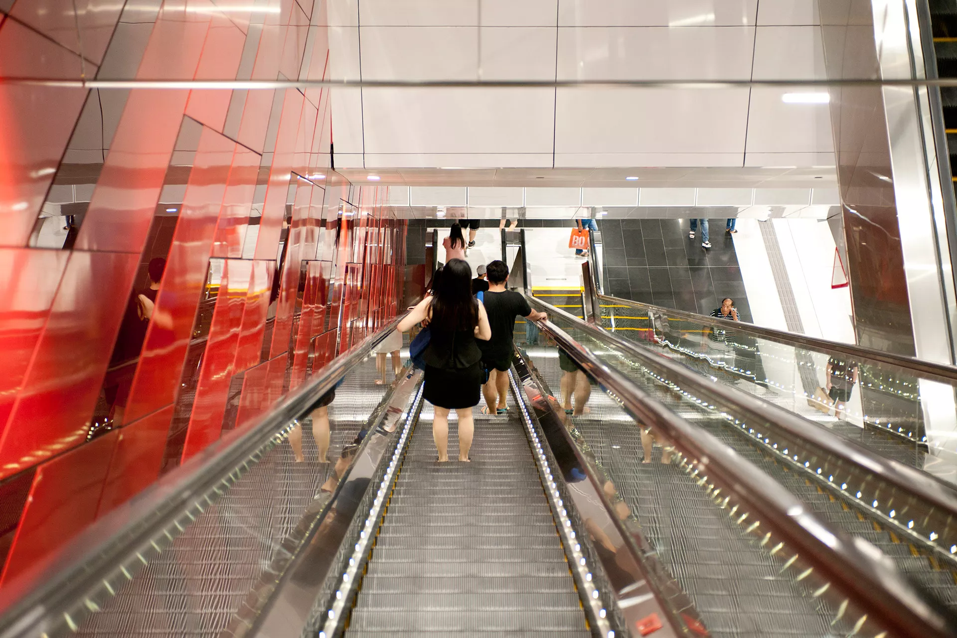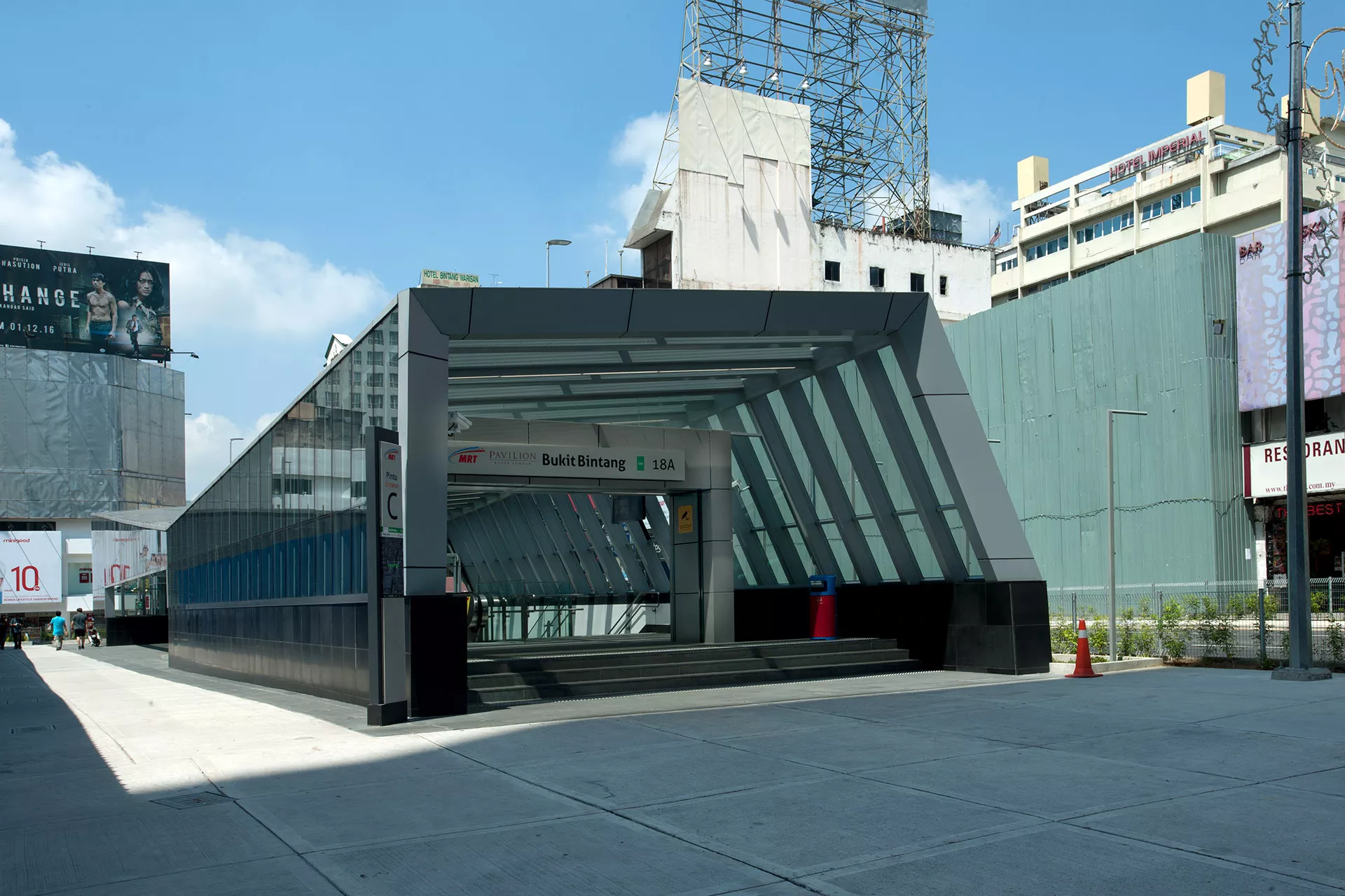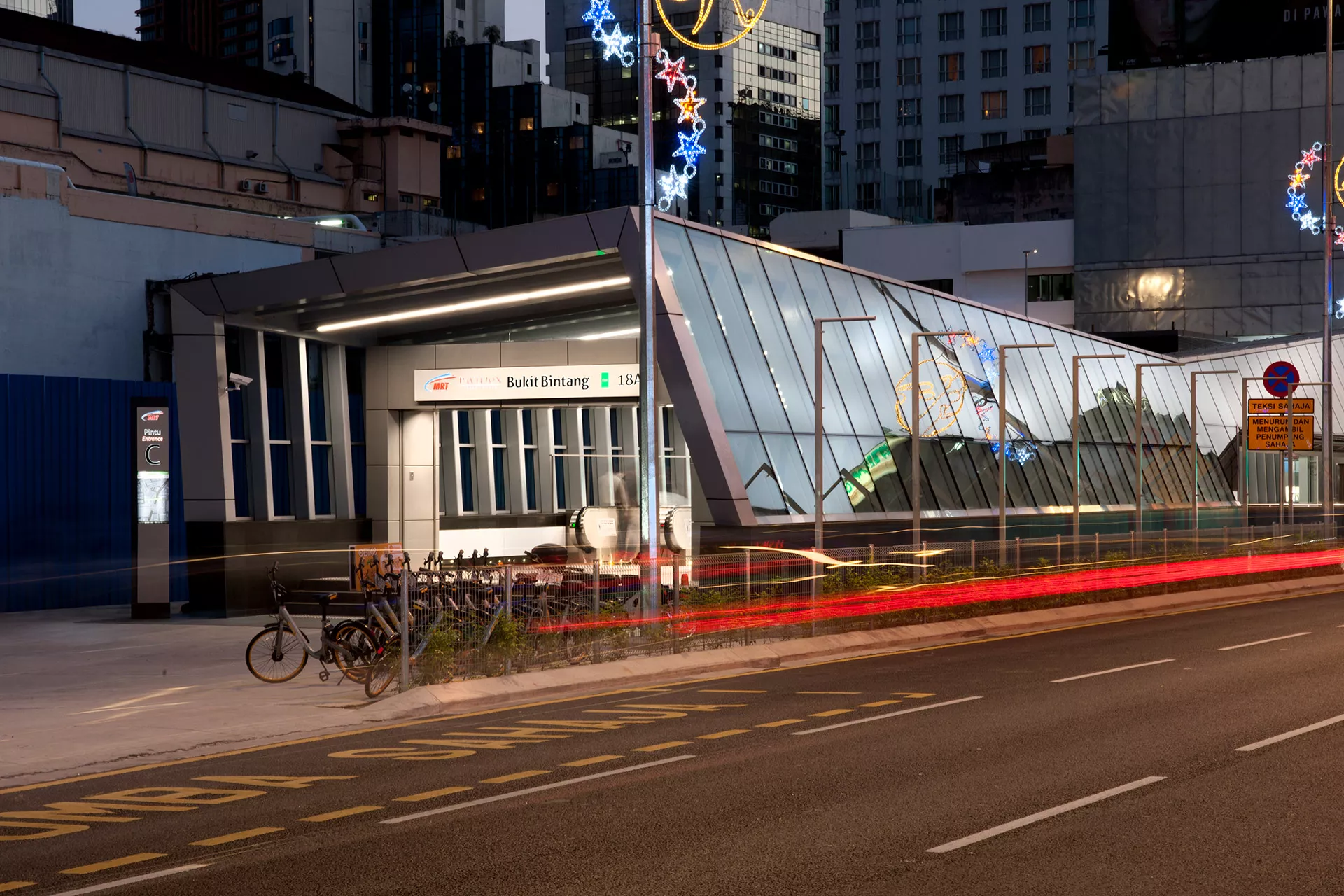 Echoing the district’s Dynamic spirit, Bukit Bintang Station translates urban vibrancy into a bold architectural expression. The energetic red trapezoidal feature wall becomes a visual anchor, capturing the motion, nightlife, and constant flux of the area. Its sharp geometry and striking colour palette evoke the pulse of the city’s commercial and cultural heart.