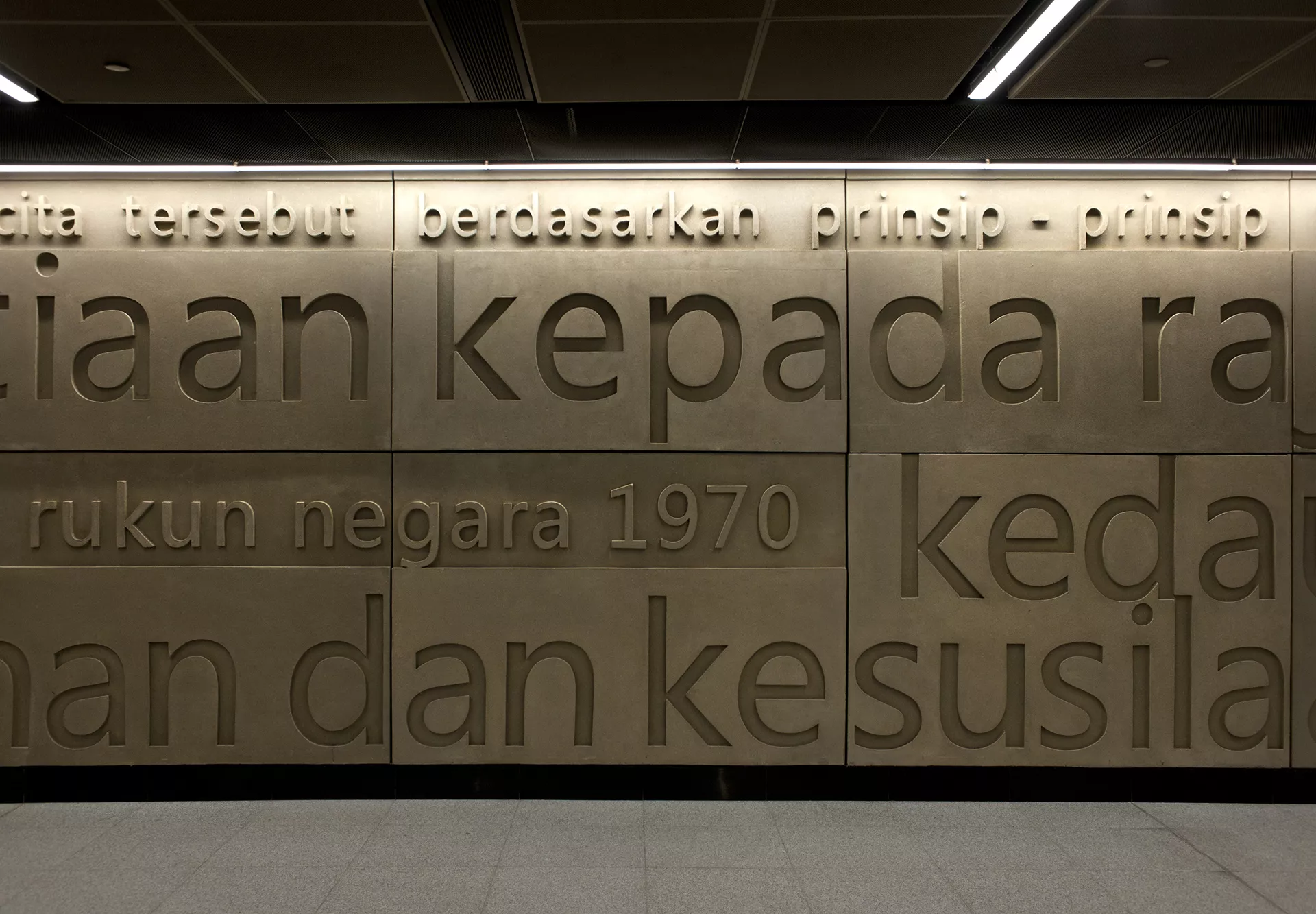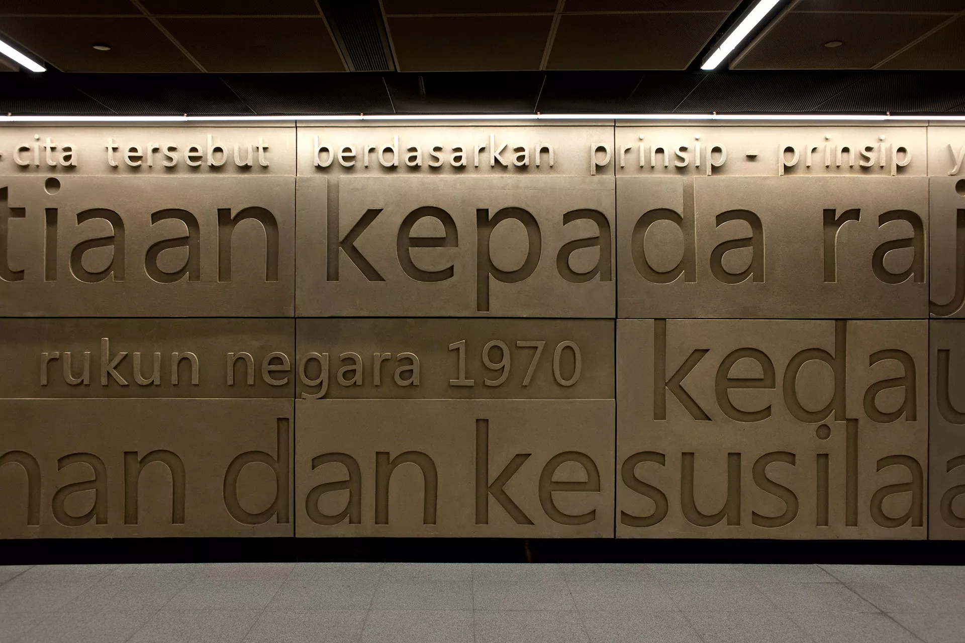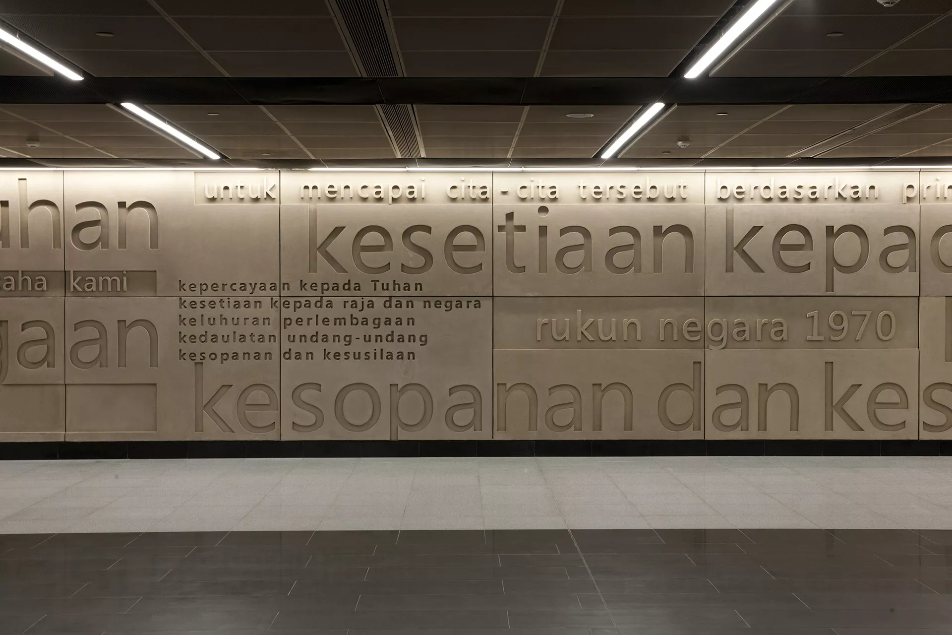 Guided by the theme of Independence, Merdeka Station integrates patriotic symbolism into its spatial and material composition. The station’s design pays tribute to Malaysia’s journey toward sovereignty through curated imagery, refined surfaces, and the engraved principles of the Rukun Negara. These elements create a contemplative environment that connects commuters with the nation’s historical and ideological foundations.