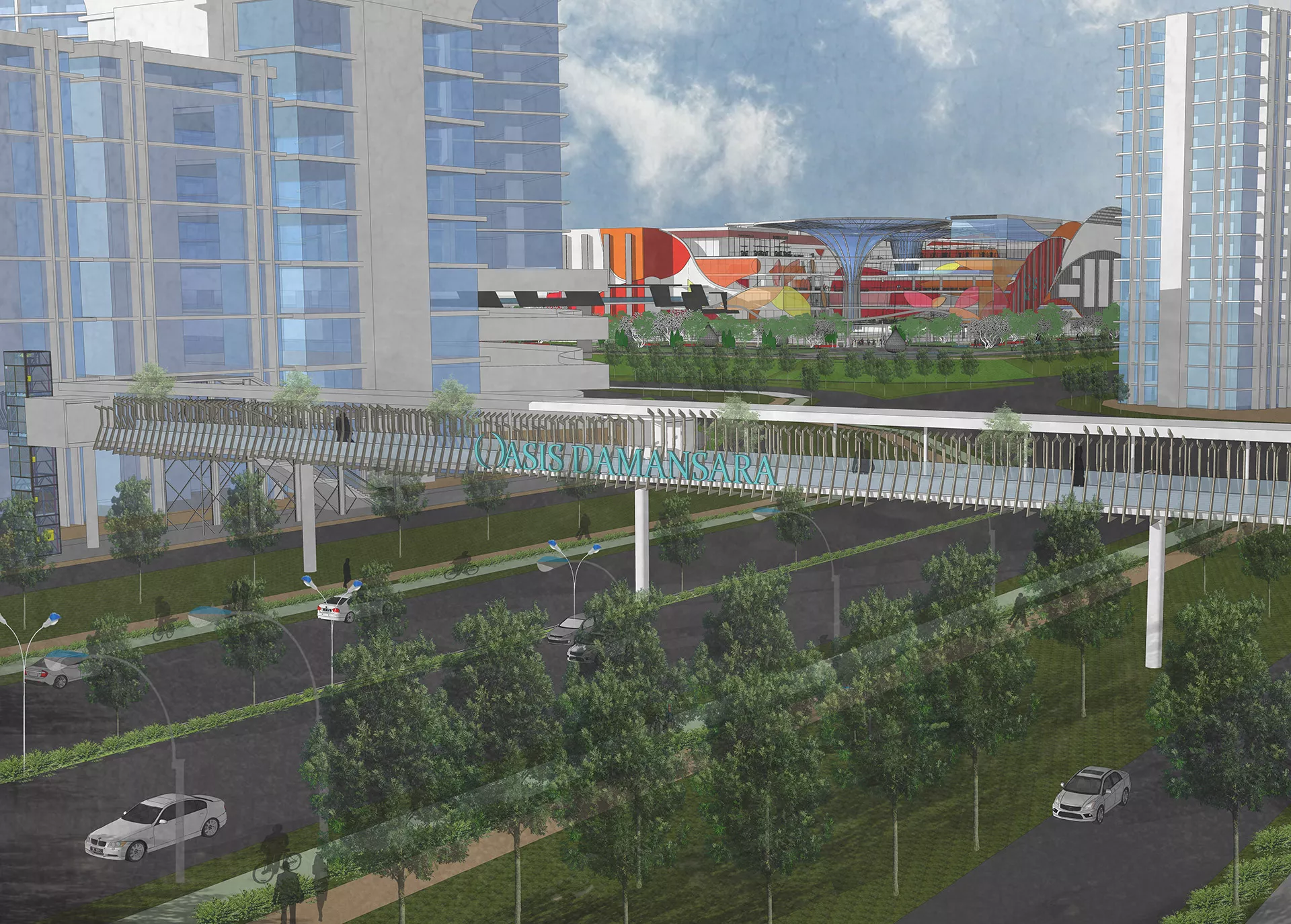 Oasis Skyline is a proposed comprehensive pedestrian network designed to transform connectivity across the entire Oasis Ara Damansara development. This network strategically links two critical transportation nodes – LRT Station 2 and a future KTMB station. The plan integrates ground-level open spaces with elevated walkways for seamless pedestrian mobility throughout the area.