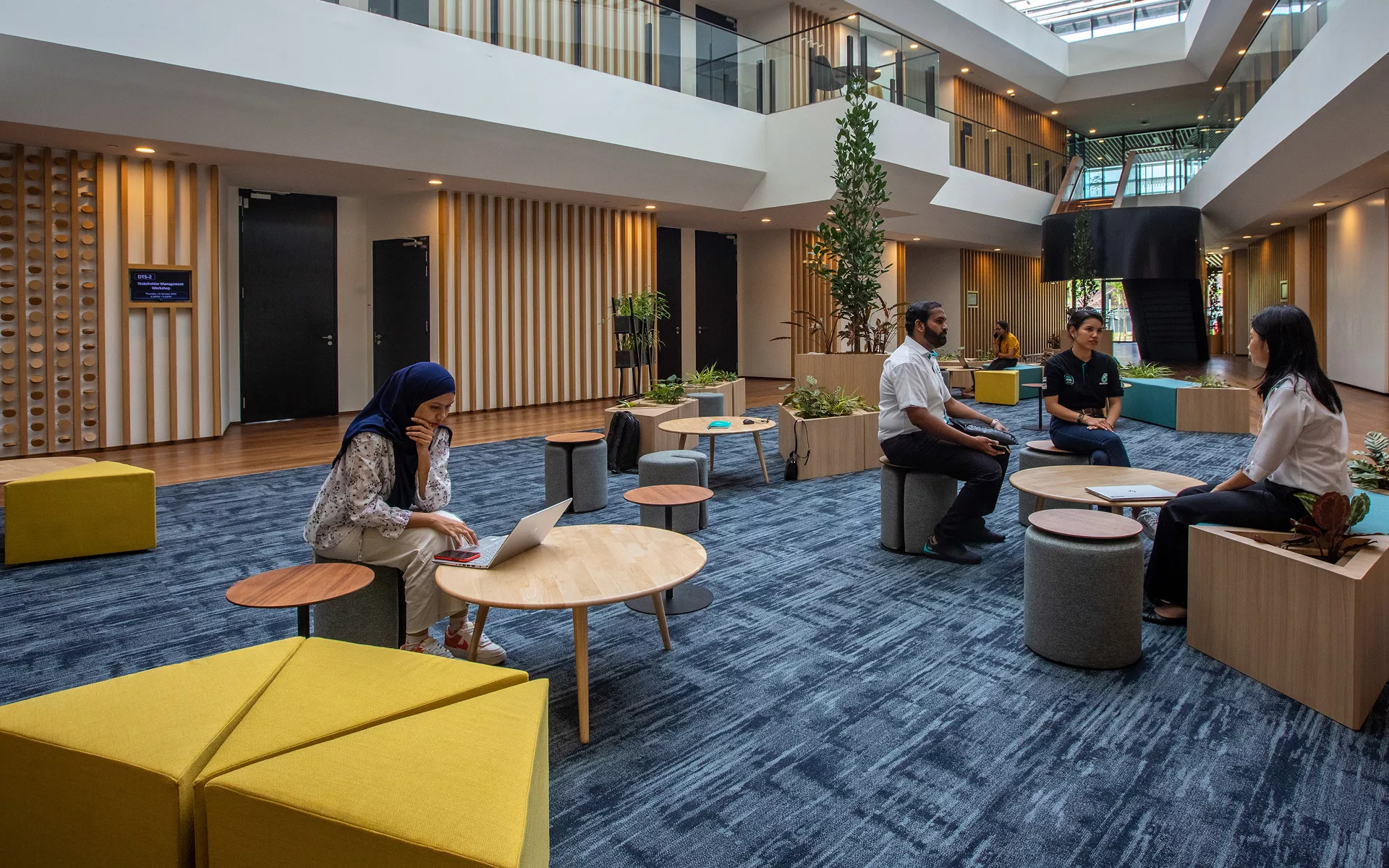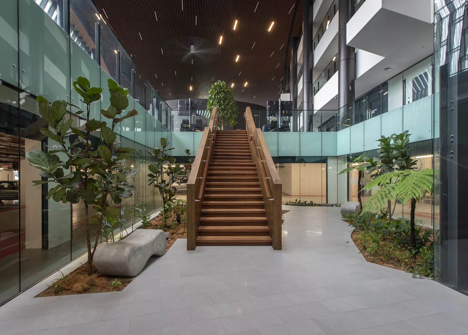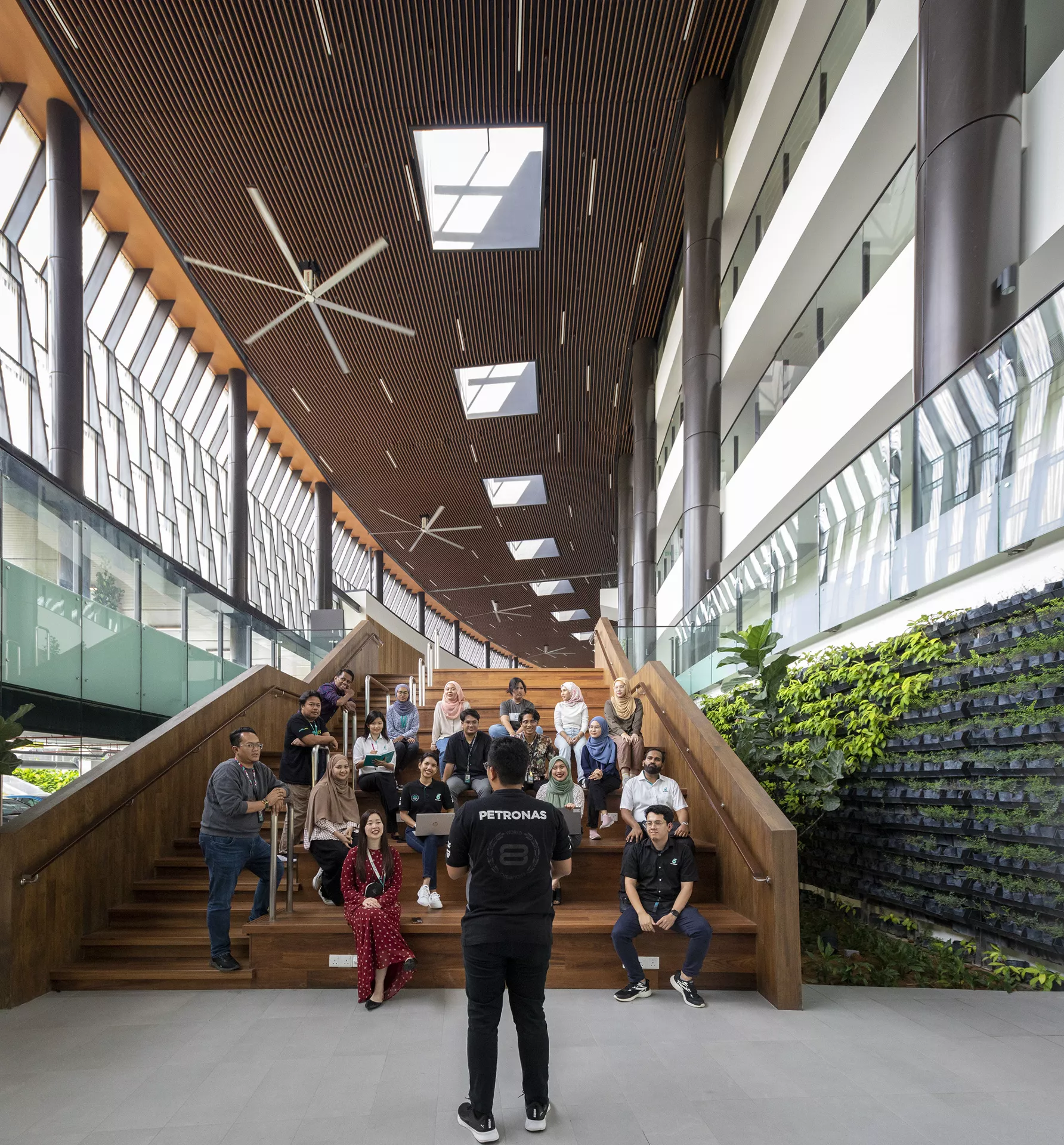 Enveloped by a sinuous four-storey green building, the interior has been thoughtfully designed to support PETRONAS’ commitment to innovation, sustainability and community. The foundation of PLC’s design approach lies in the organisational strategy of the entire building.