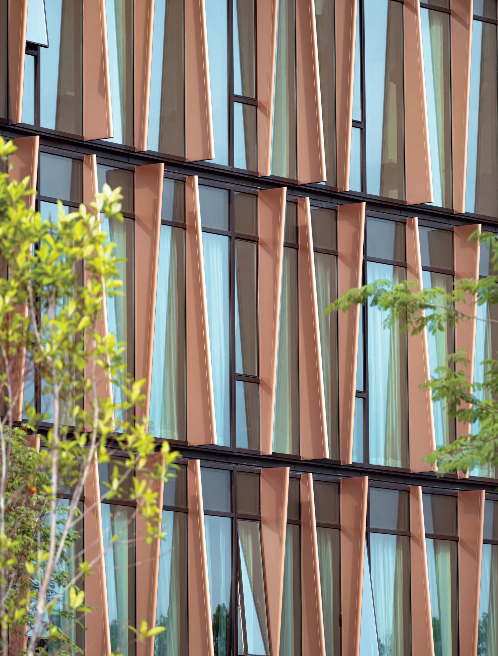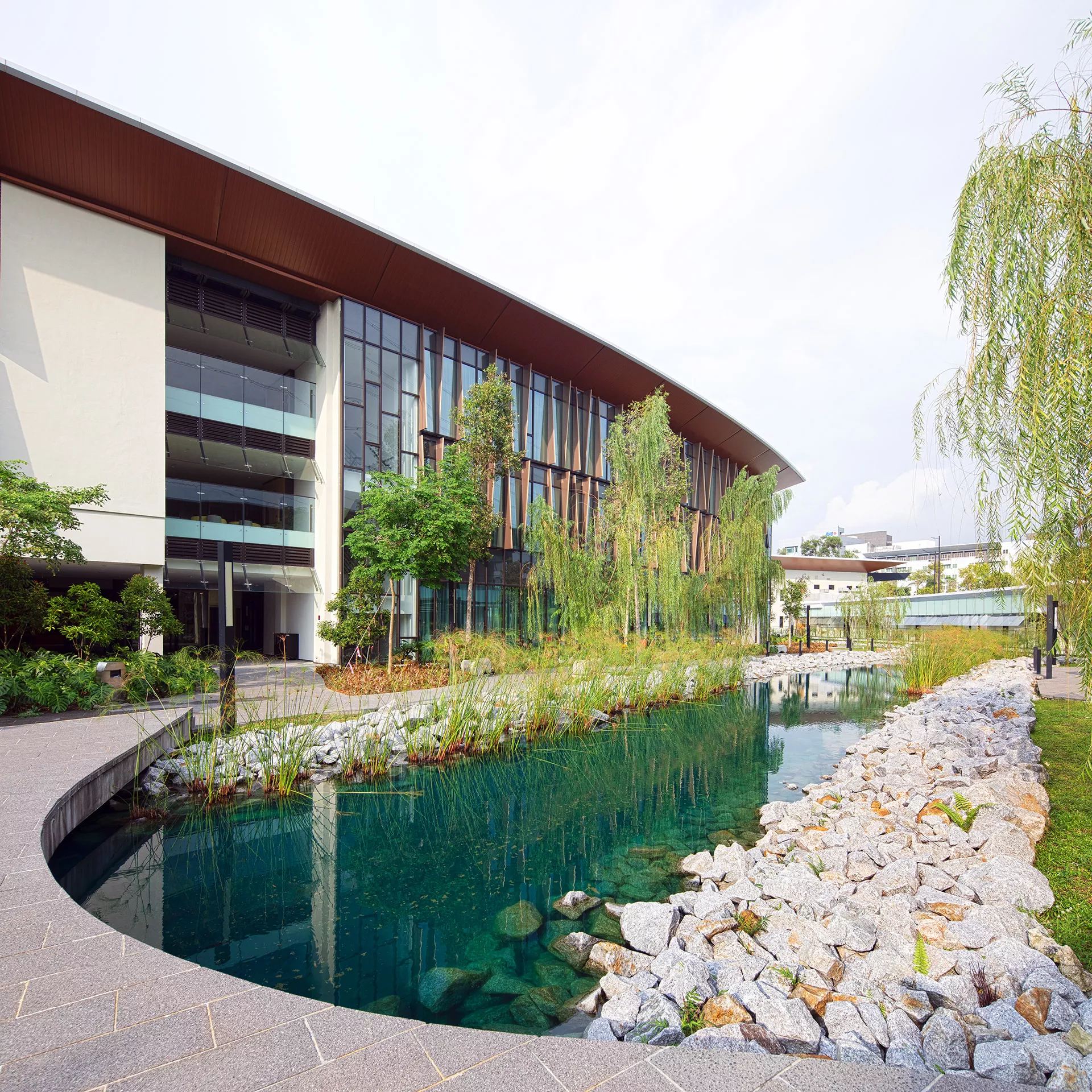 A landmark feature of the campus is the four-acre man-made lake and stream that weave through and around the building. These water features play a critical role in reducing heat island effect by lowering ambient air temperature, while becoming a supporting environment for the wildlife. Aquatic plants help purify these water bodies by absorbing pollutants such as nitrogen and phosphorus while also oxygenating the water. An aquatic realm, teeming with species of fish and other organisms, is a significant step in strengthening the campus’ ecology, further boosting local biodiversity.
