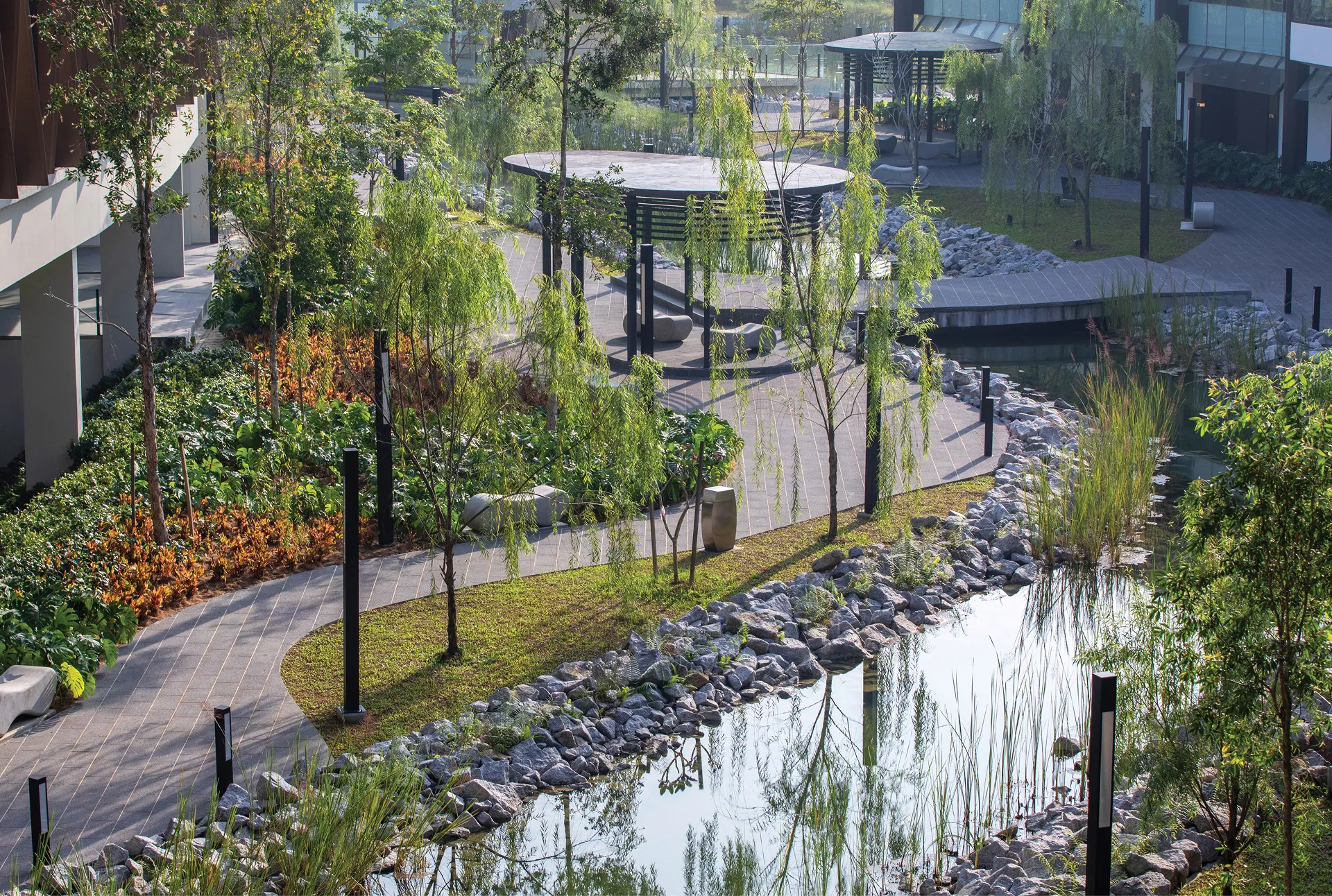 - High SRI (Solar Reflectance Index) hardscape material & man-made lake for heat island effect reduction