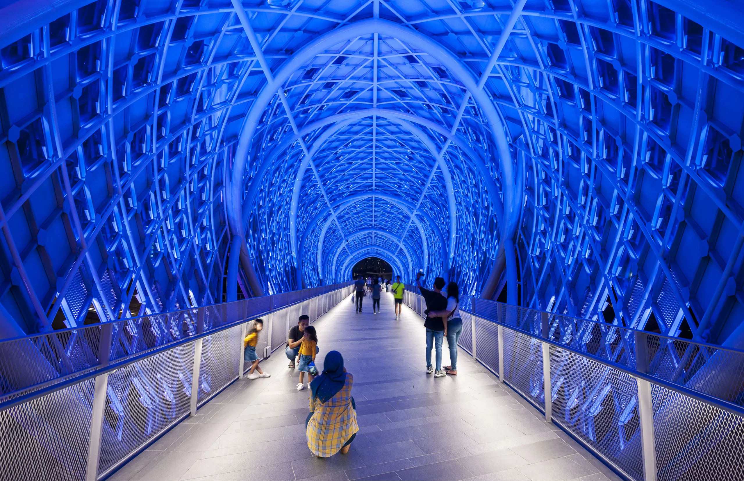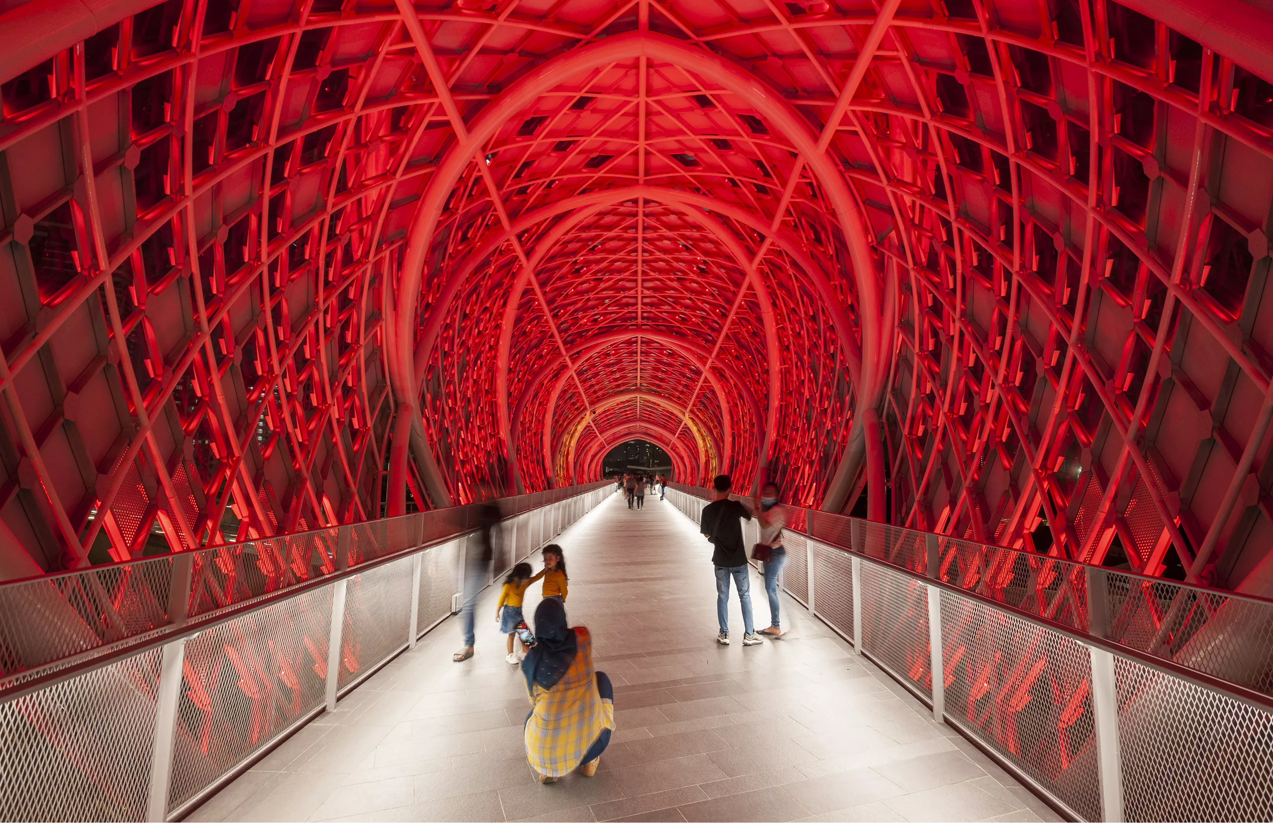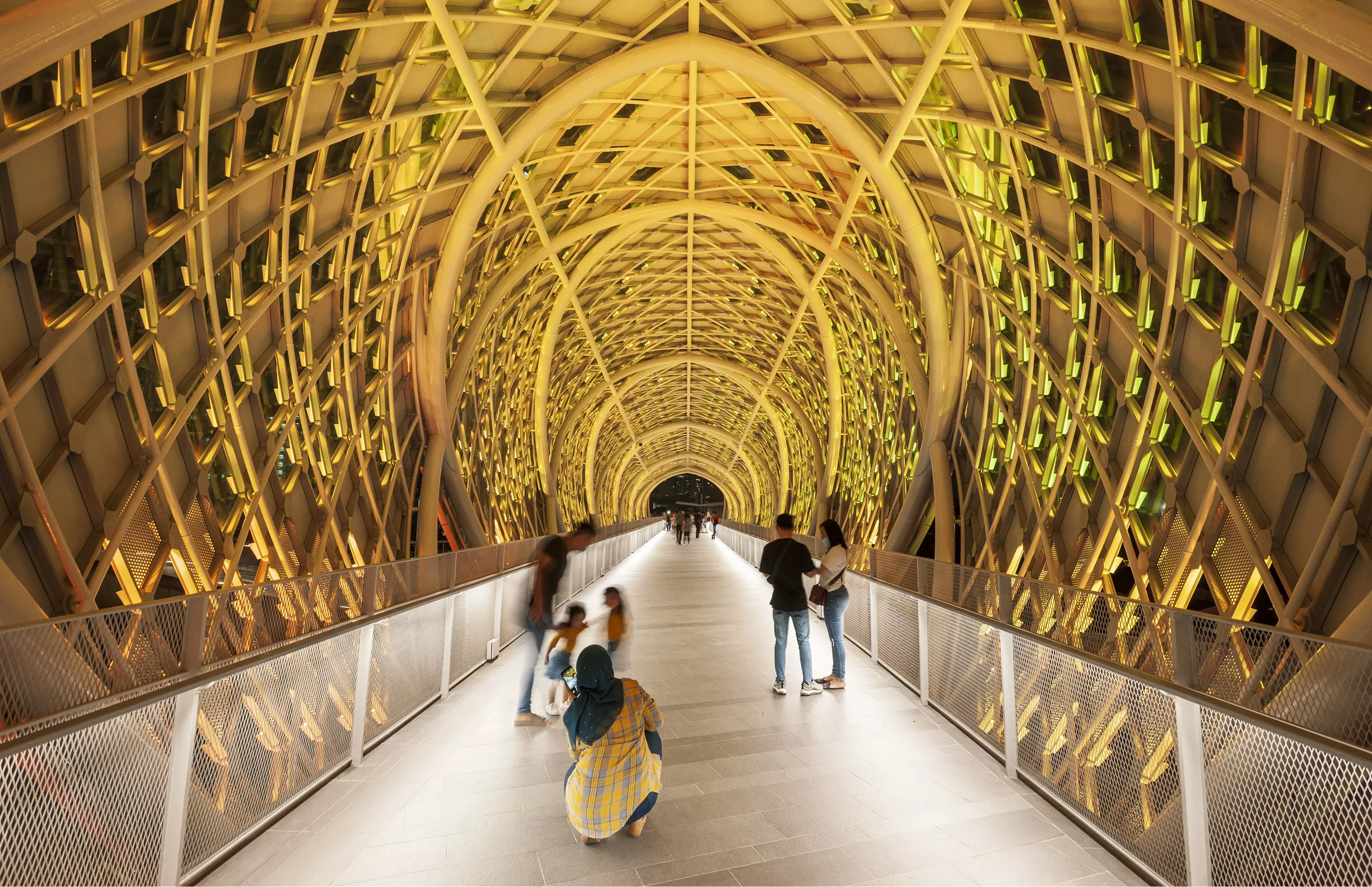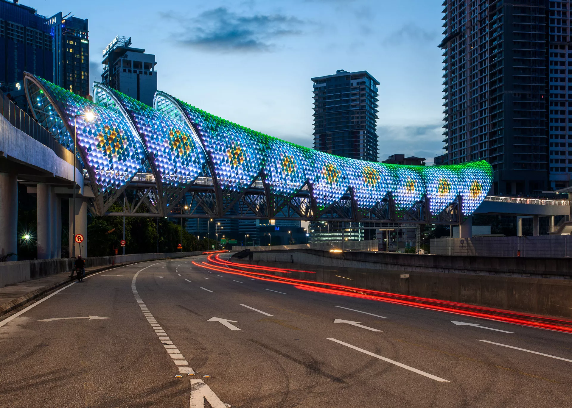 Its curved steel canopy is clad in 4,100 diamond-shaped modules composed of solid and perforated aluminum, glass and transparent panels. These panels reference motifs found in traditional Malay craft and create a dynamic interplay of light and shadow as pedestrians move through the structure. By day, the facets shimmer under reflected sunlight. And by night, embedded programmable LEDs transform the bridge into a vibrant, colour-shifting beacon visible across the city.