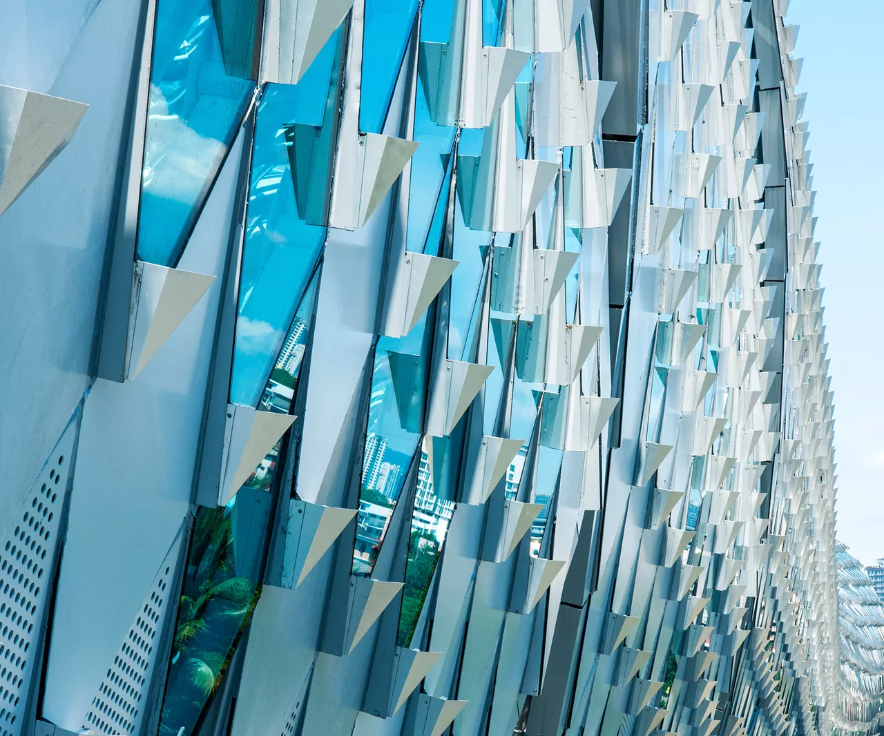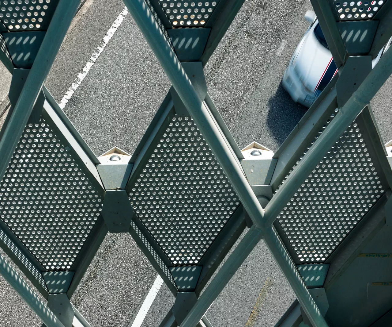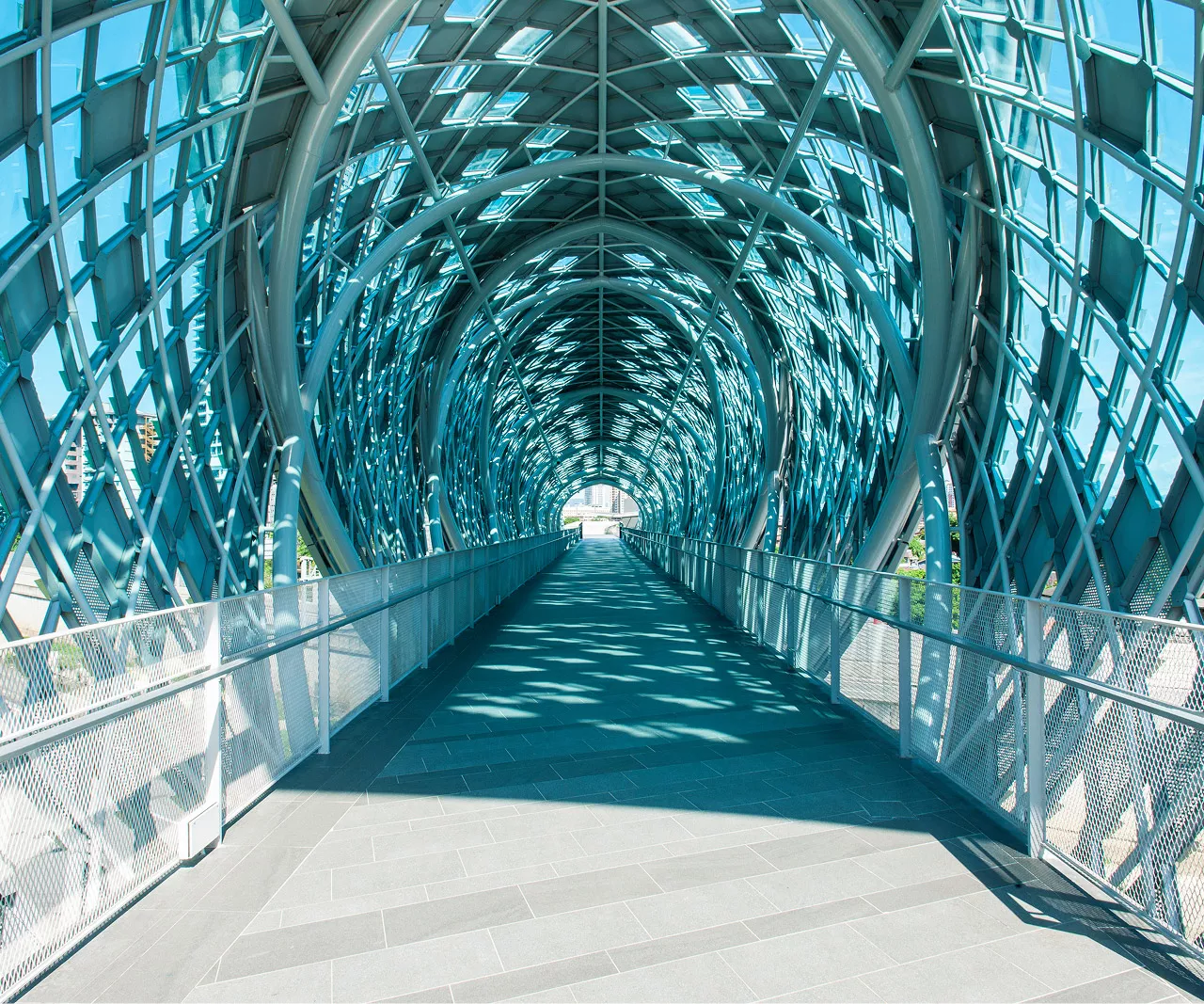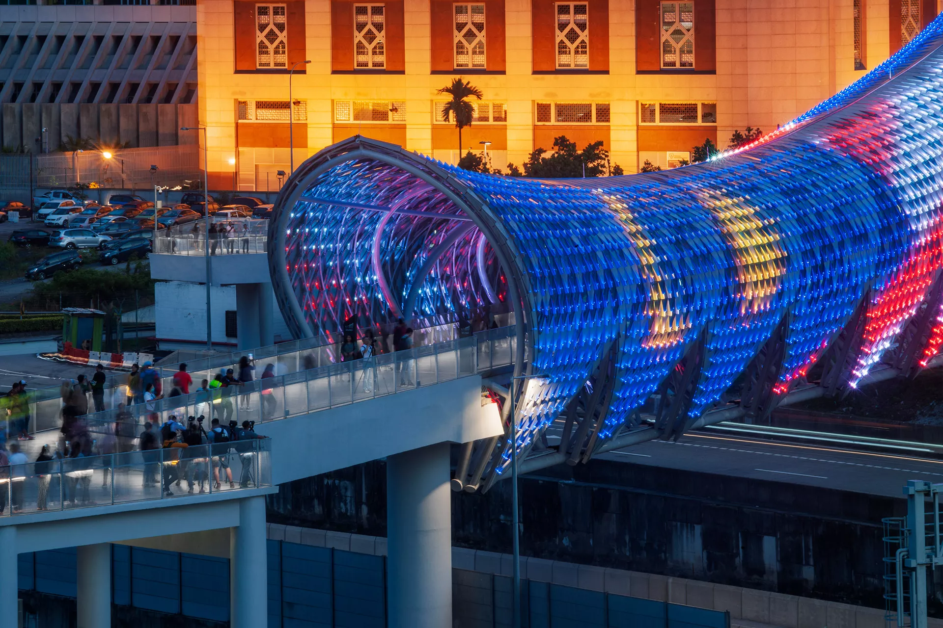 Its curved steel canopy is clad in 4,100 diamond-shaped modules composed of solid and perforated aluminum, glass and transparent panels. These panels reference motifs found in traditional Malay craft and create a dynamic interplay of light and shadow as pedestrians move through the structure. By day, the facets shimmer under reflected sunlight. And by night, embedded programmable LEDs transform the bridge into a vibrant, colour-shifting beacon visible across the city.