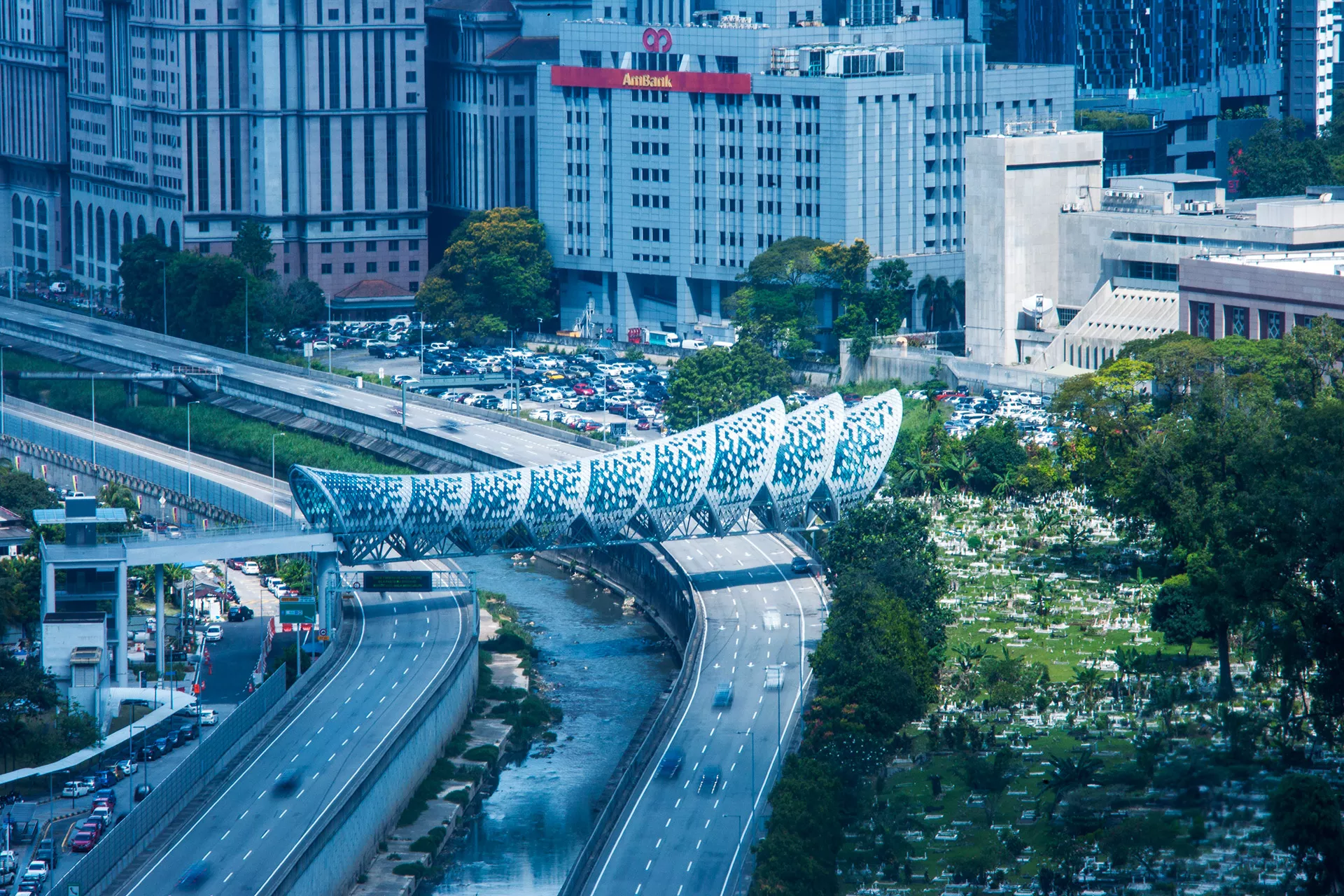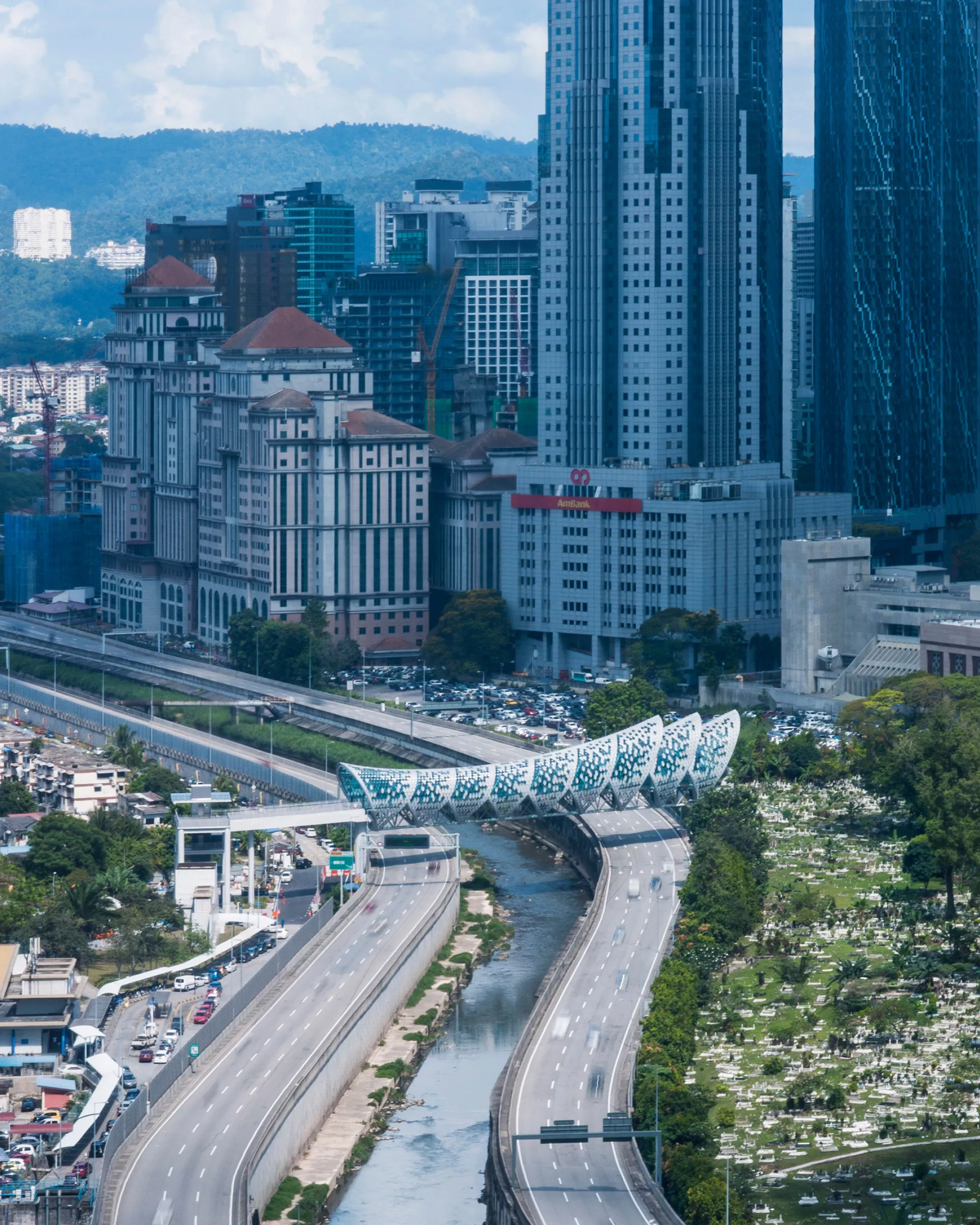 The Saloma Link is a landmark pedestrian connection that threads across the Klang River and the AKLEH highway, uniting two distinct realms of Kuala Lumpur: the historic, village-scale fabric of Kampong Bharu and the contemporary skyline of the KLCC precinct. As both an infrastructural intervention and a cultural gesture, the link completes a long-missing pedestrian connection while reframing the city’s urban experience through walkability, heritage, and visual spectacle.