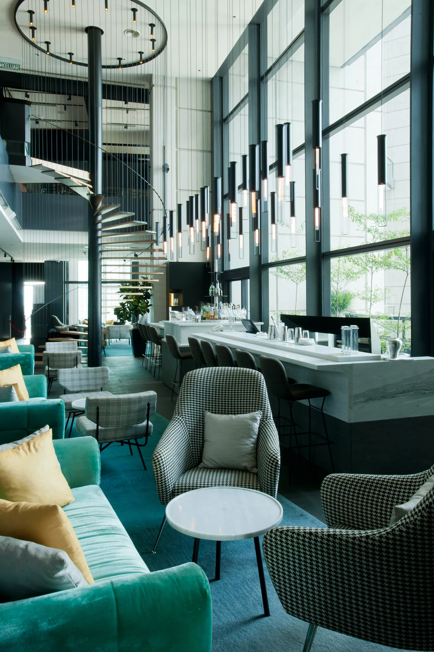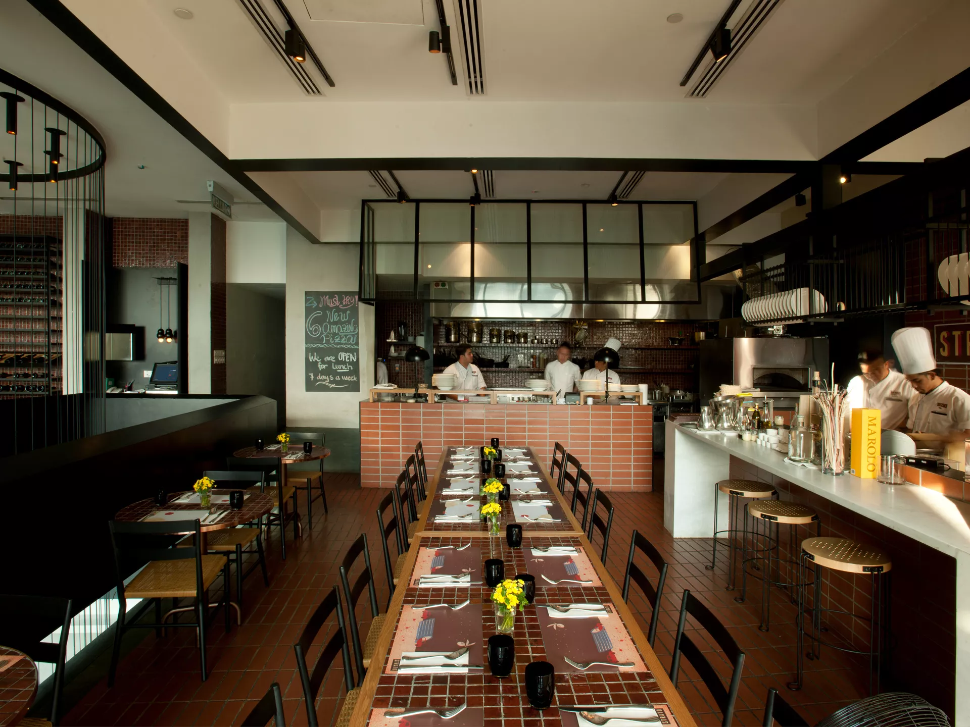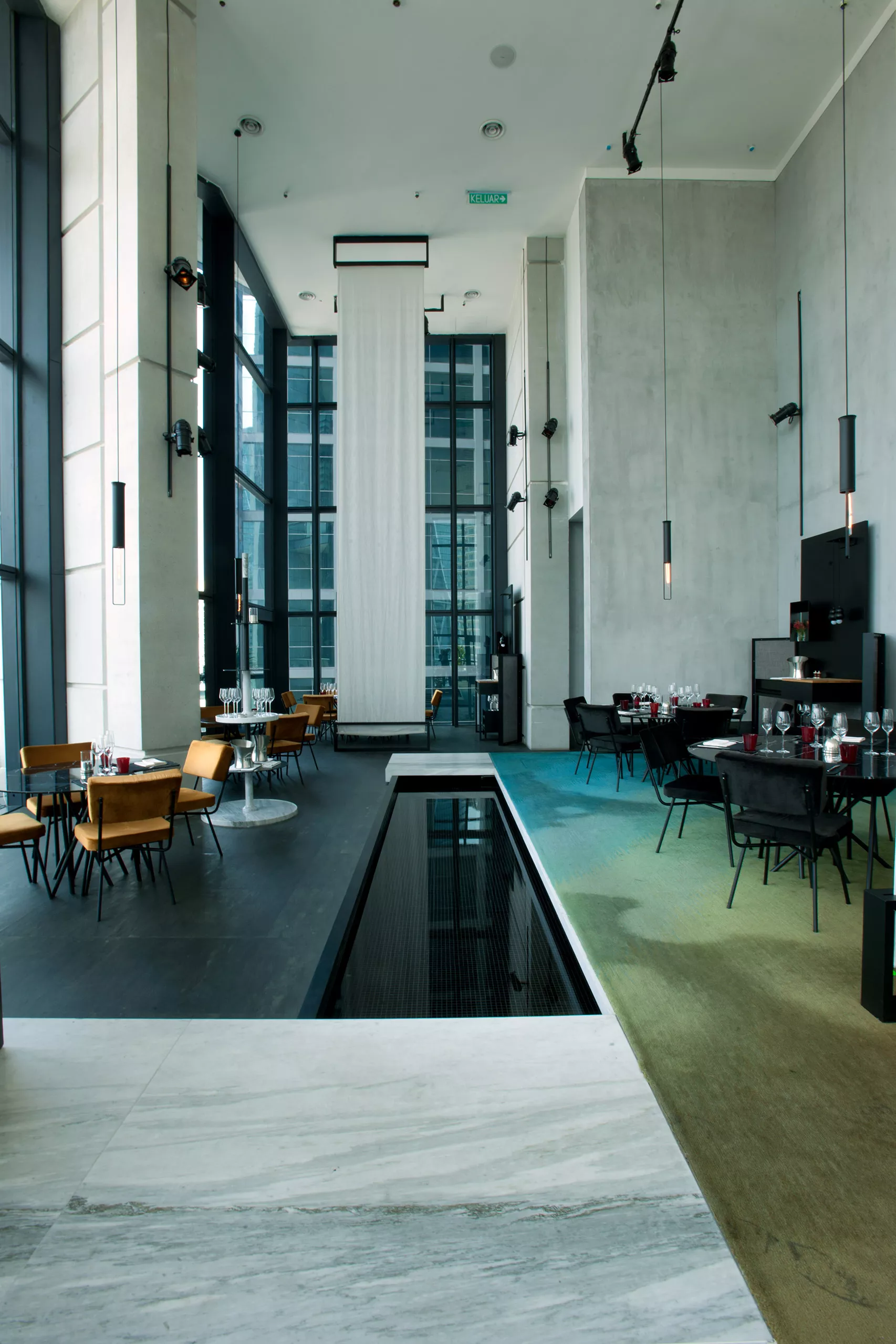 Nestled atop the iconic Norman Foster building, Strato at Troika Sky Dining on Level 23 redefines elevated dining with a bold, double-volume interior design concept that unfolds as a continuous spatial journey. Designed as a series of intimate corners, bridges, and gantry-like walkways, the restaurant offers layered dining experiences within a fluid, open volume.