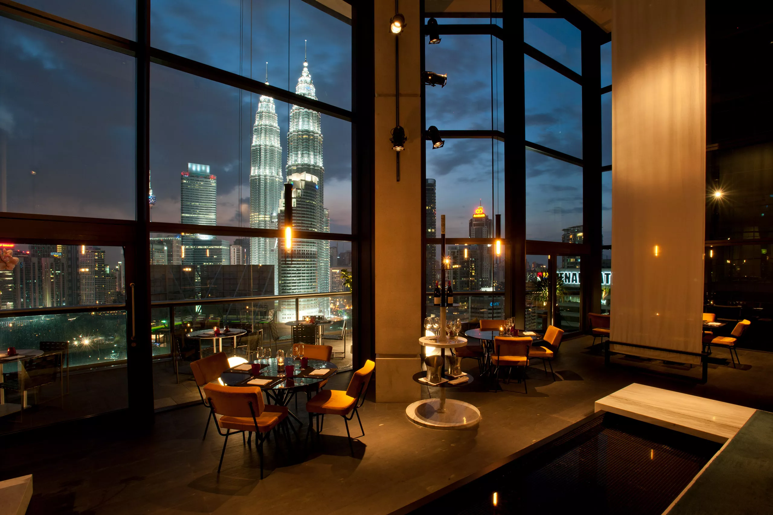 Wine rooms and drinks bars break this flow, revealing new views while introducing key spatial moments to the diners. Further along the pathway, a raised marble platform floats above a reflective pool, creating a dramatic yet serene dining setting. Ambient lighting and copper-accented furnishings add depth to the experience, anchored by a bold, black-painted steel and timber floating spiral staircase. The executed design plays with contrast and flow, complimented by the spectacular sweeping views of the Kuala Lumpur skyline.