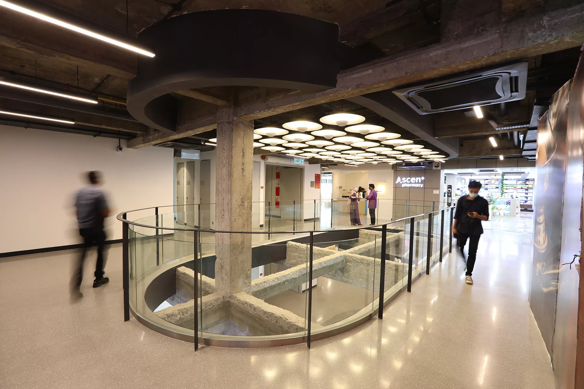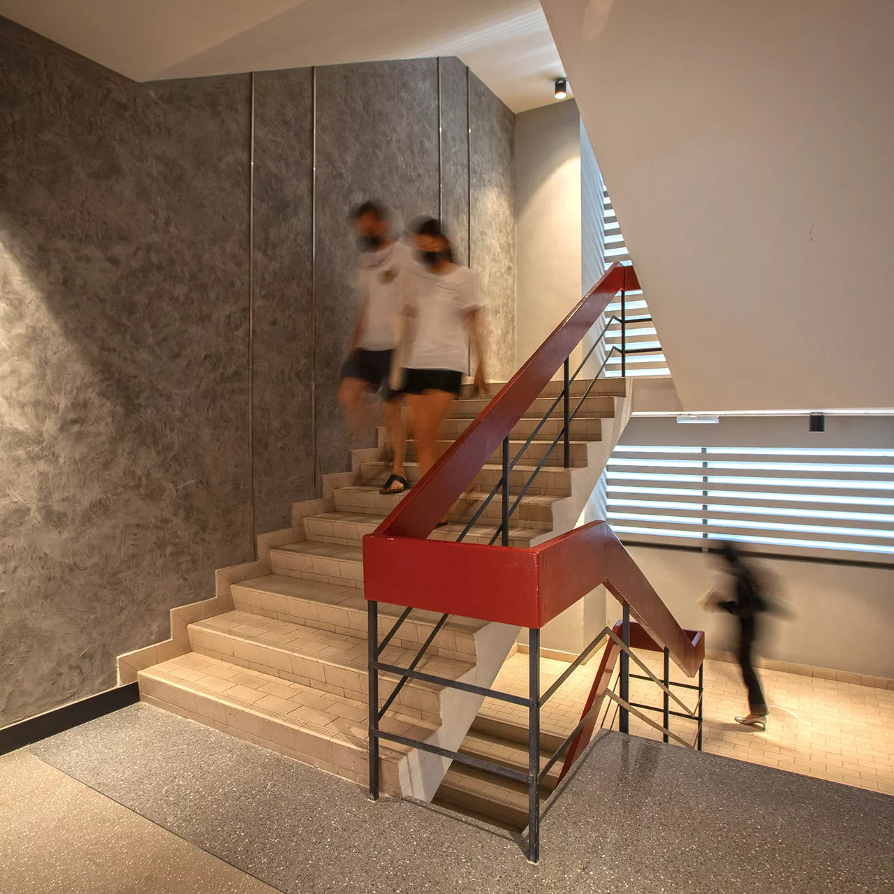 The interiors maintain a neutral, minimalist palette that emphasizes materiality and spatial clarity. Terrazzo floors, exposed concrete slabs, and visible service elements form a restrained backdrop for a curated mix of 15 boutique tenants. Color is reserved for wayfinding and tenant fit-outs, allowing each outlet’s identity to animate the atrium and circulation spaces. The combination of simple finishes, open circulation, and carefully choreographed sightlines transforms the formerly rigid office blocks into a lively, human-centric environment that encourages interaction, leisure, and community engagement.