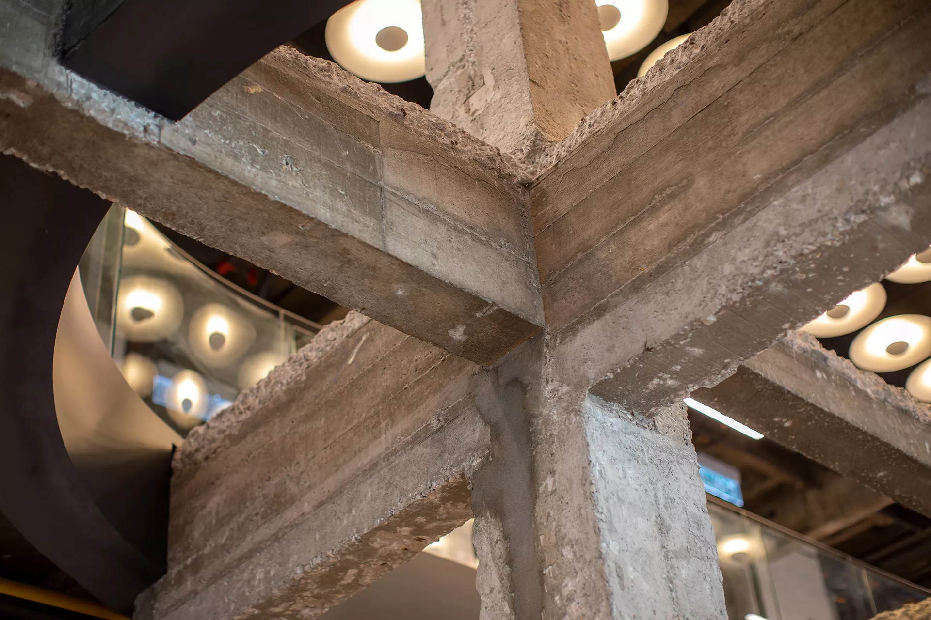 A carved atrium through the lower floors exposes the original structural frames, establishing intuitive wayfinding and fostering vertical connectivity. The double-height atrium encourages visual and physical permeability between floors, while terraces and canopies introduce light and outdoor experiences.