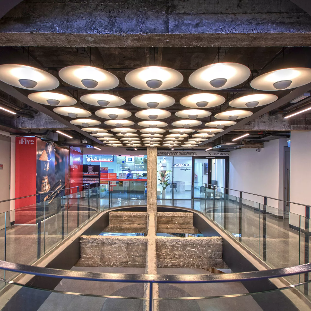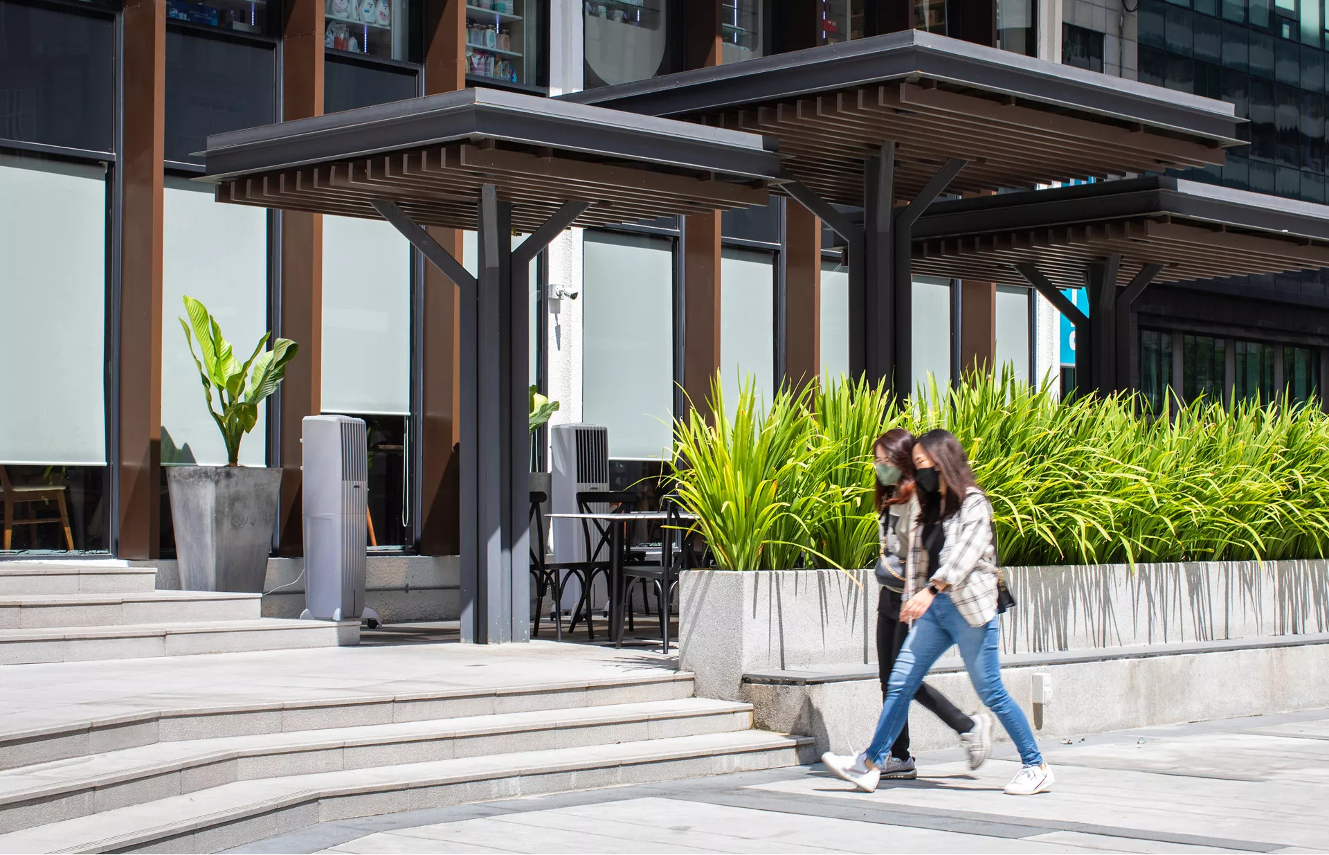 A double-storey volumetric steel-and-glass box marks the new frontage, with curtain-wall elements creating transparency and visual connectivity between the plaza and interior retail. A generous public esplanade replaces concrete fences, complemented by terraces, canopies, and alfresco dining spaces. The façade is refined and pared back, with concrete fins and ledges selectively removed, enhancing daylight penetration and ensuring the new activities are legible from the exterior. Sculptural “umbrella” decks punctuate the plaza, functioning as both public art and functional shading, while the simplified roofline and clean parapets give the ensemble a contemporary, refreshed presence.
