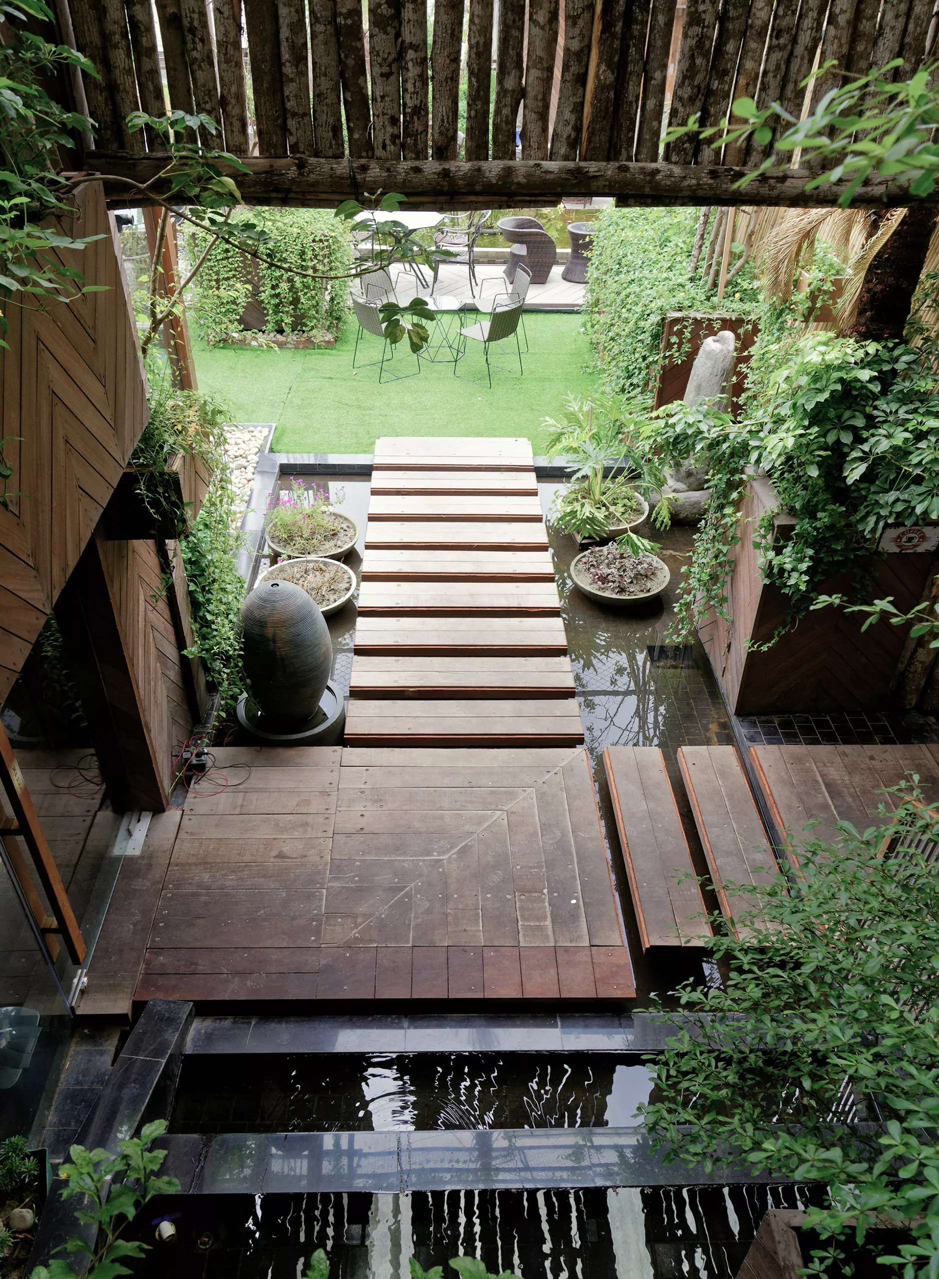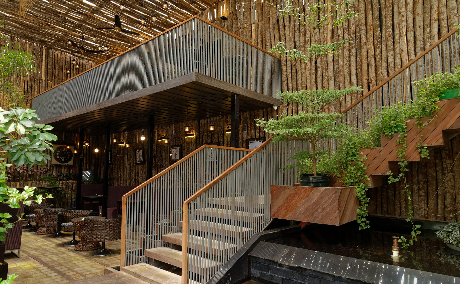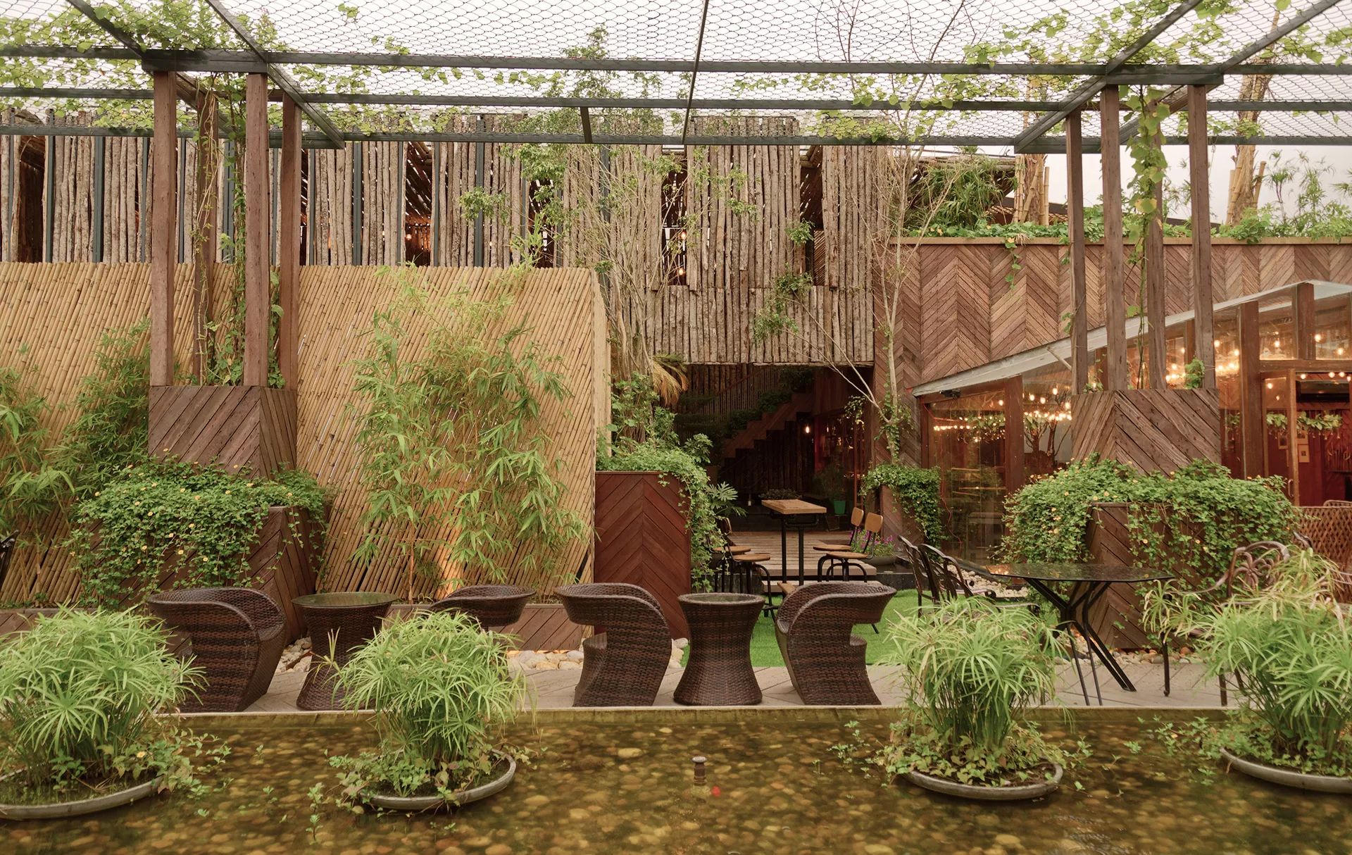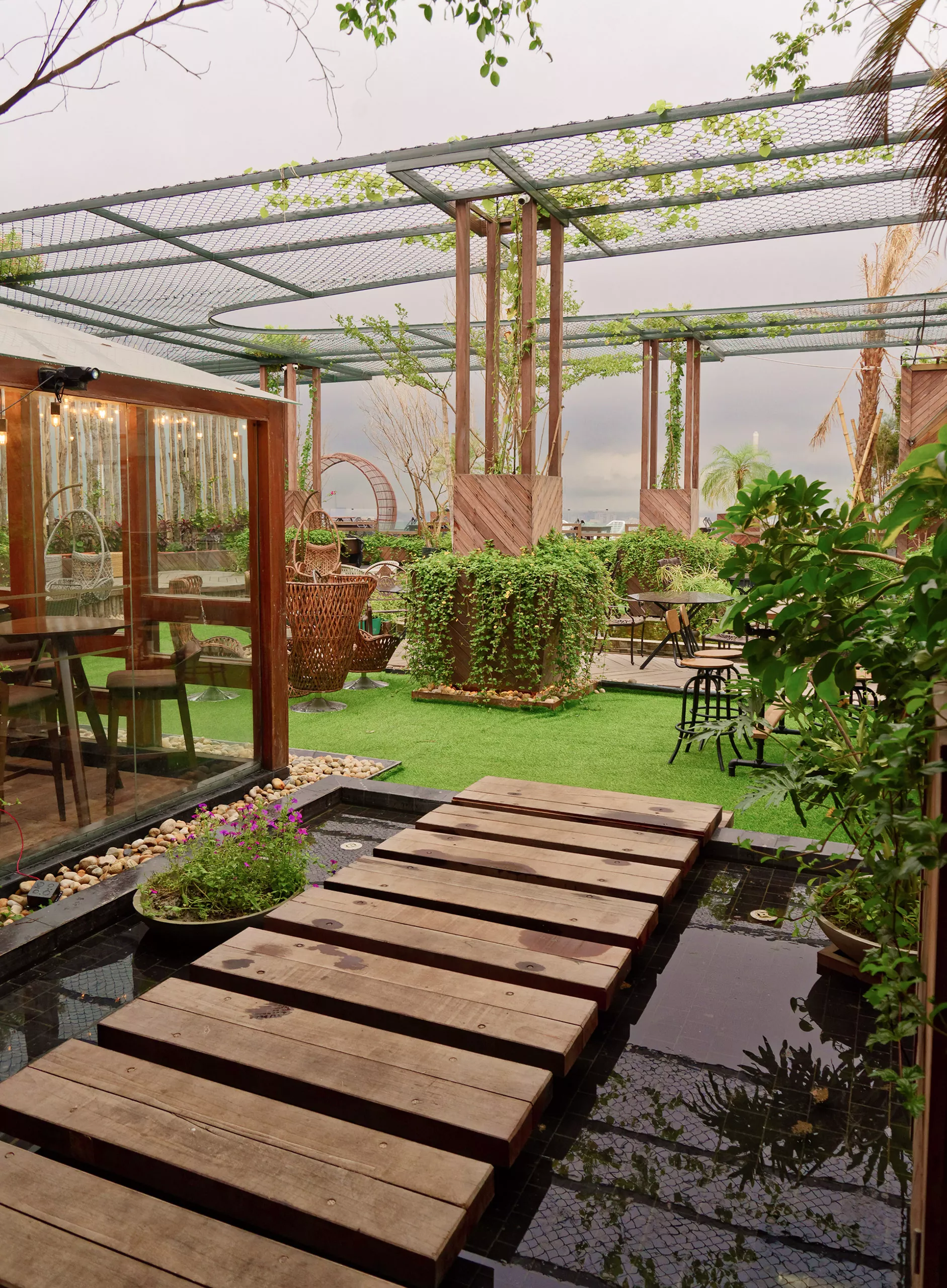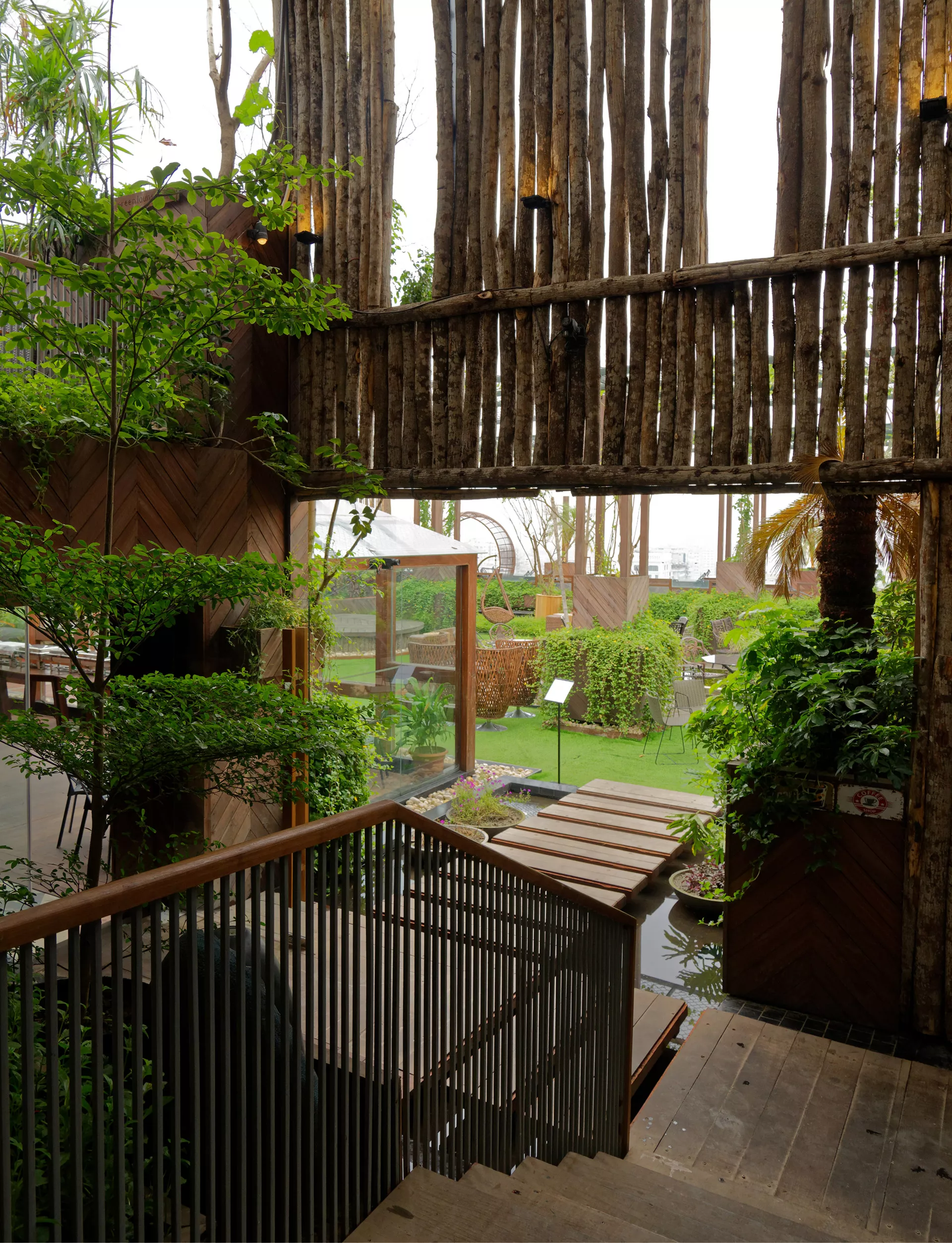 Facing west, the rooftop includes a tall tree-trunk wall and live trees to mitigate solar gain. A large semi-transparent green canopy made from MS mesh diffuses light and casts dynamic shadows, creating a sense of enclosure without severing visual openness. Passive cooling is supported through cross-ventilation between indoor and outdoor zones.