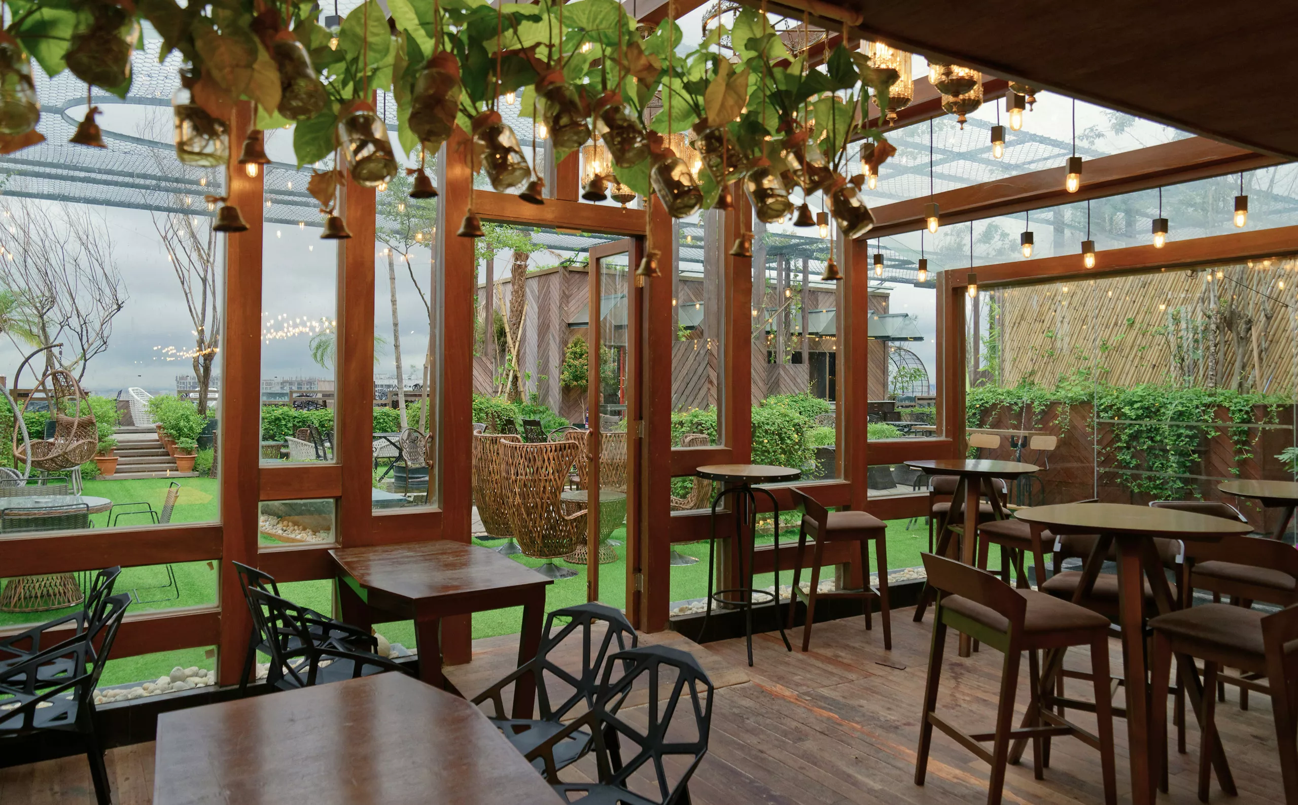 Floor-to-ceiling glazing frames the lush surroundings, maximizing natural light and forging a connection between interior and exterior. Indoor spaces are enriched with rich wooden panelling and ceiling slats, providing warmth and texture, while pendant lighting introduces soft, ambient illumination. Subtle greenery and planters punctuate the interior, reinforcing a natural, biophilic ambiance throughout.