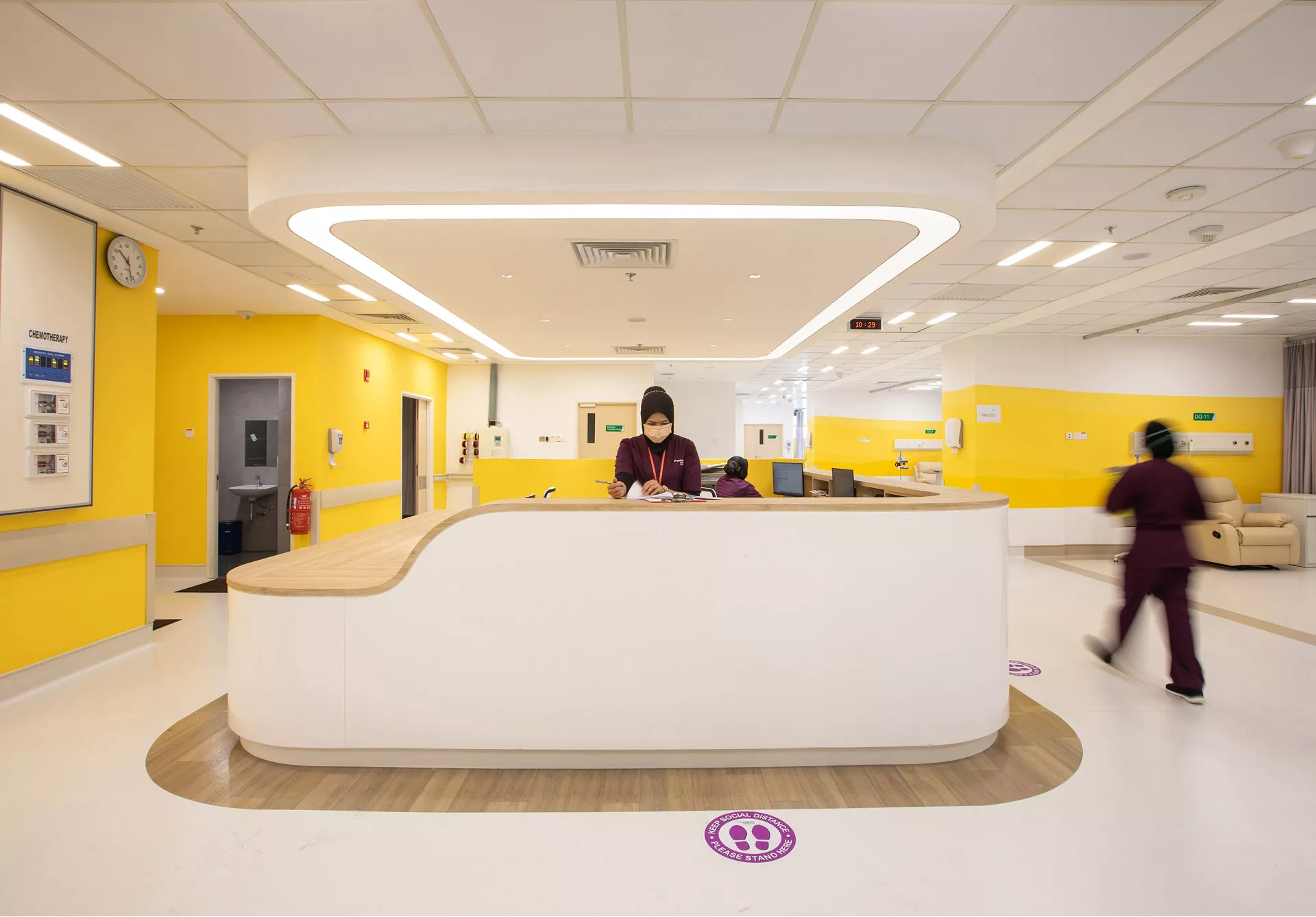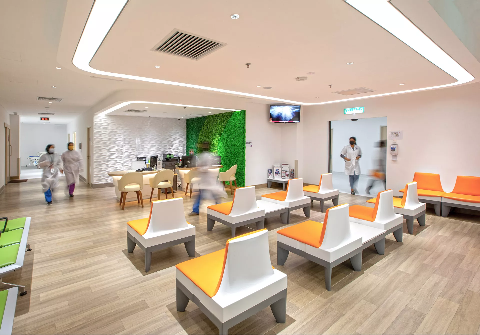 Color also plays a particularly nurturing role in the women’s and children’s wards. Soft tones, integrated with playful motifs drawn from the natural world — sun, bees, and garden-like landscapes — are used to gently offset the typically clinical aesthetic of a hospital, creating spaces that feel warm, reassuring, and connected. It’s an approach that makes color a vital design element in delivering both comfort and care.