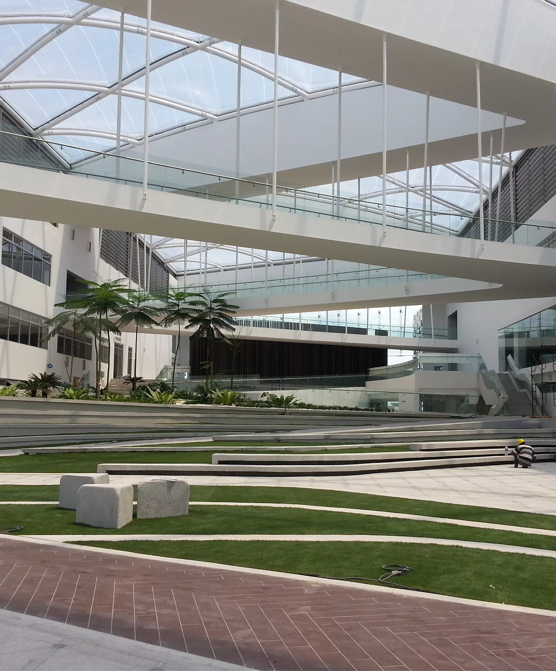 An innovative ETFE roof structure spans the four-storey courtyard, diffusing daylight evenly throughout the interior. This lightweight canopy provides weather protection and assists in thermal moderation, enabling the courtyard to function as an all-weather communal space. By filtering natural light and enhancing environmental comfort, the ETFE system becomes a defining architectural feature that supports the campus’s openness and energy-efficient intent.