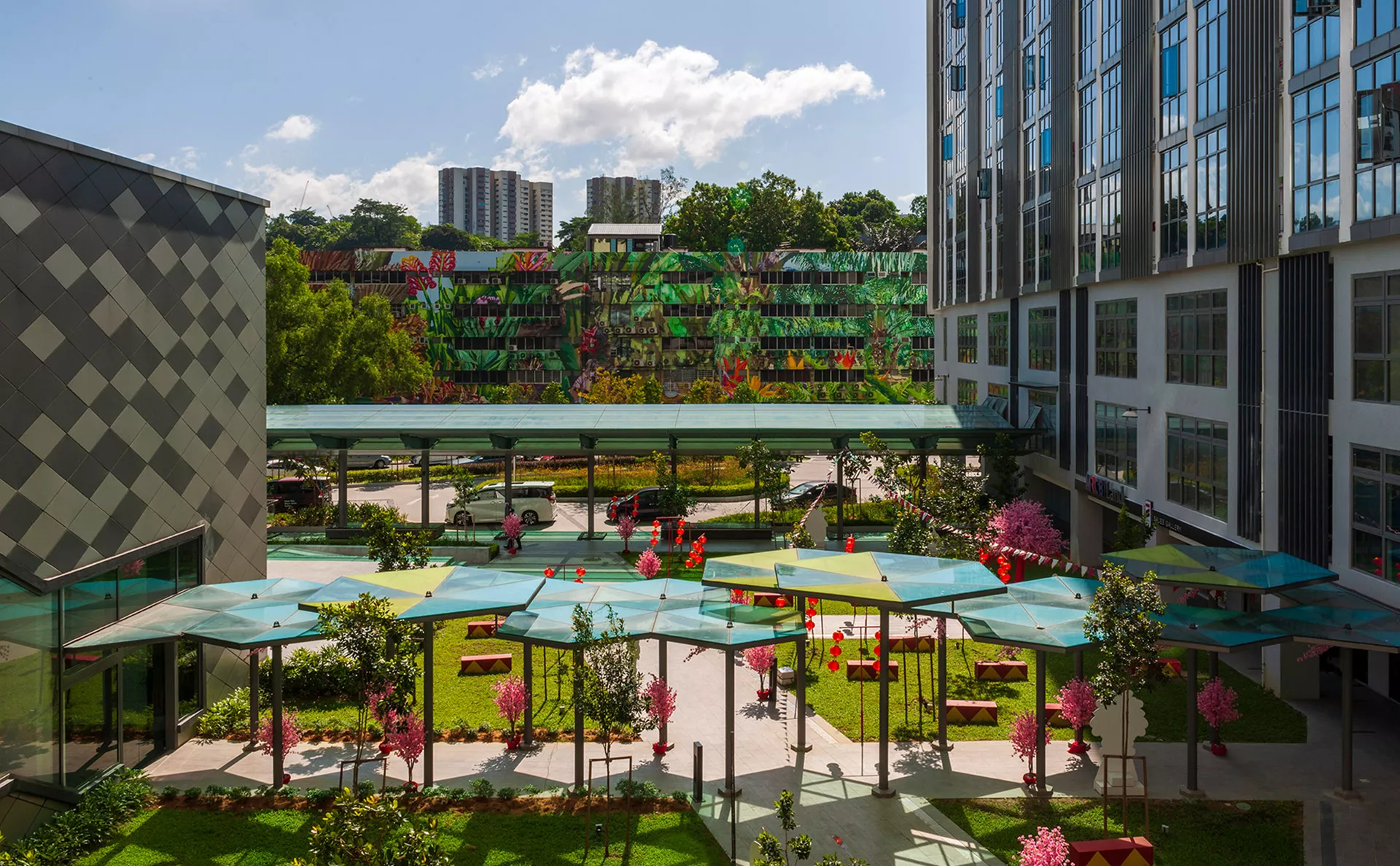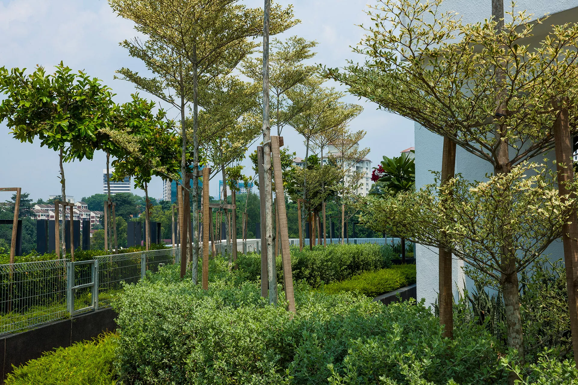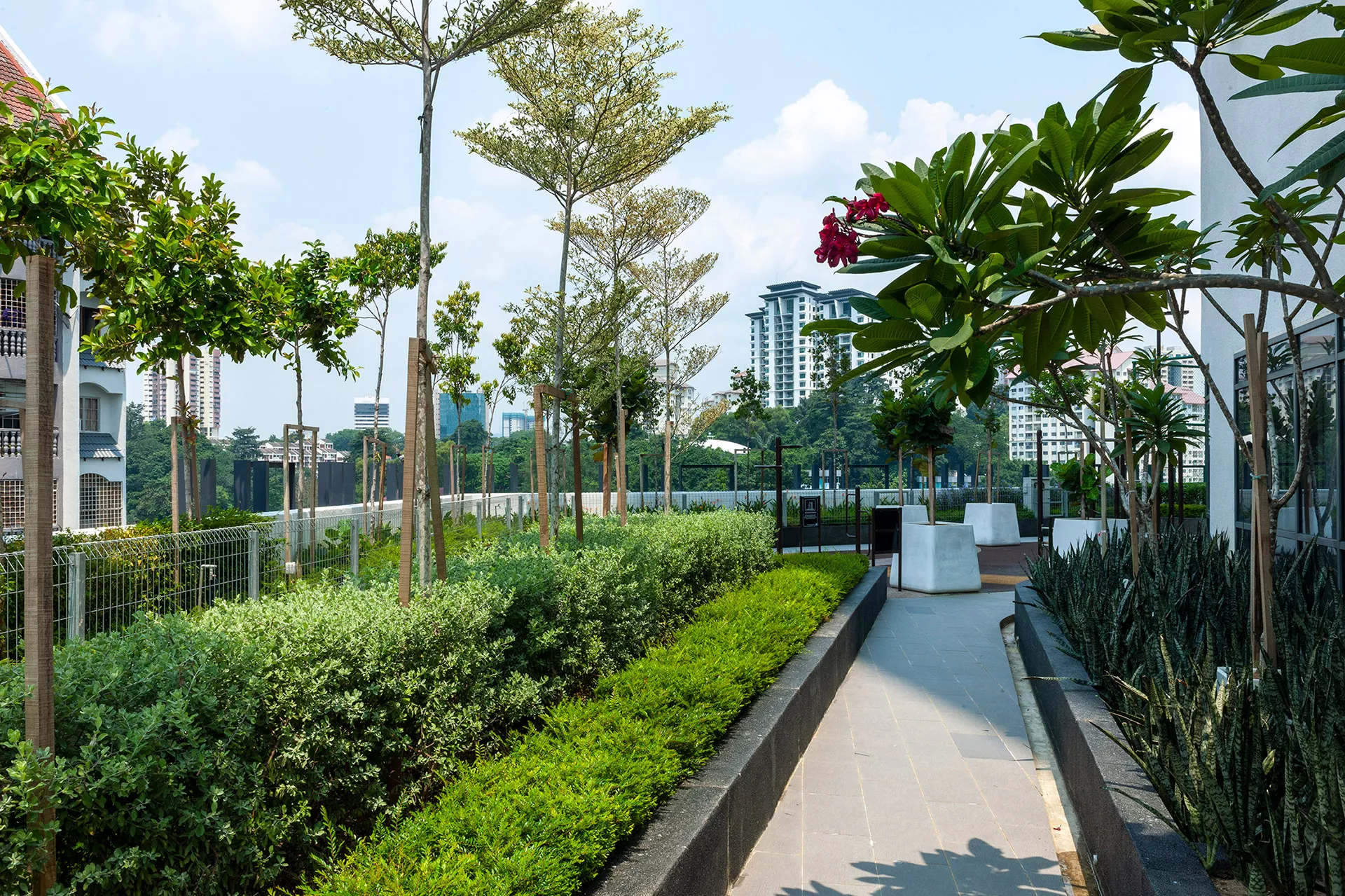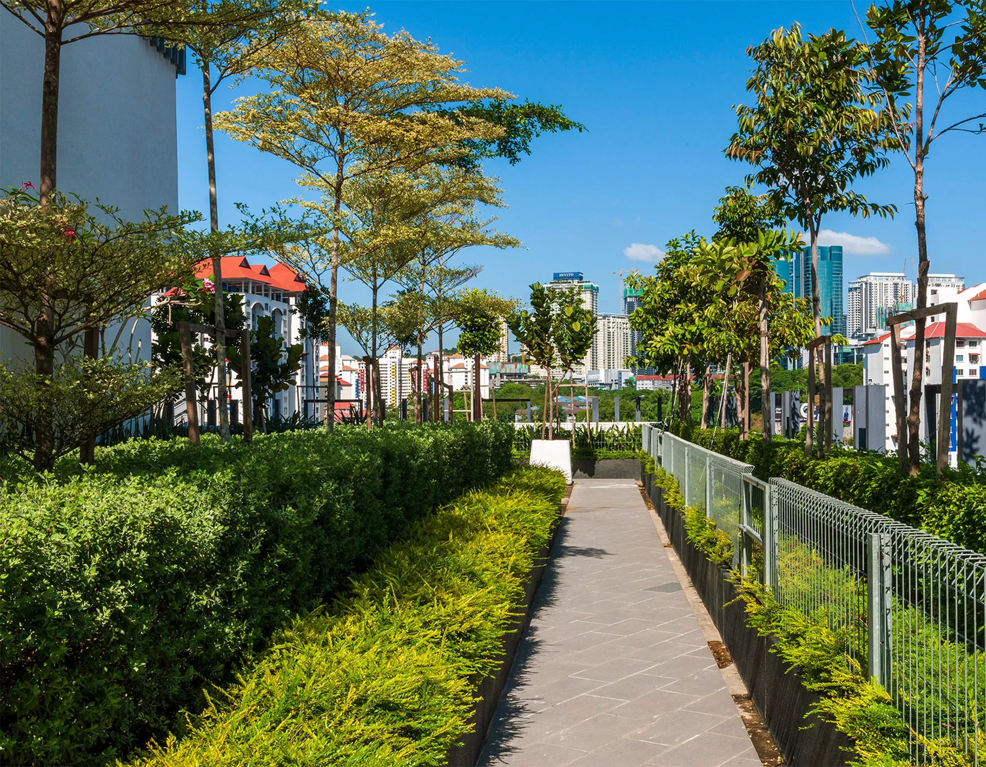 Signature features of VIVO Residensi include a welcoming drop-off area with a striking water feature, reflective pond cooling zones flanking the travellator, expansive open lawns shaded by trees, a canopy-covered walkway linking blocks, and a maze garden that encourages child-parent exploration. Outdoor fitness spaces, children’s playgrounds, putting greens, sky gardens, and jogging tracks further elevate the residential experience.