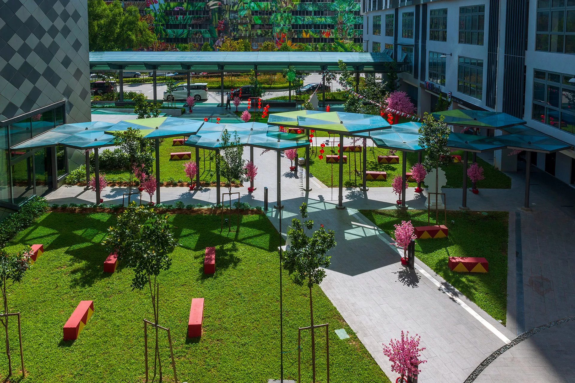 The reimagined design transcends conventional perimeter planting and standard drop-off zones by introducing vibrant outdoor amenities and visually impactful spaces. The new landscape concept—modern Landscape as green & blue nodes—features interconnected recreational areas designed to promote wellness, social interaction, and connection with nature.