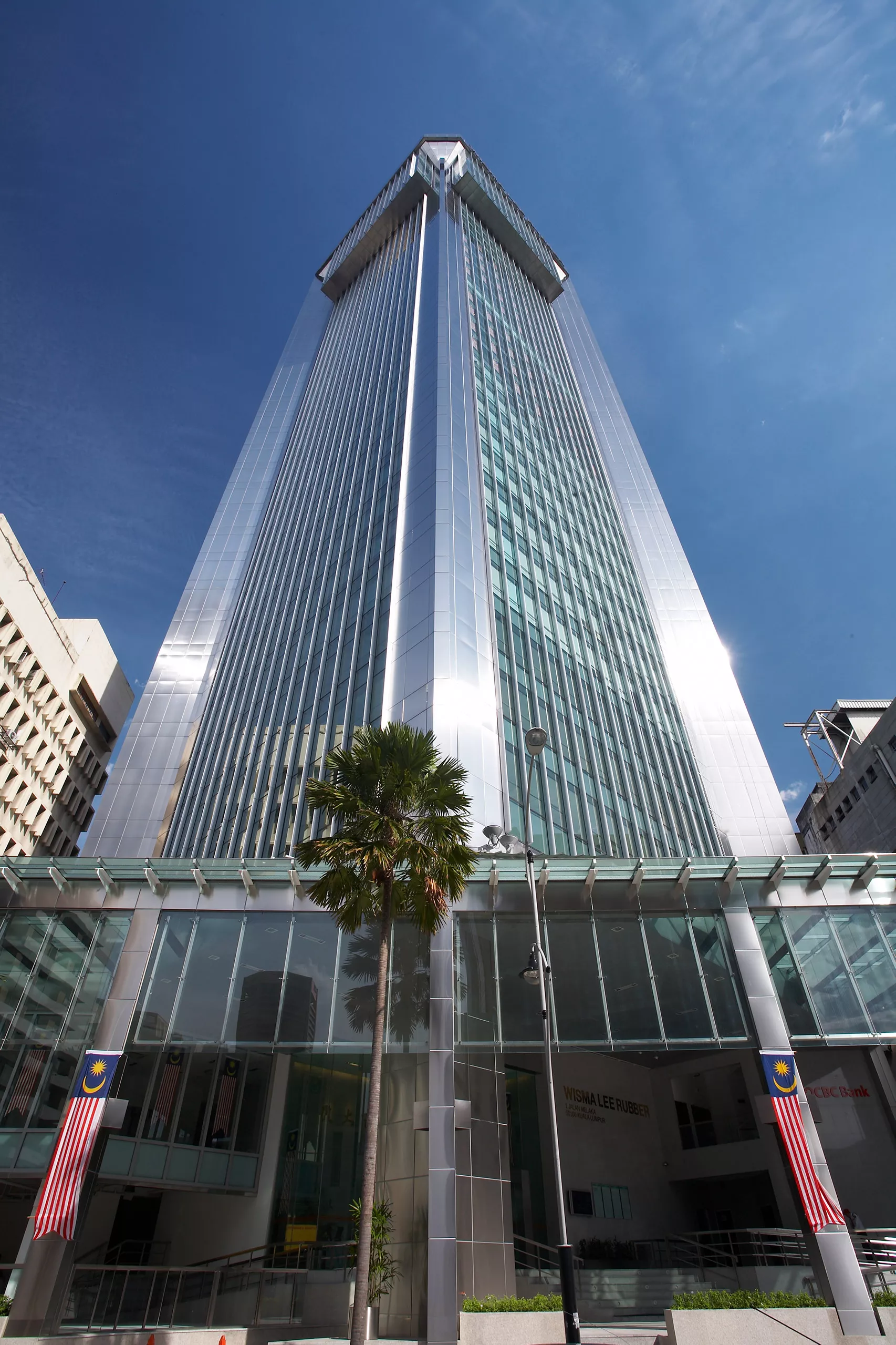 The refurbishment of Wisma Lee Rubber, a 29-storey commercial tower in Kuala Lumpur’s historic business district, reinterprets a late-1980s International Style building through a process of formal clarification and contemporary rearticulation. Originally conceived as an extruded rectilinear volume defined by expressed vertical bracing and pronounced horizontal floor plates, the new design sought to simplify and refine the building’s architectural language.