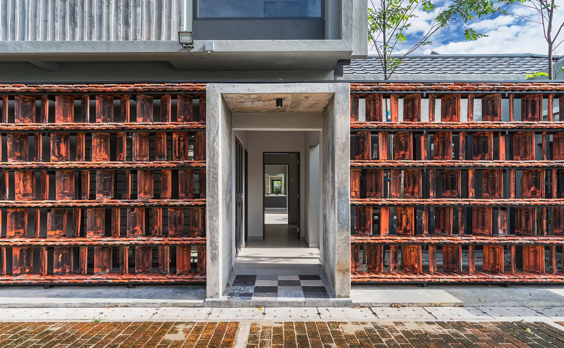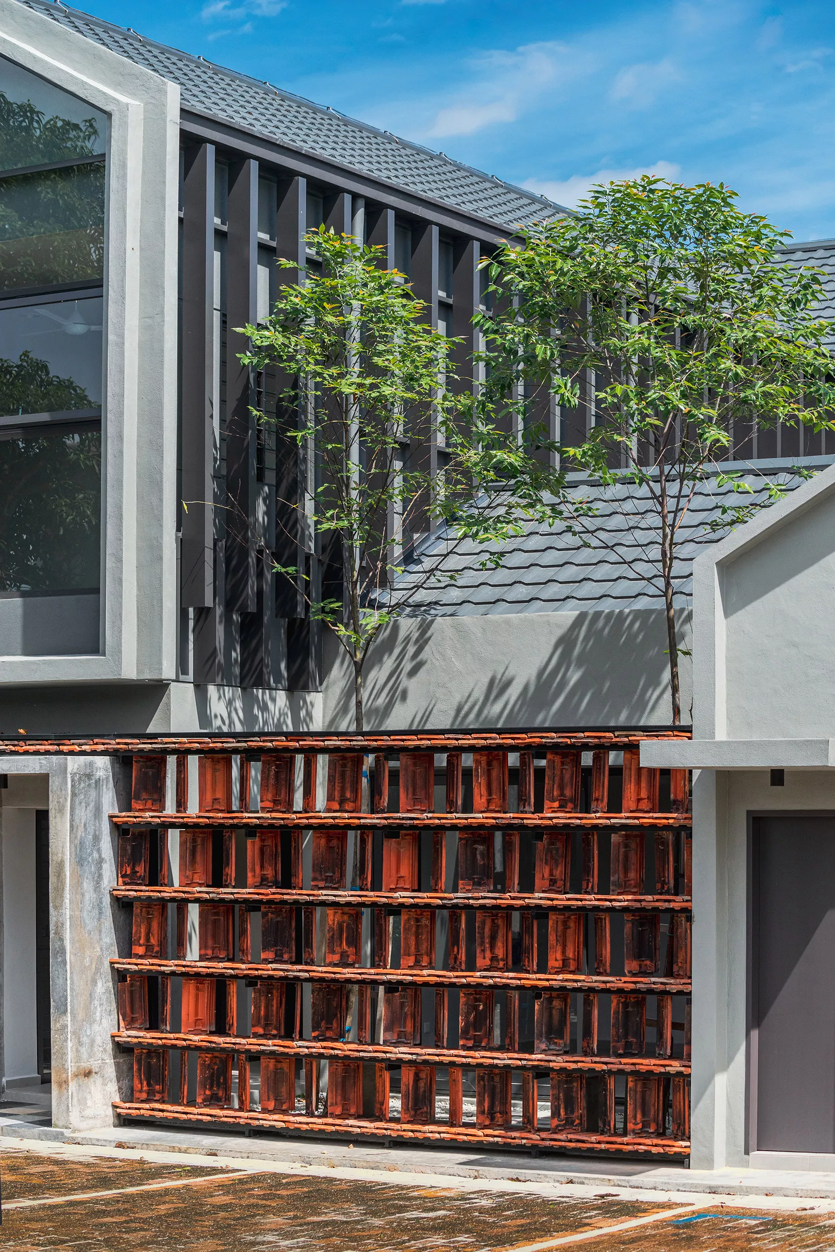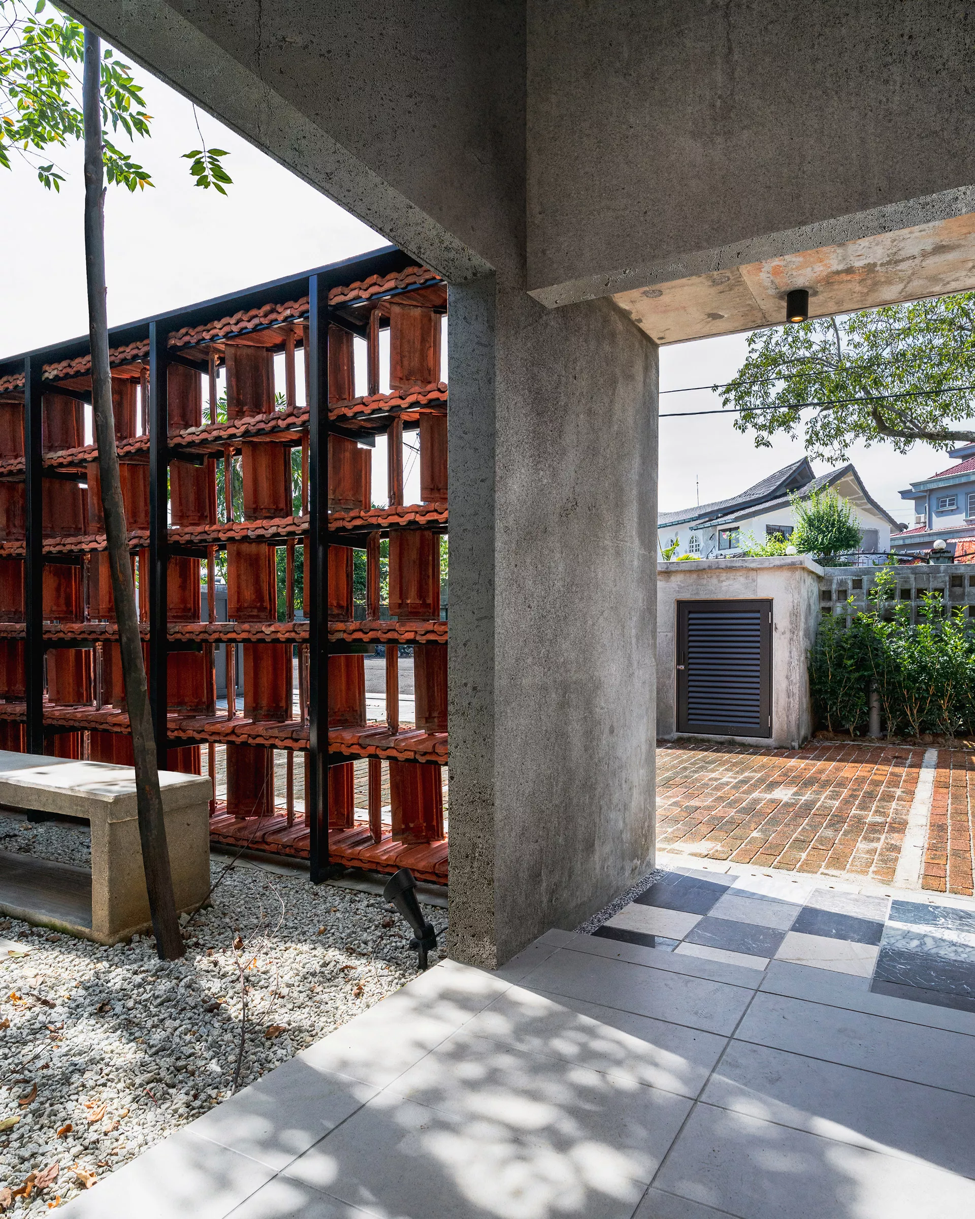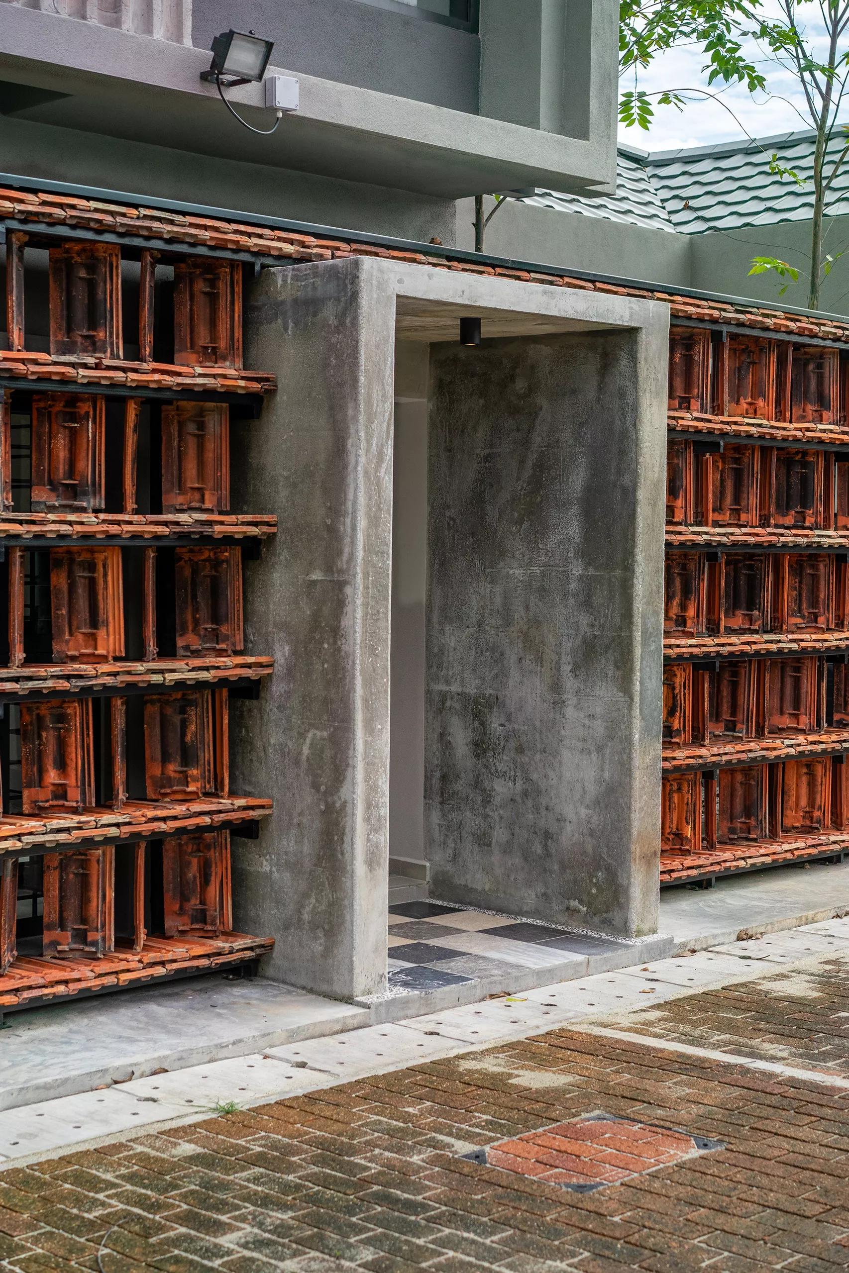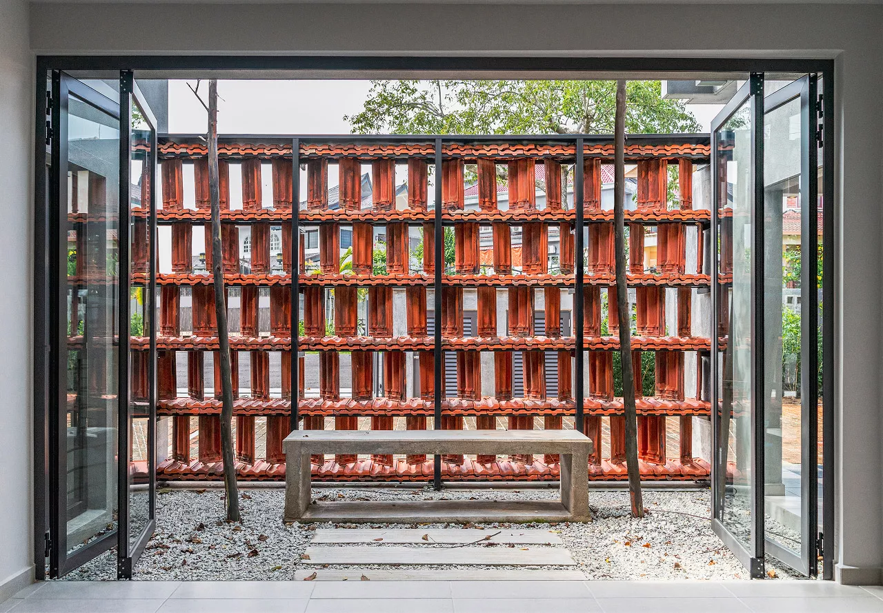Working within a modest budget, the project embraces material reuse and upcycling as a purposeful design ethic. Rejected porcelain tiles, sample marble slabs, surplus sanitary fittings, and salvaged burnt roof tiles are reintroduced throughout the building. For example, the salvaged roof tiles are upcycled into a distinctive interior screen wall that provides both protection and symbolism.