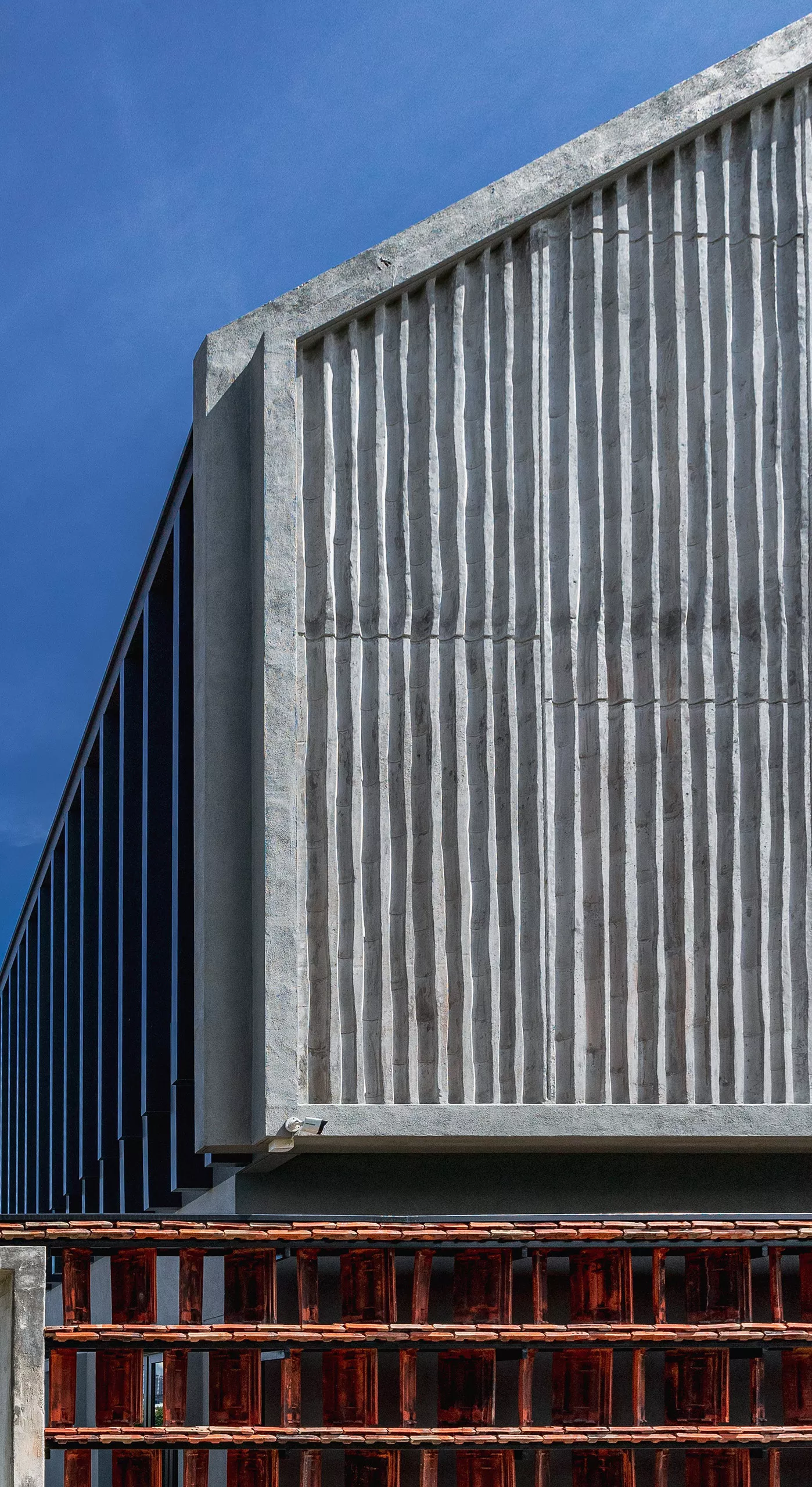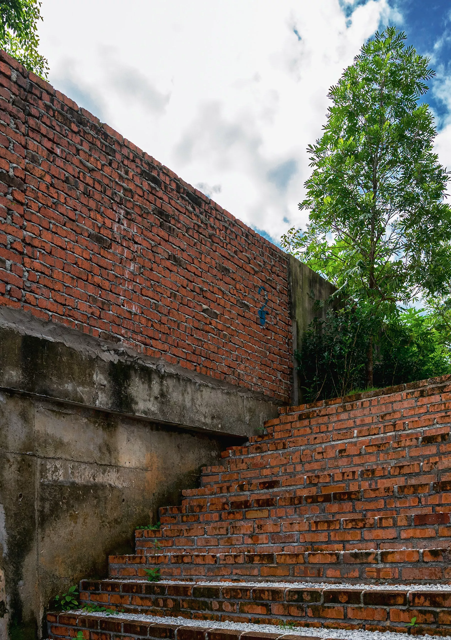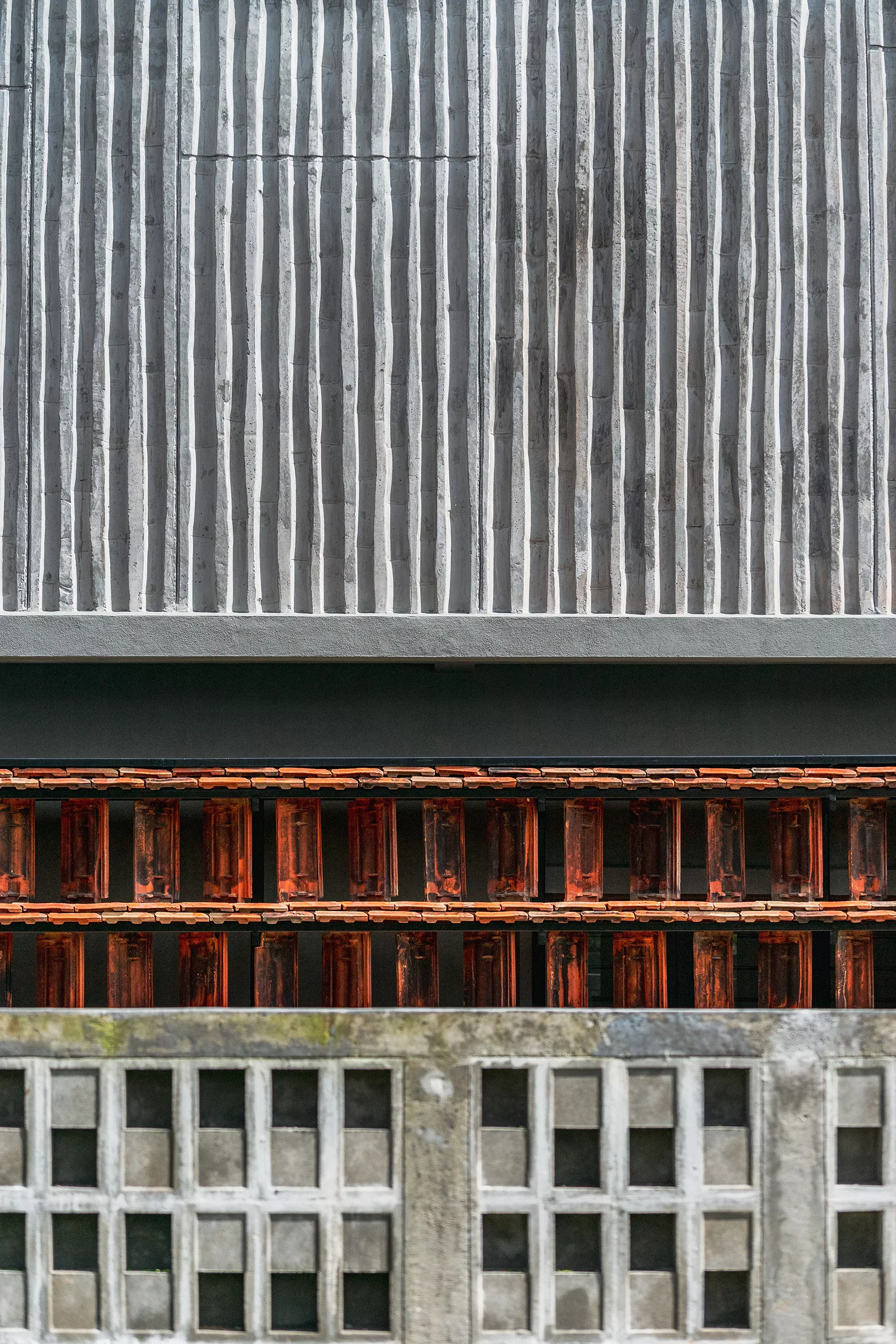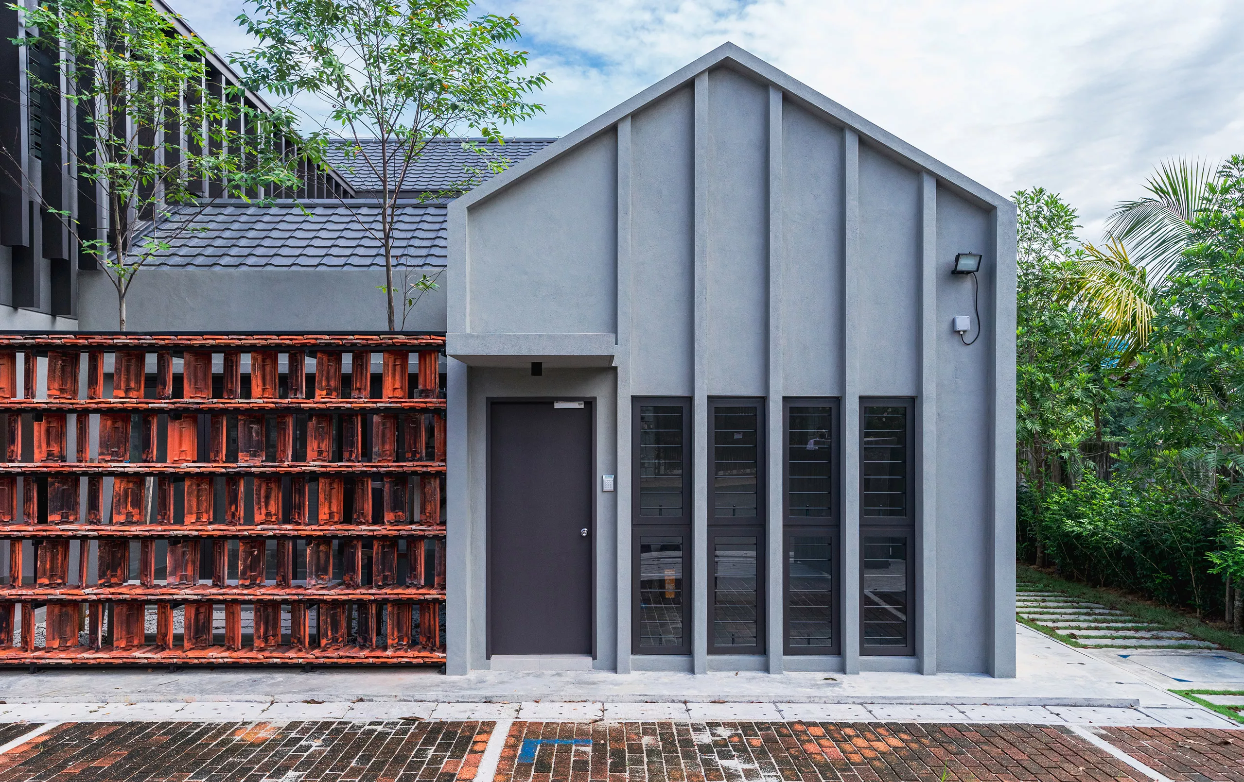 Working within a modest budget, the project embraces material reuse and upcycling as a purposeful design ethic. Rejected porcelain tiles, sample marble slabs, surplus sanitary fittings, and salvaged burnt roof tiles are reintroduced throughout the building. For example, the salvaged roof tiles are upcycled into a distinctive interior screen wall that provides both protection and symbolism.