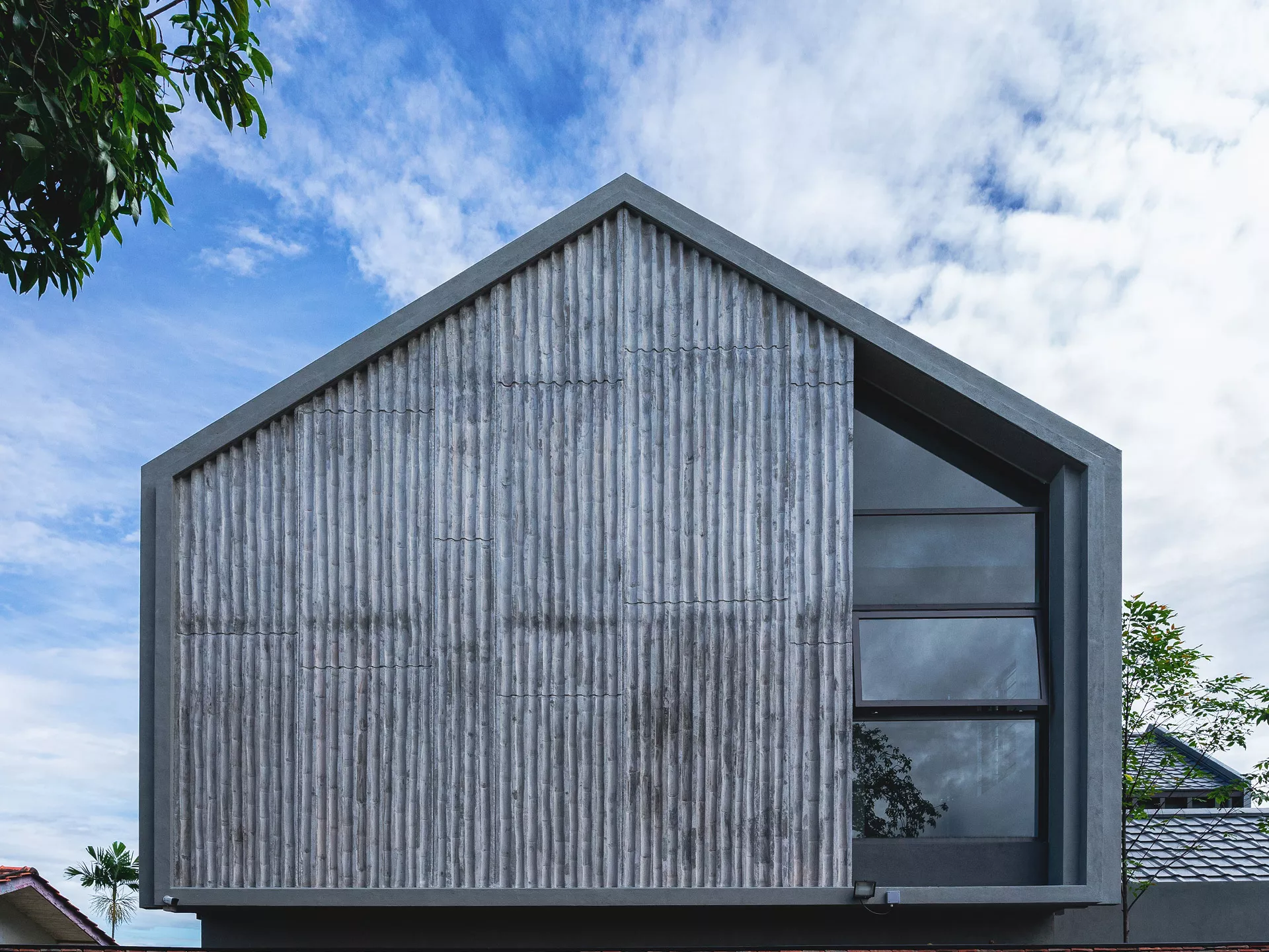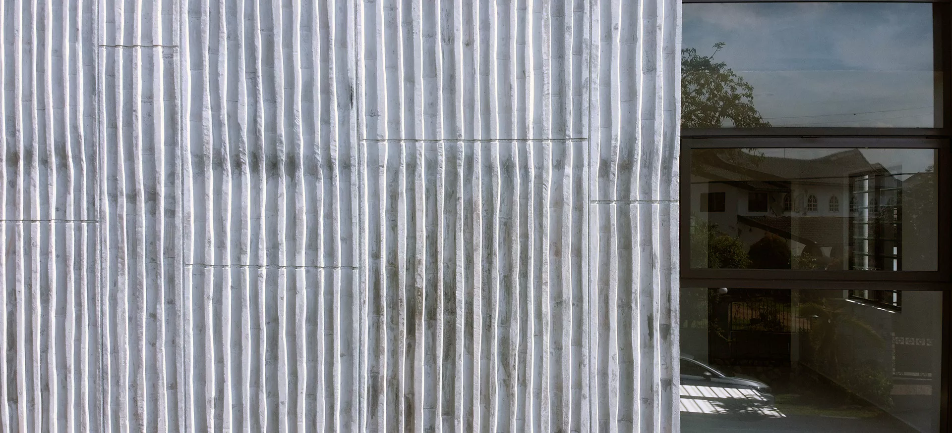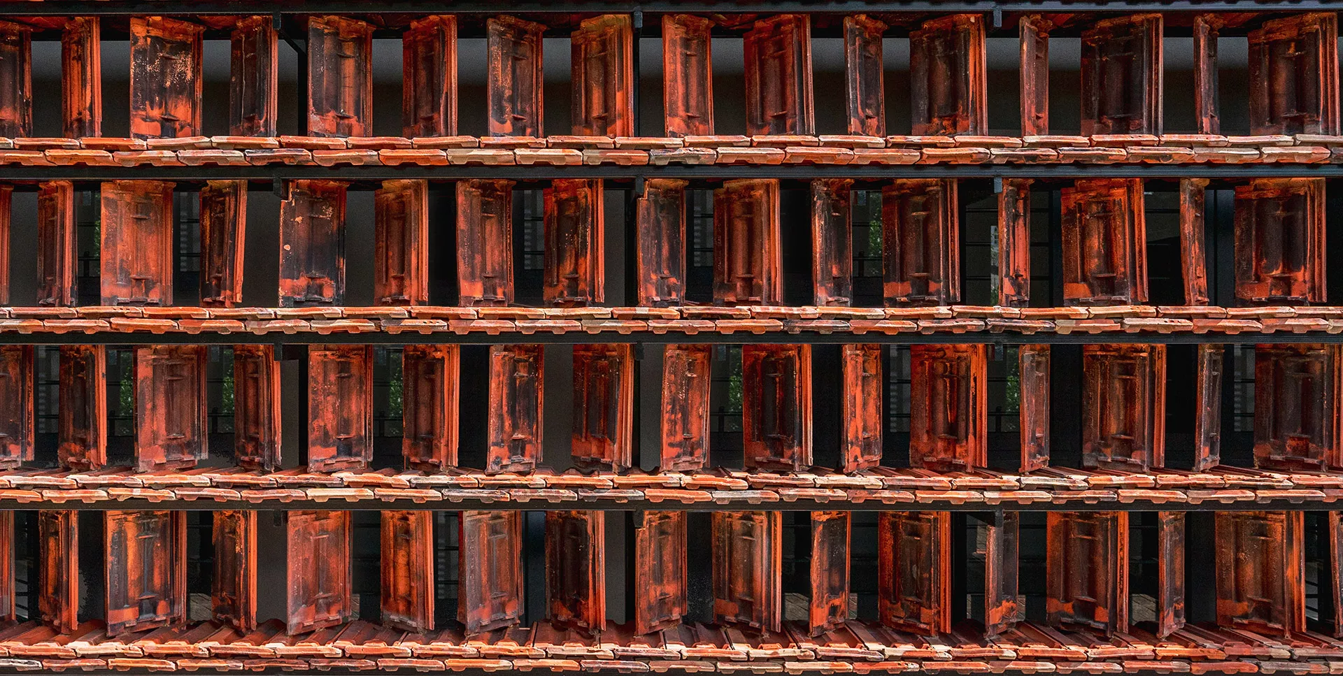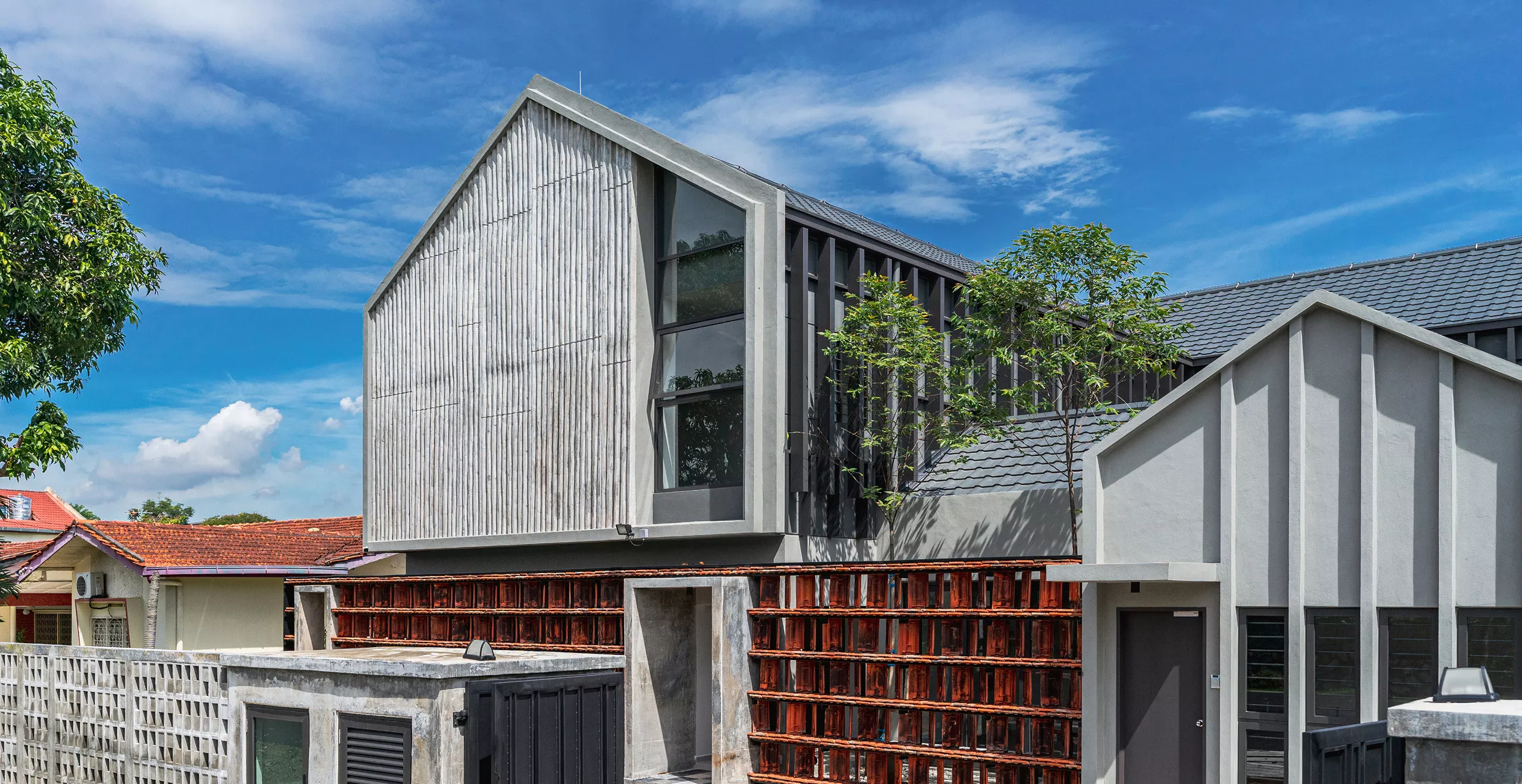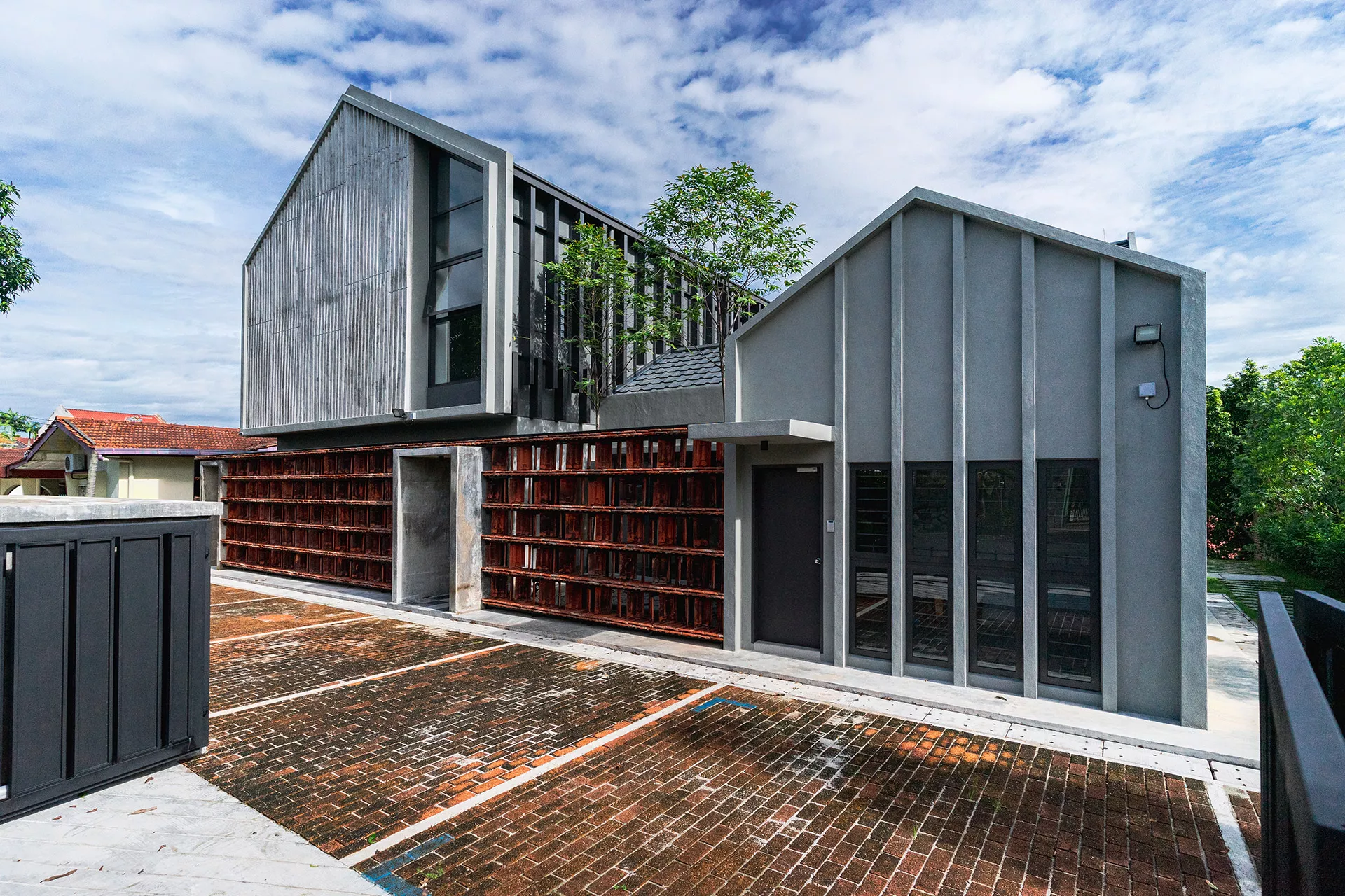 Working within a modest budget, the project embraces material reuse and upcycling as a purposeful design ethic. Rejected porcelain tiles, sample marble slabs, surplus sanitary fittings, and salvaged burnt roof tiles are reintroduced throughout the building. For example, the salvaged roof tiles are upcycled into a distinctive interior screen wall that provides both protection and symbolism.