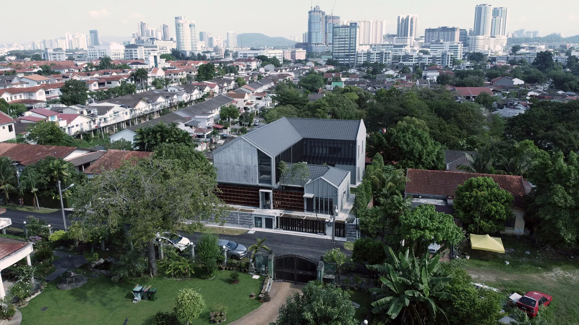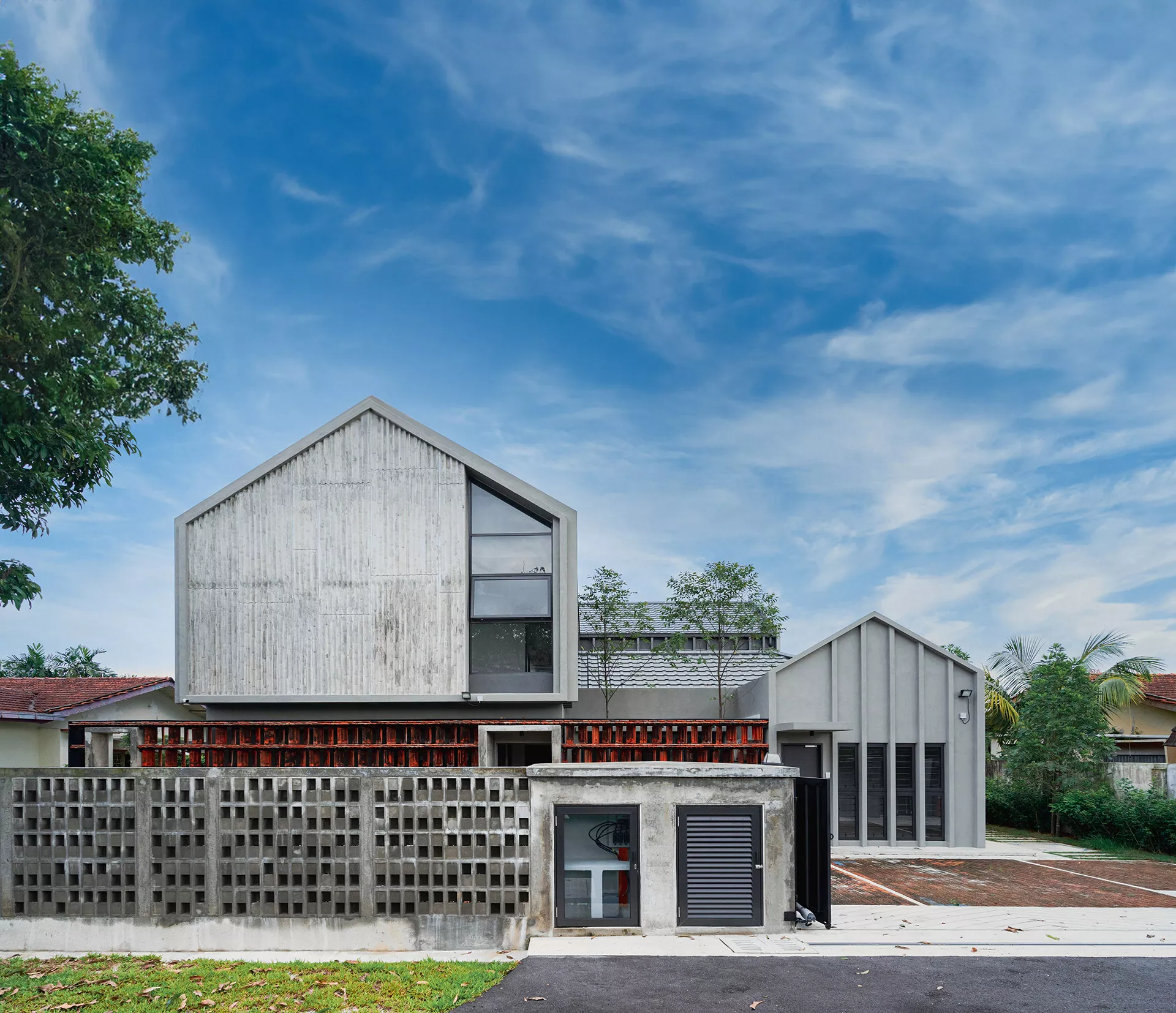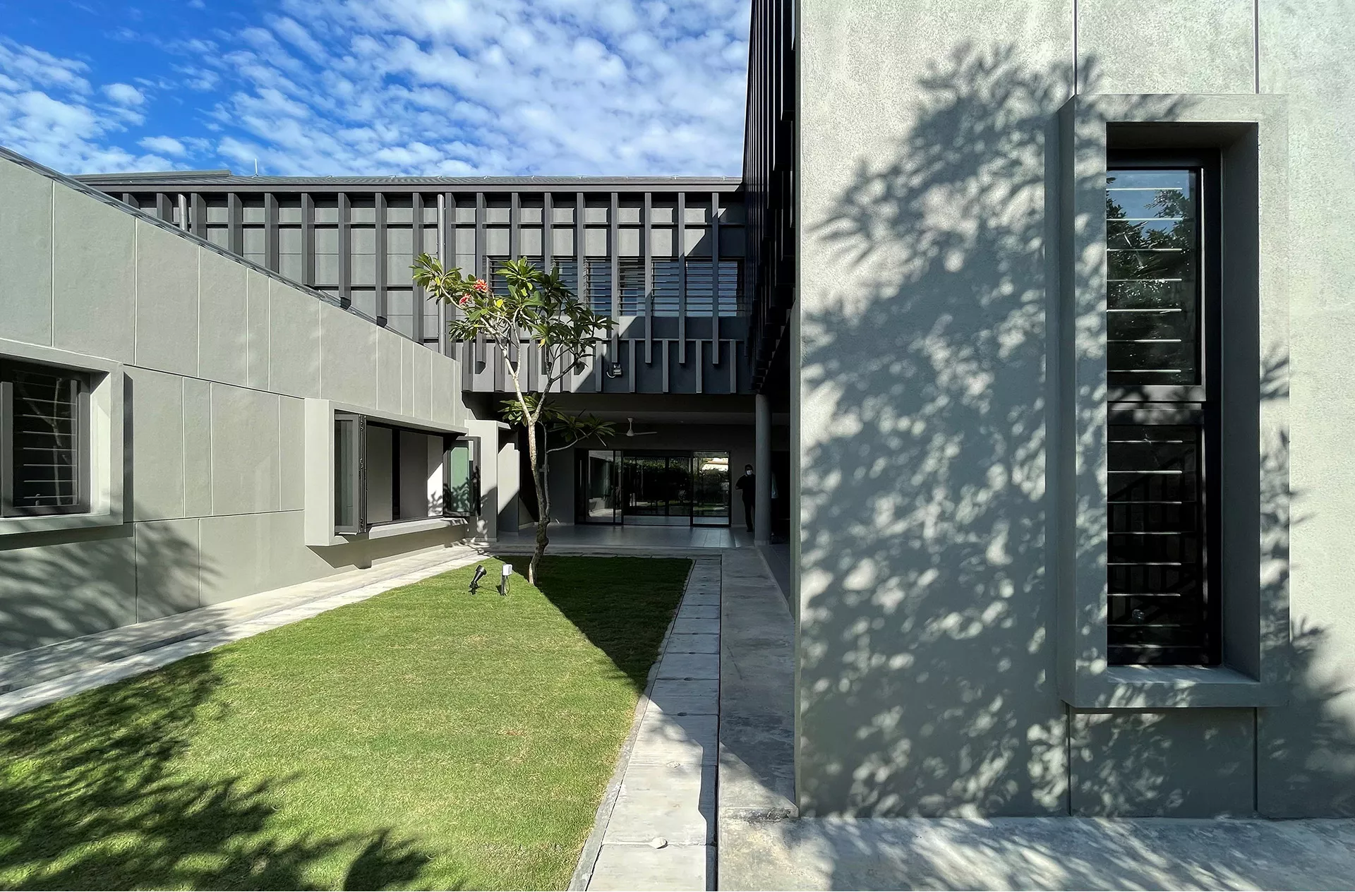The design preserves portions of the original structure to house administrative functions, while new two-storey annexes accommodate residential zones. These components are organized around a shared central courtyard that acts as the social and environmental heart of the home. The planning prioritizes passive design principles, with building orientation optimized to maximize daylight while minimizing solar heat gain. Large openings at ground level are tempered through cross ventilation, convective airflow, and permeable screen walls, ensuring thermal comfort in a tropical climate.